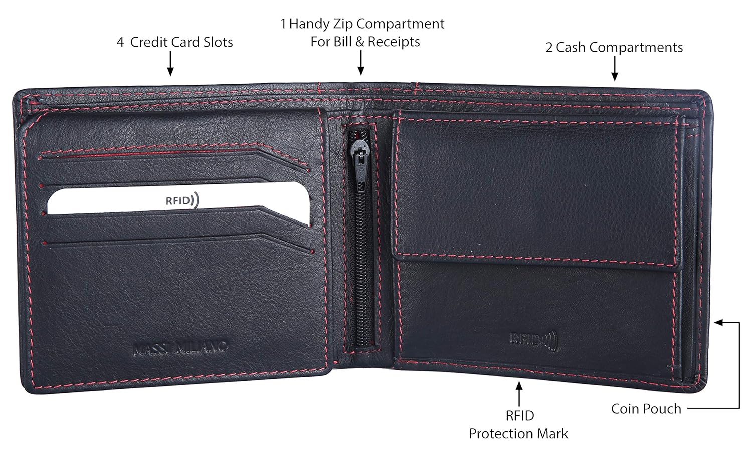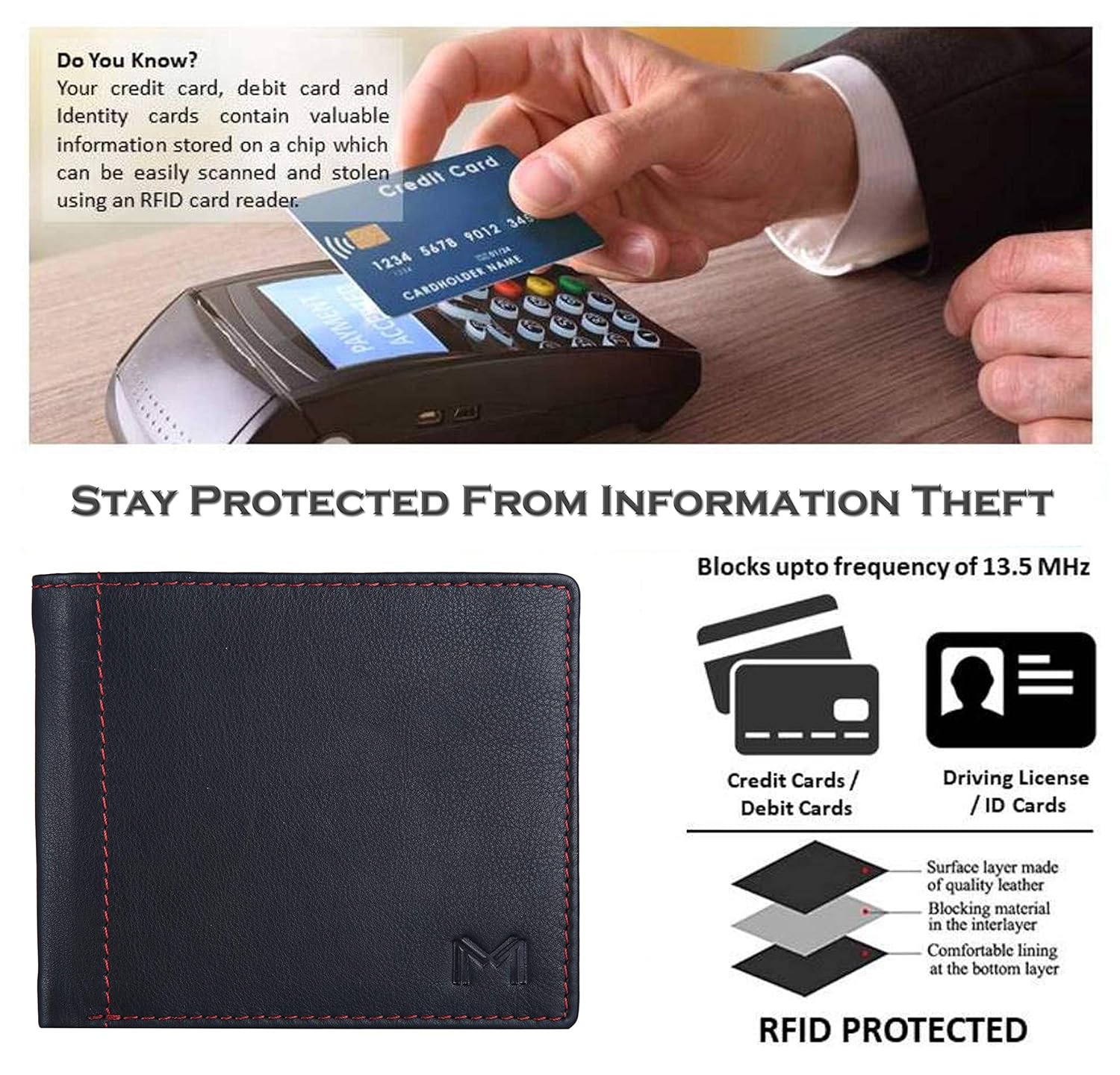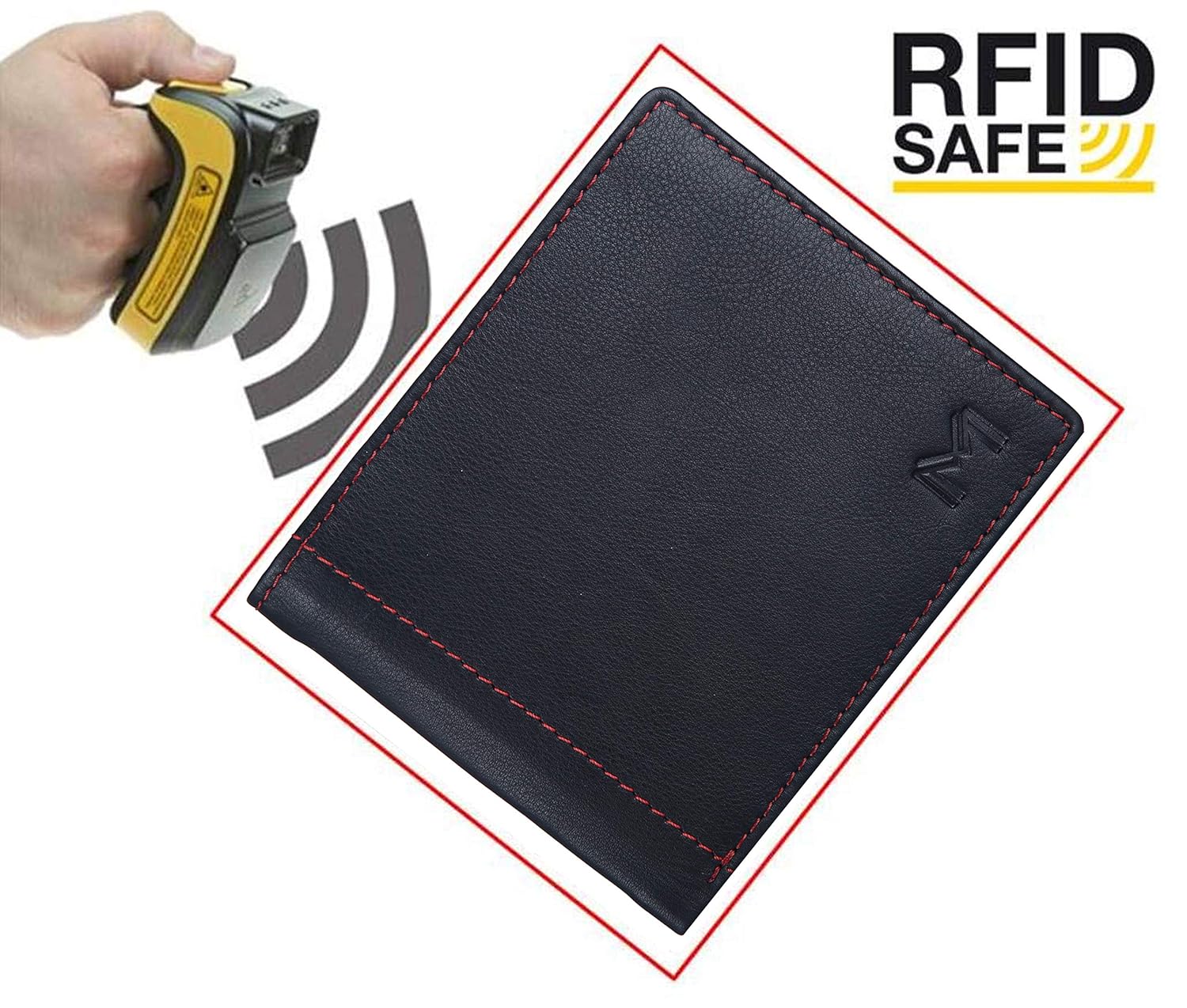 > RFID PROTECTED - The wallet can protect the cards inside from unauthorised scanning and information theft by blocking radio waves upto a frequency of 13.5 MHz. Each wallet has been individually tested and marked 'RFID'.