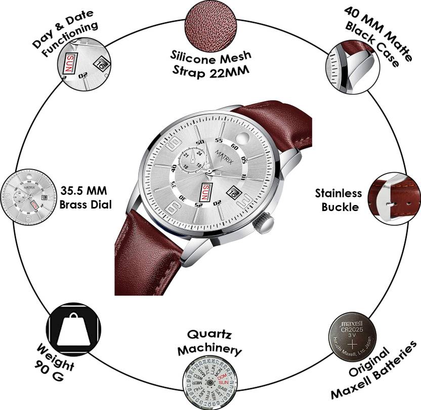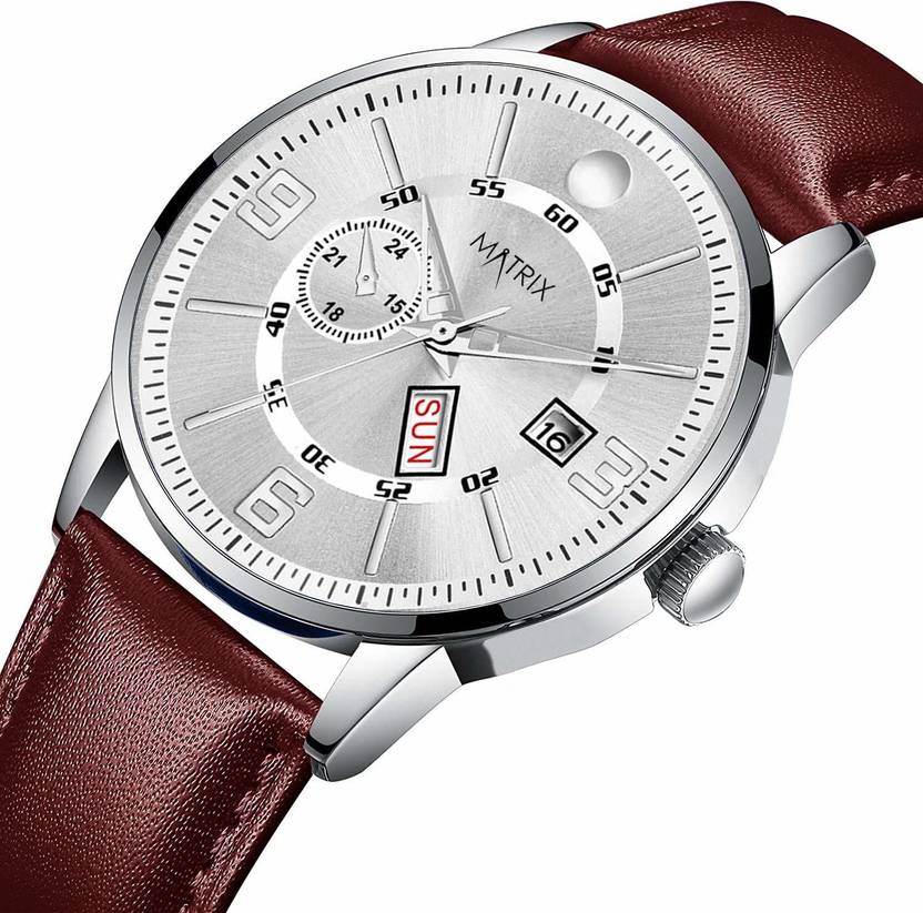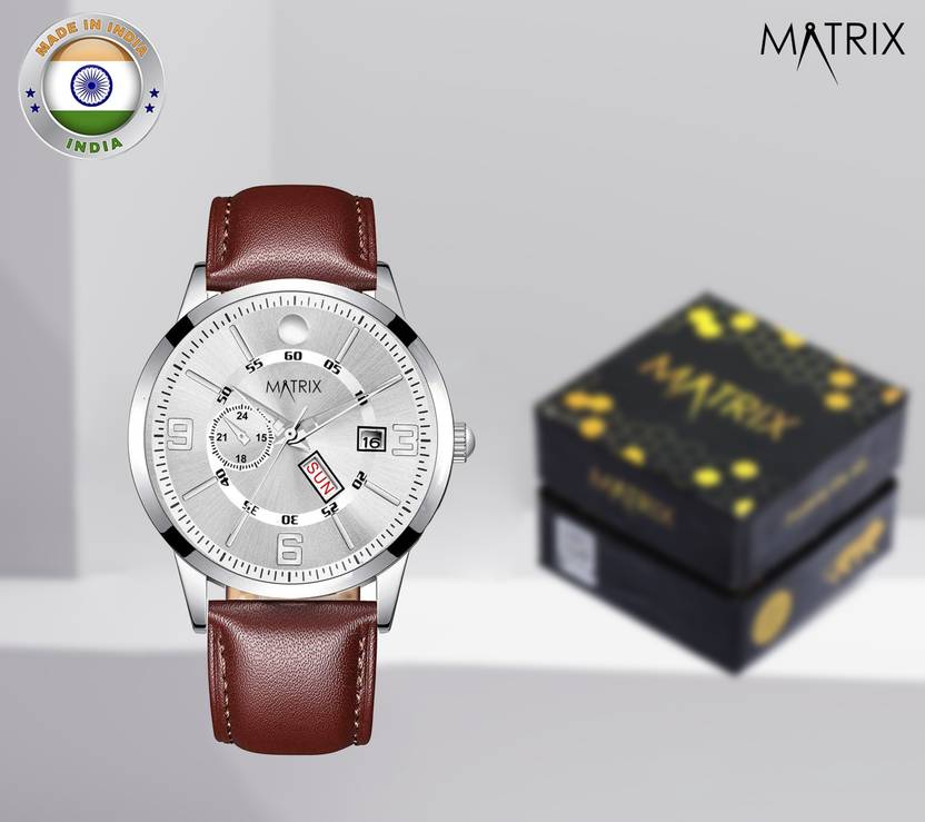 Matrix Timepiece, A Unit of TURRANTBUY, Manufacturing & Assembling Wrist Watches Since 2010. With A Customer Base of More Than 20 Lakh, Matrix Served Customer Best In Class & Quality Products Within Affordable Price Range All Over India. Matrix Watch Has A Onboard Feature Of Day & Date Working With A Japanese Quartz Movement, Powered From Maxel Original Battries. Housed In Stainless Steel Case, Brass Dial, Genuine Leather Strap, Stainless Steel Back & Buckle. Matrix Timepiece Watches Comes With A Water Resistant Durability Upto 3 ATM & Shock Proof Under Normal Circumstances.
