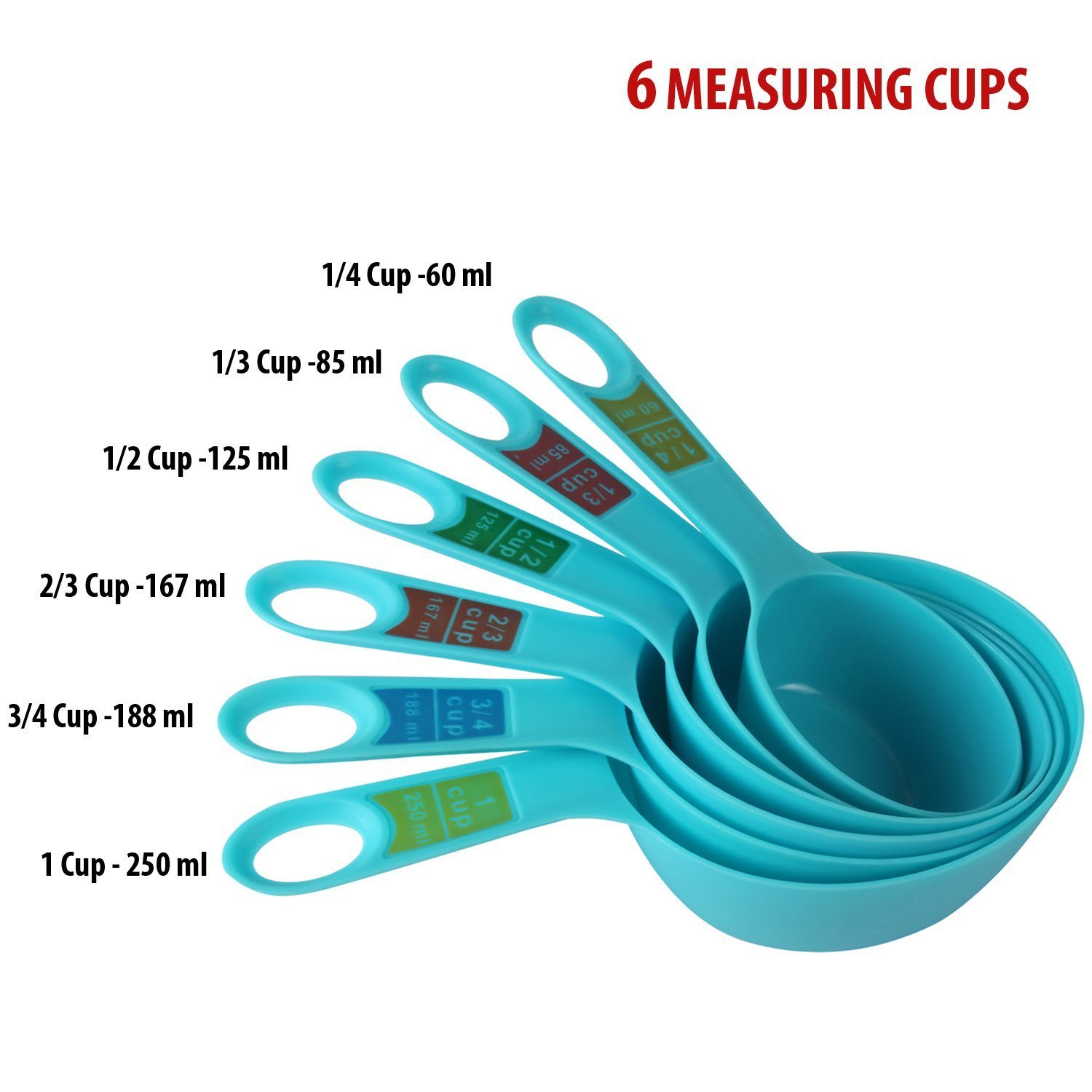 6 measuring cups - 1 cup (250Ml), 3/4 cup (188 Ml), 2/3 cup (167 Ml), 1/2 cup (125 Ml), 1/3 cup (85 Ml), 1/4 cup (60 Ml)