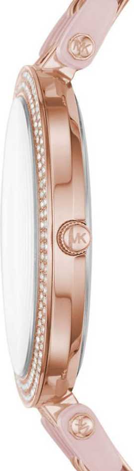 Rose gold tone stainless steel case with a rose gold-tone stainless steel and blush acetate bracelet. Fixed bezel. Rose gold dial with rose gold-tone hands and index hour markers. Dial Type: Analog. Quartz movement. Pull / push crown. Solid case back. Case size: 39 mm. Round case shape. Water resistant at 50 meters / 165 feet. Functions: hour, minute, second. Dress watch style. Michael Kors Darci Ladies Watch MK4327