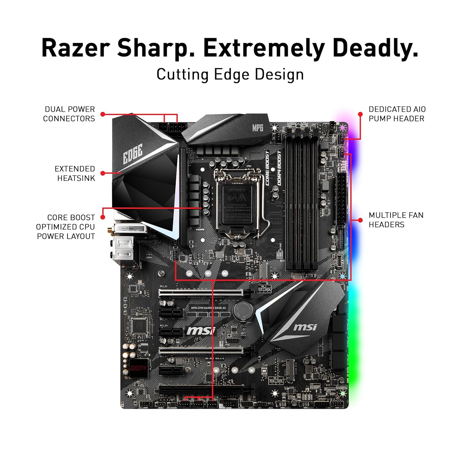 MSI Z390EDGEAC MPG Z390 GAMING edge AC LGA1151 (Intel 8th and 9th Gen) m.2 USB 3.1 Gen 2 DDR4 HDMI DP Wi-Fi SLI CFX ATX Z390 GAMING motherboard. Gaming motherboards offer the best possible gaming experience. Outsmart and outperform your opponents in-game using an array of unique MSI GAMING tools. Clever hardware & software tools, created to keep you one step ahead of the competition and boost your skills. This MSI gaming motherboard supports all the latest storage standards. This allows you to connect any ultra-fast storage device, giving you in-game benefits. Start games faster, load levels faster and have a real advantage over your enemies. |