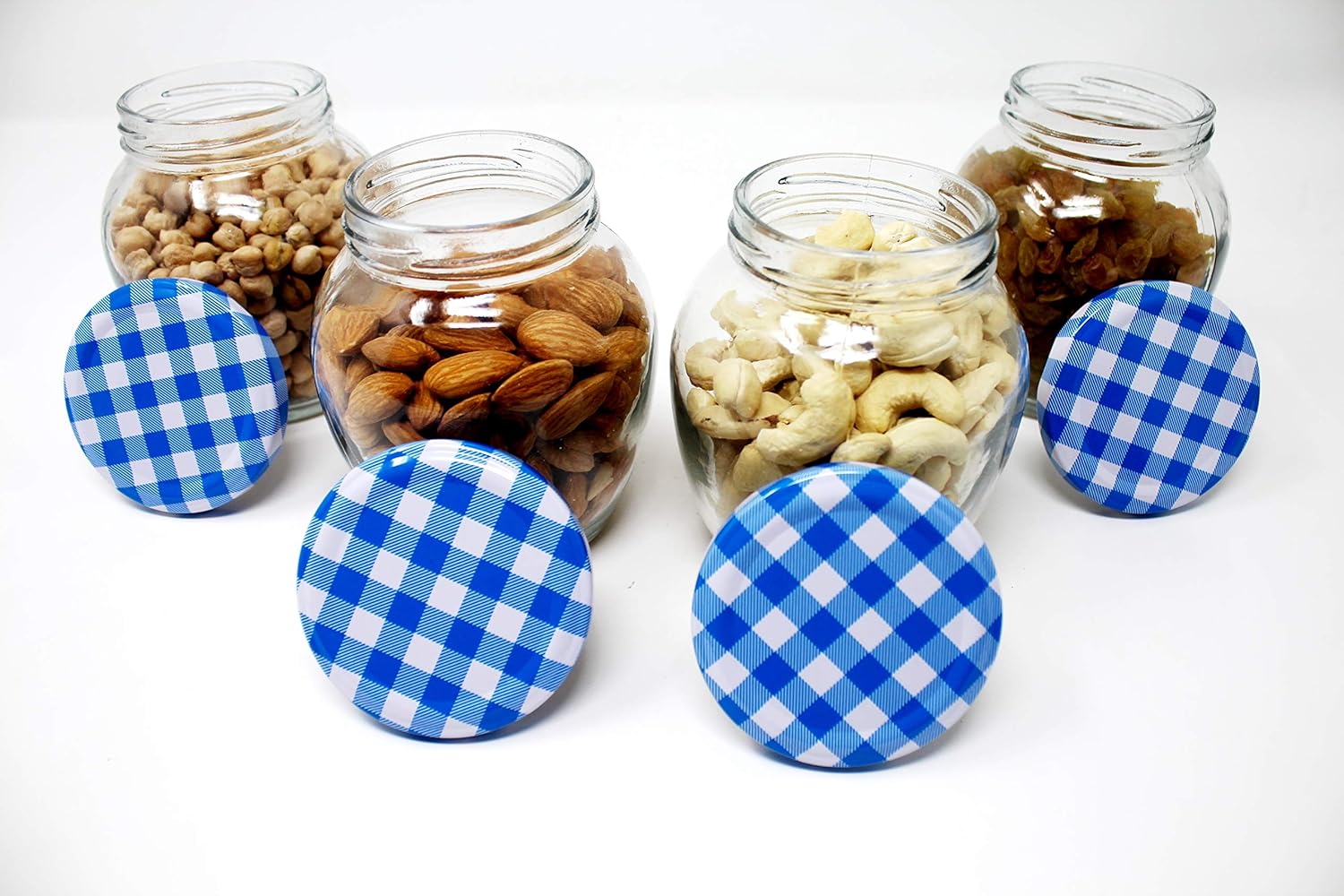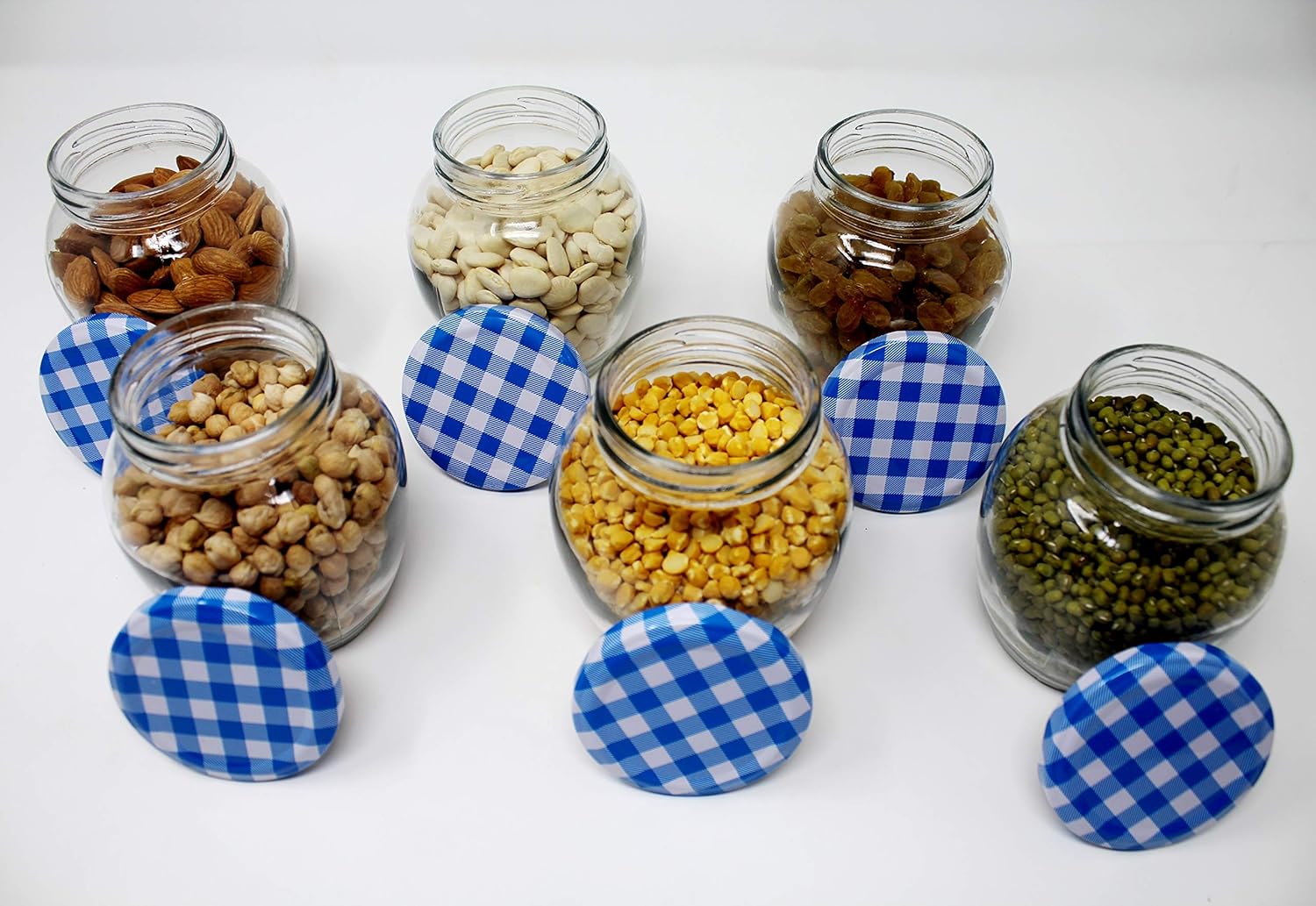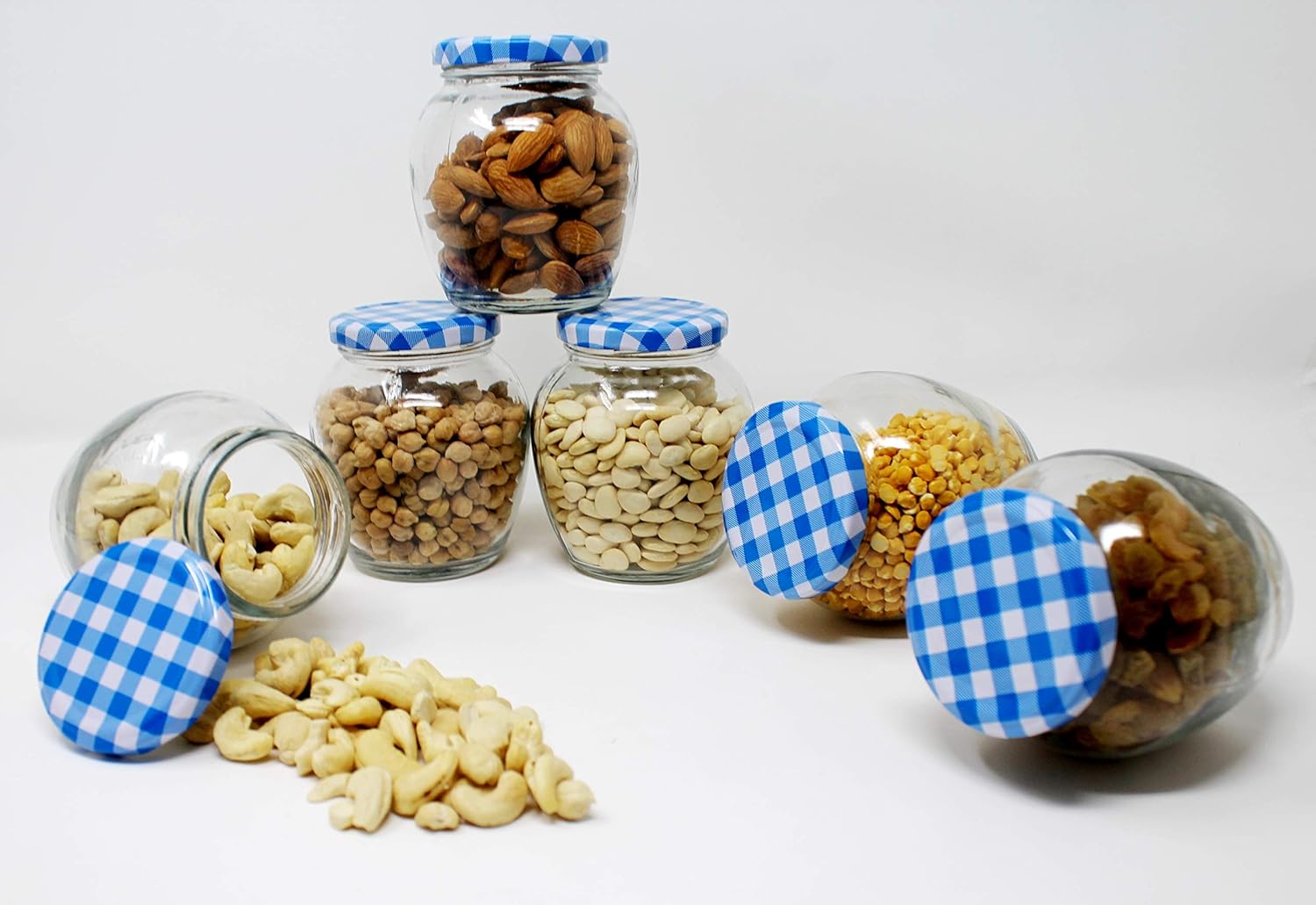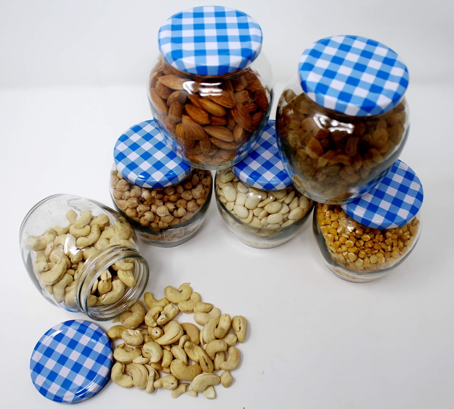 NATURE CARE ENTERPRISE Matka Style Glass Jars and Container for Storge Spices and Pickle { 400ml } Set of 6 (Blue Checks lid)