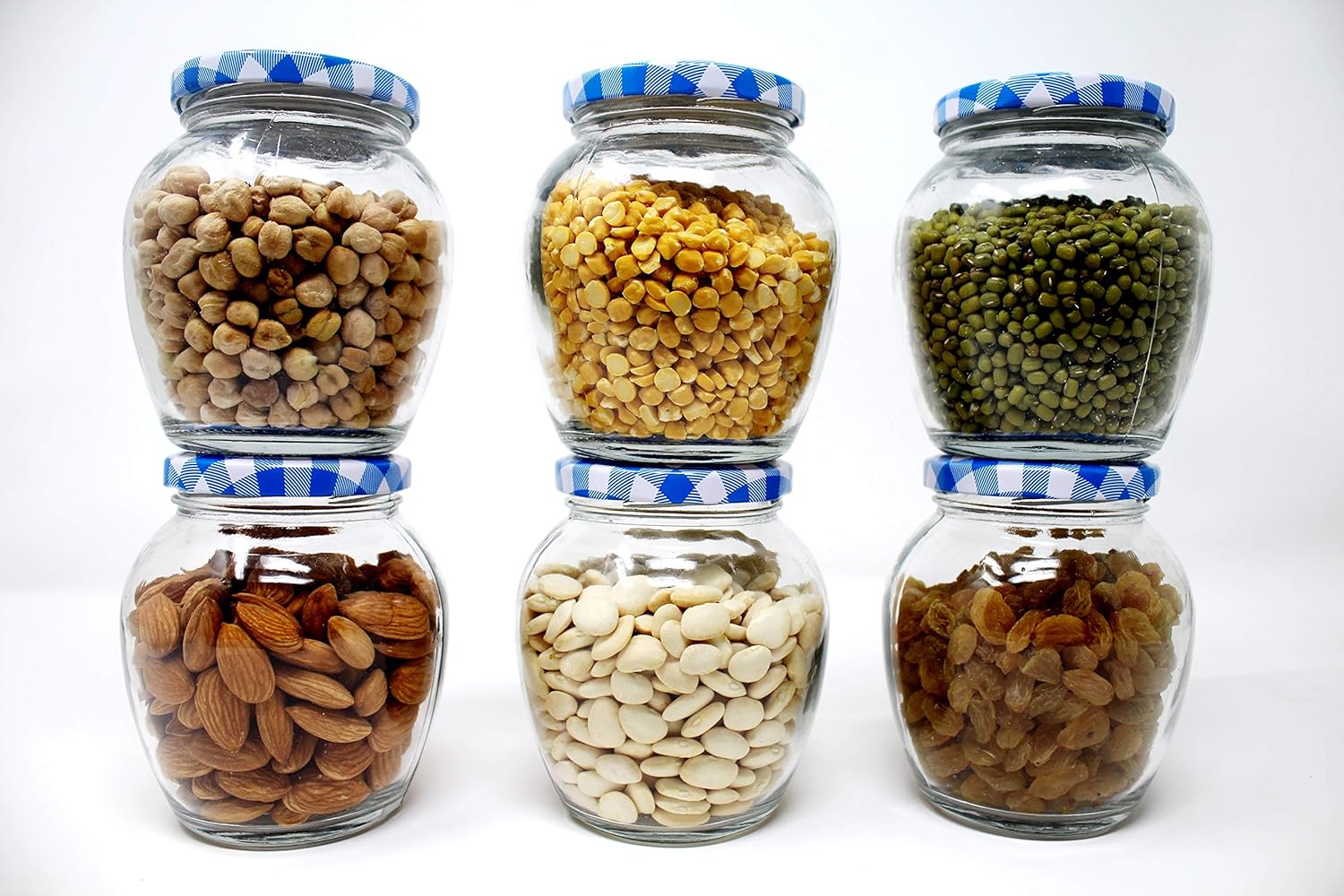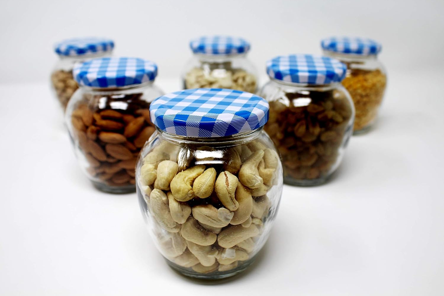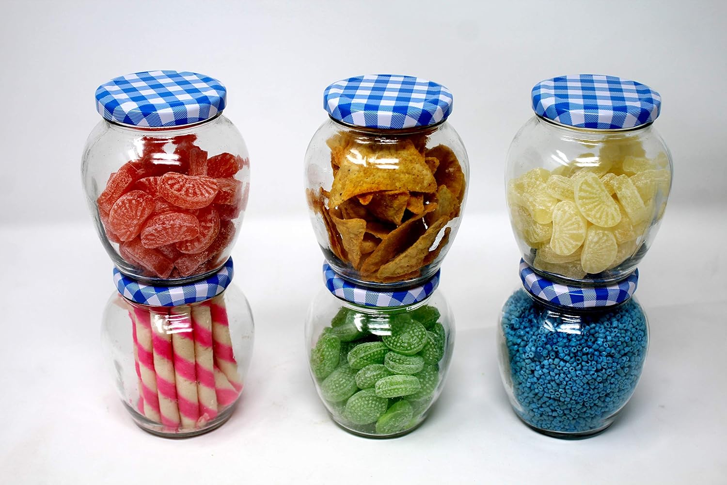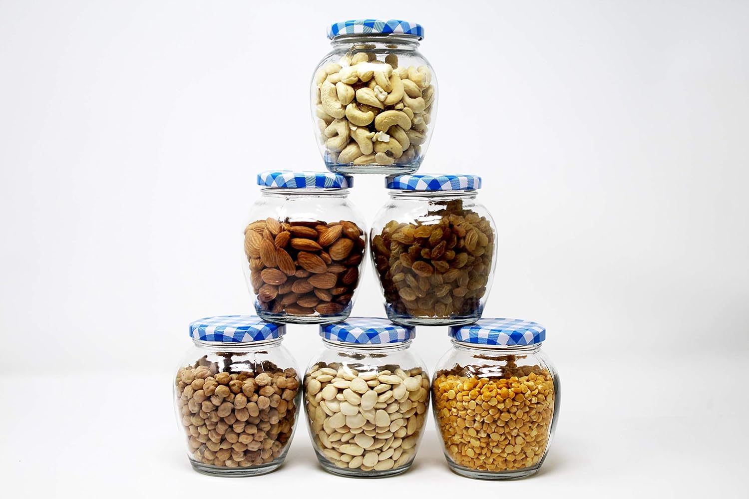 NATURE CARE ENTERPRISE Matka Style Glass Jars and Container for Storge Spices and Pickle { 400ml } Set of 6 (Blue Checks lid)