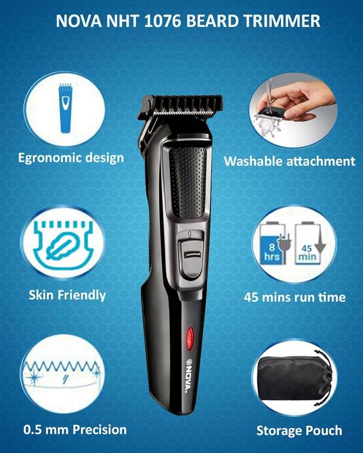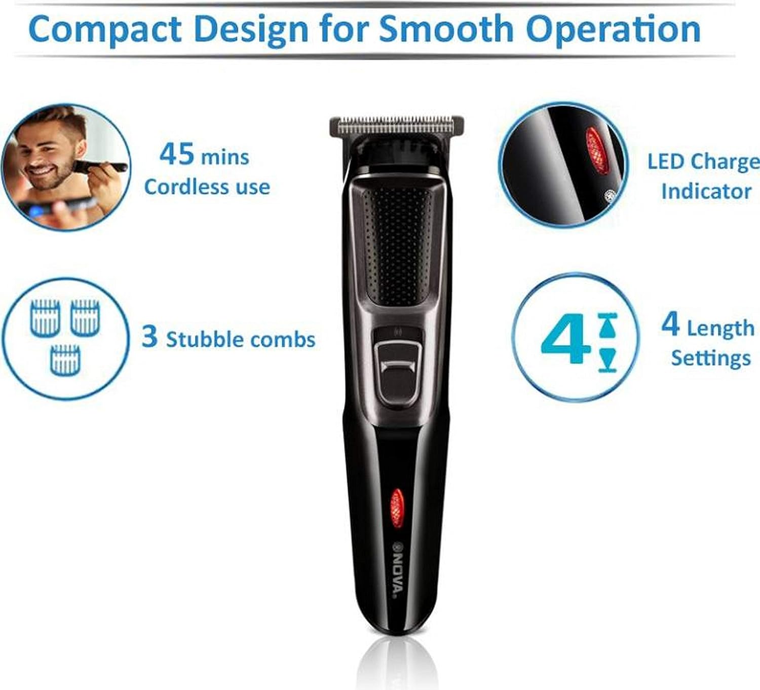 This cordless Titanium coated trimmer from Nova is a stunning piece. Grab this trimmer and enjoy hassle-free grooming experience at home.This trimmer ensures ease of use, thanks to its ergonomic design. So look dashing and trim your beard and your underarms and be party-ready always.This trimmer is not just a device used for trimming. It comes with a number of other attachments which will ensure that you look groomed. Its Titanium coated blade will give you a complete and clean trim without cutting or damaging your skin.Whether you are at home or holidaying, with this trimmer in handy, you don’t have to worry about looking shabby as this trimmer is rechargeable and can be carried along with you wherever you. |