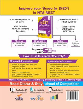 The Smart & Innovative Book from Disha 'NTA NEET 101 Speed Tests' contains: 1. 96 Chapter-wise + 3 Subject-wise + 2 Full Syllabus Tests based on the NCERT & NEET Syllabus. 2. Carefully selected Questions (45 per Chapter /Subject & 180 per Full Test) that helps you assess & master the complete syllabus for NEET. 2. The book is divided into 3 parts: (a) 96 Chapter-wise Tests (28 in Physics, 30 in Chemistry & 38 in Biology); (b) 3 Subject-wise (1 each in Physics, Chemistry & Biology); (c) 2 Full Test of PCB. 3. Time Limit, Maximum Marks, Cutoff, Qualifying Score for each Test is provided. 4. These Tests will act as an Ultimate tool for Concept Checking & Speed Building. 5. Collection of 4815 MCQ’s of all variety as per latest pattern & syllabus of NEET exam. This book, if completed with FULL HONESTY, will help you improve your score by 15-20%. A Must Have Book in the last 3-4 months of the exam and can be completed in 105 Hrs.