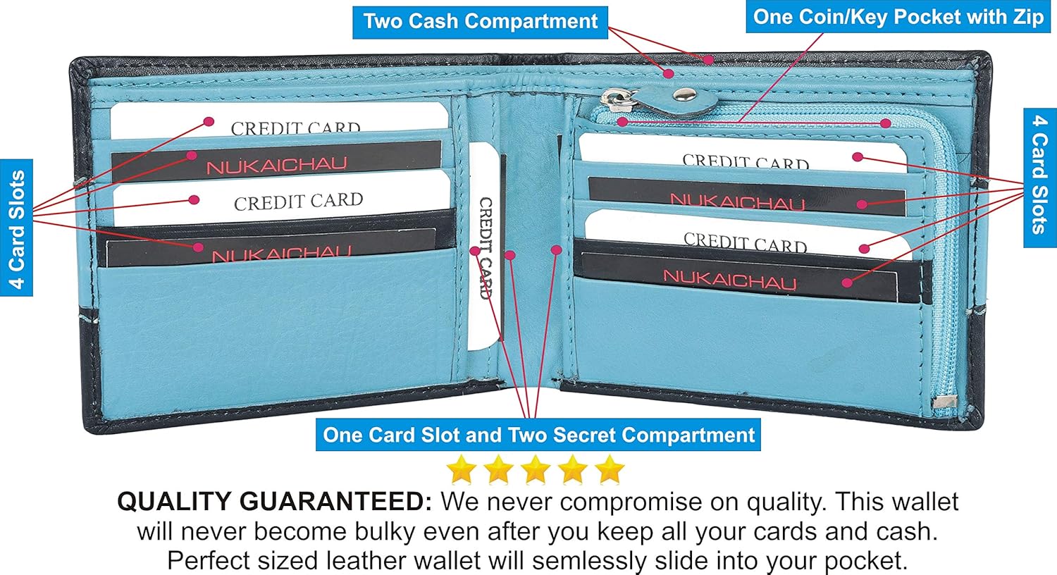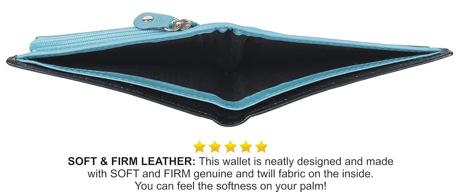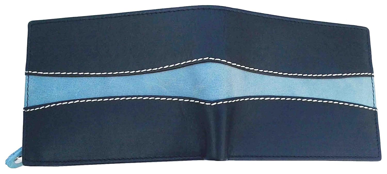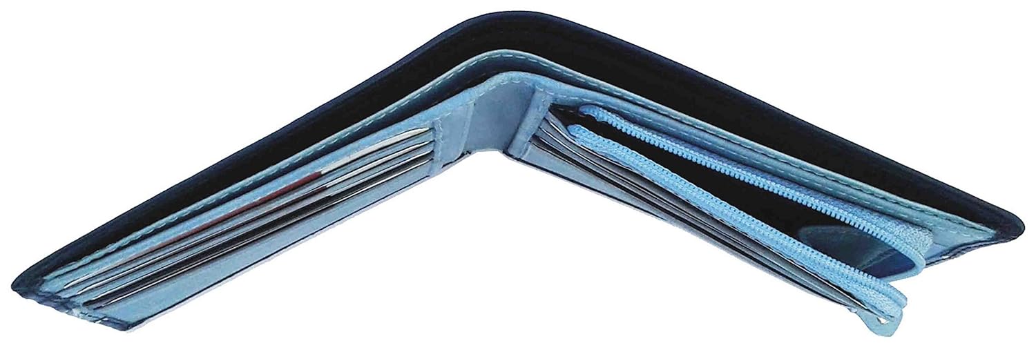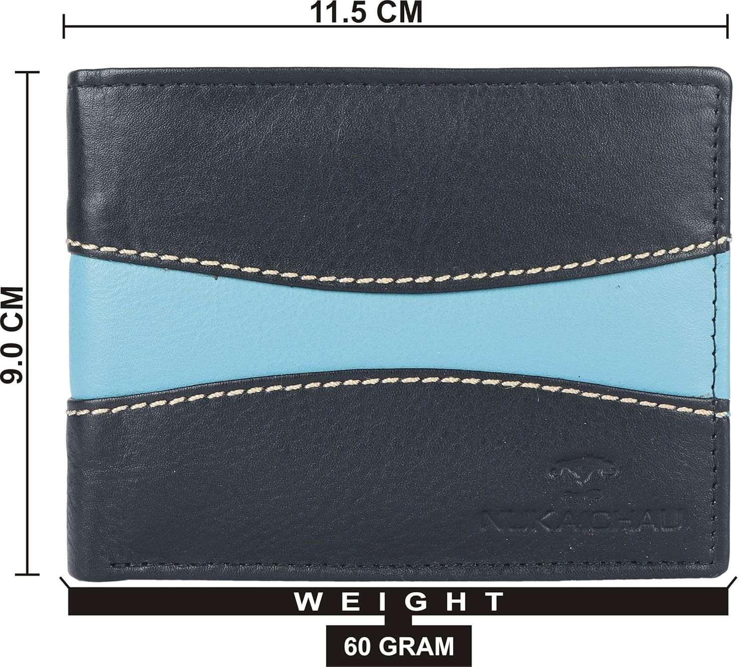 ? Weight: 70 grams; Dimensions: 8.75 cms x 1.75 cms x 11.75 cms (LxWxH); Cards Slots: 8; One Coin Pocket With Zip ; Two Main Note compartments ; Color : Black and Sky Blue Mix Soft Leather; ? Search 'NUKAICHAU' For More Size And Style batua gents.