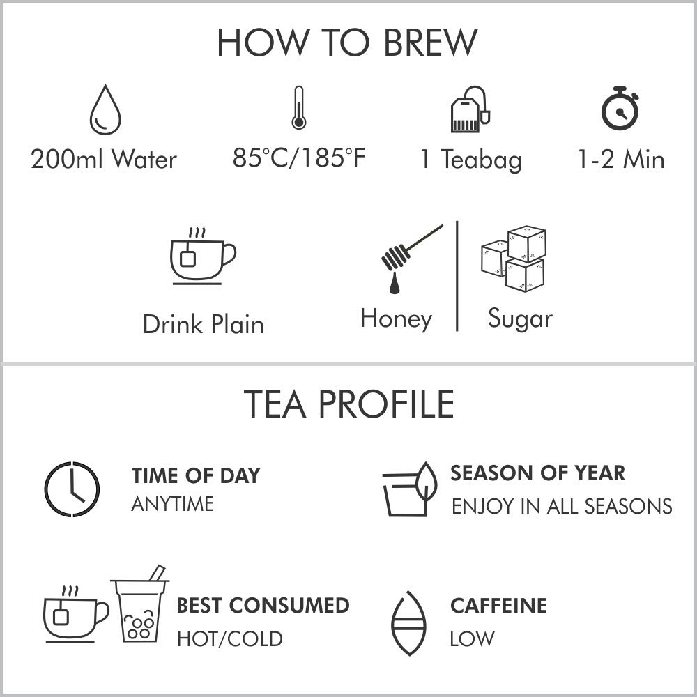 EAST TO BREW - Just dip a teabag in a cup of 180 ml hot water(85°C) and steep for 1-2 minutes.It tastes delicious both hot or as iced tea. To be consumed without milk. Sweetener or honey can be added as per taste.