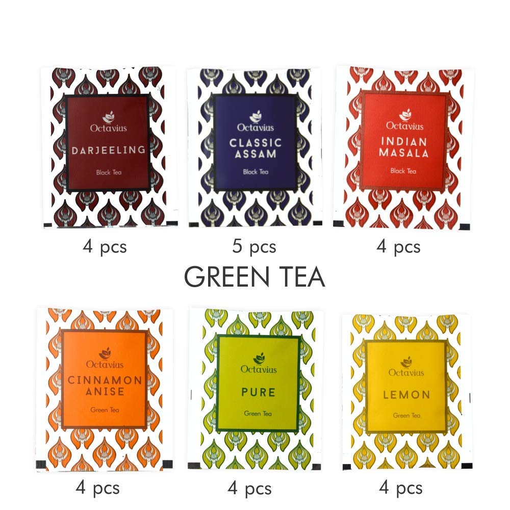 Octavius Tea Bag Gift Box Set 6 Assorted Tea Flavors in Black & Green Teas in an Elegant Gift Box Bag, 50 g