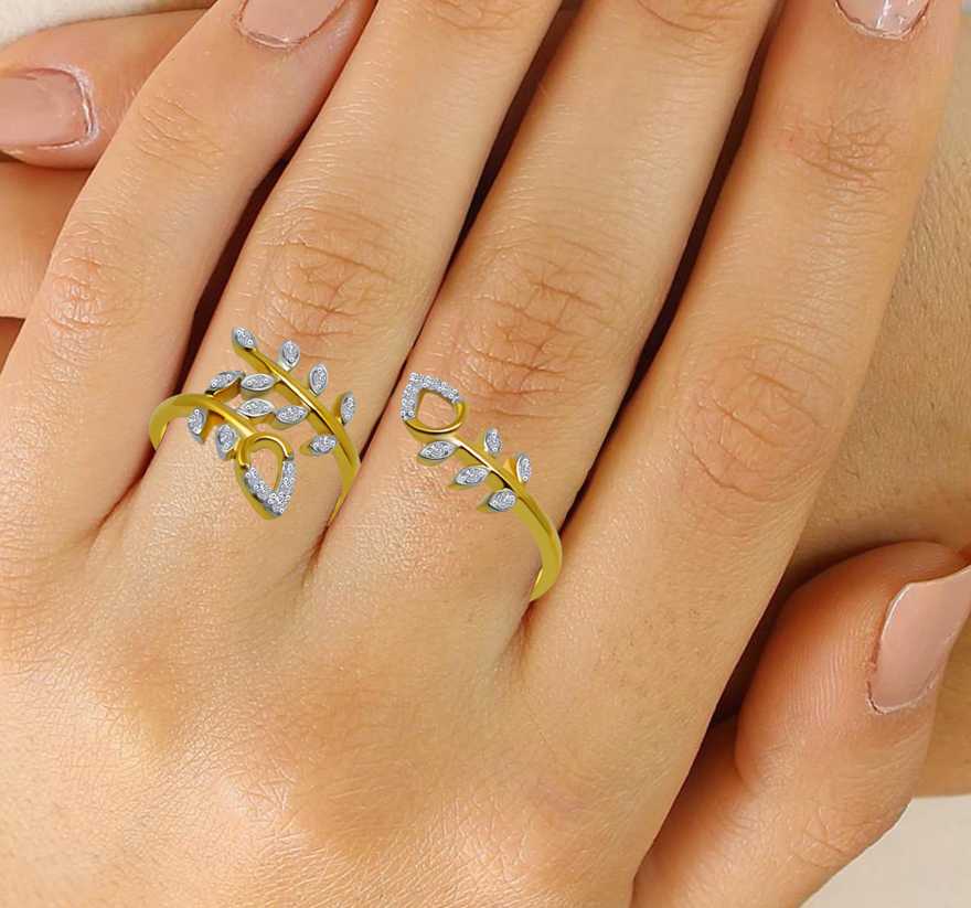 14K Yellow Gold and American Diamond Leaf Two Finger Ring for Women |