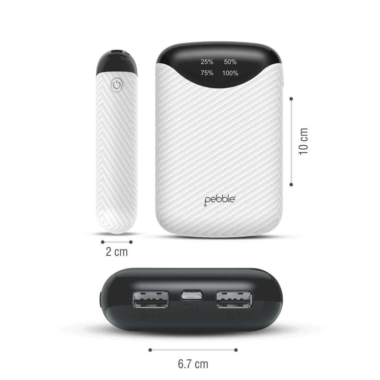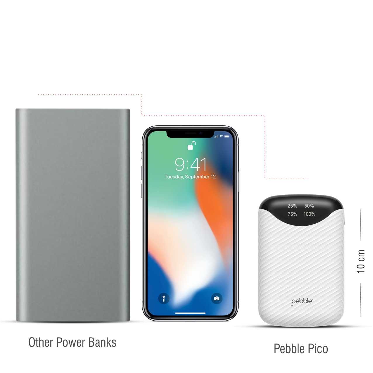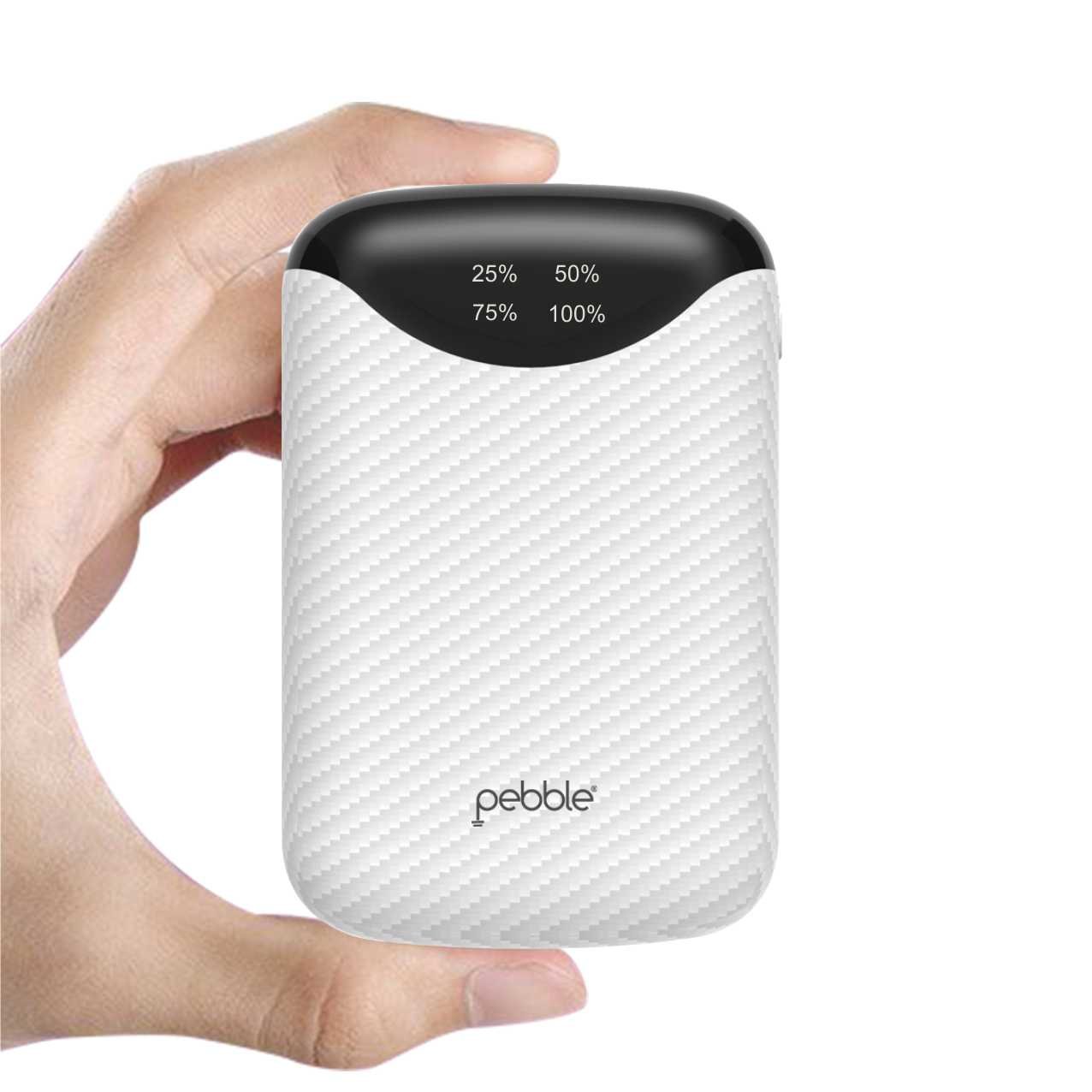 Pebble Pico 10,000mAH Palm sized Power bank, Its truly portable - Palm Sized (10 x 6.7 x 2 cm) design makes it the smallest among all other power banks available. With dual usb outputs you can charge 2 devices simultaneously, it also comes with a digital display which shows remaining power available to juice up your devices in digital (25-50-75-100) format. |