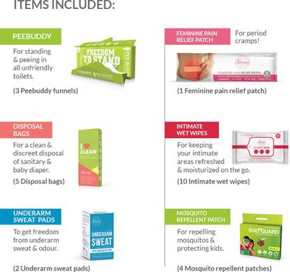PeeBuddy - 3 Funnels, Feminine Pain Relief Patches - 1 Pcs, Disposal Bag - 5 Bags, Intimate Wet Wipe - 10 Pcs - 1 Pack, Underarm Sweat Pads - 2 Pads - 1 Pair, Mosquito Repellent Patches - 4 Patches
