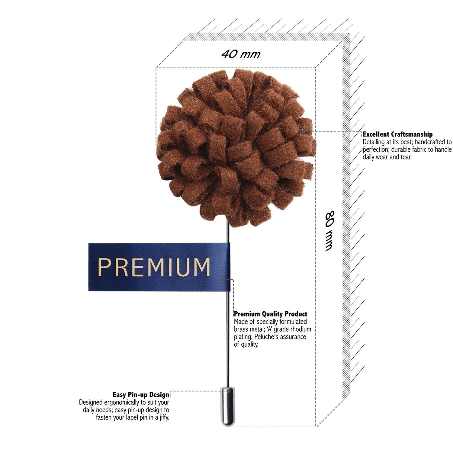 Buy this exotic brown colored flower lapel pin from Peluche, StyleEvermore! This ornamental lapel pin has been handmade to perfection for the dapper gentleman who knows the importance of little things which make a big difference. The material used for the flower lapel, is natural velvet and the pin comprises of specially formulated brass with a coating of 'A' grade silver Rhodium for more durability, because we at Peluche, believe in Zero compromise with quality. Buy this Suit accessory at a pocket-friendly price and receive it packed in a premium gift storage chic box from Peluche! |