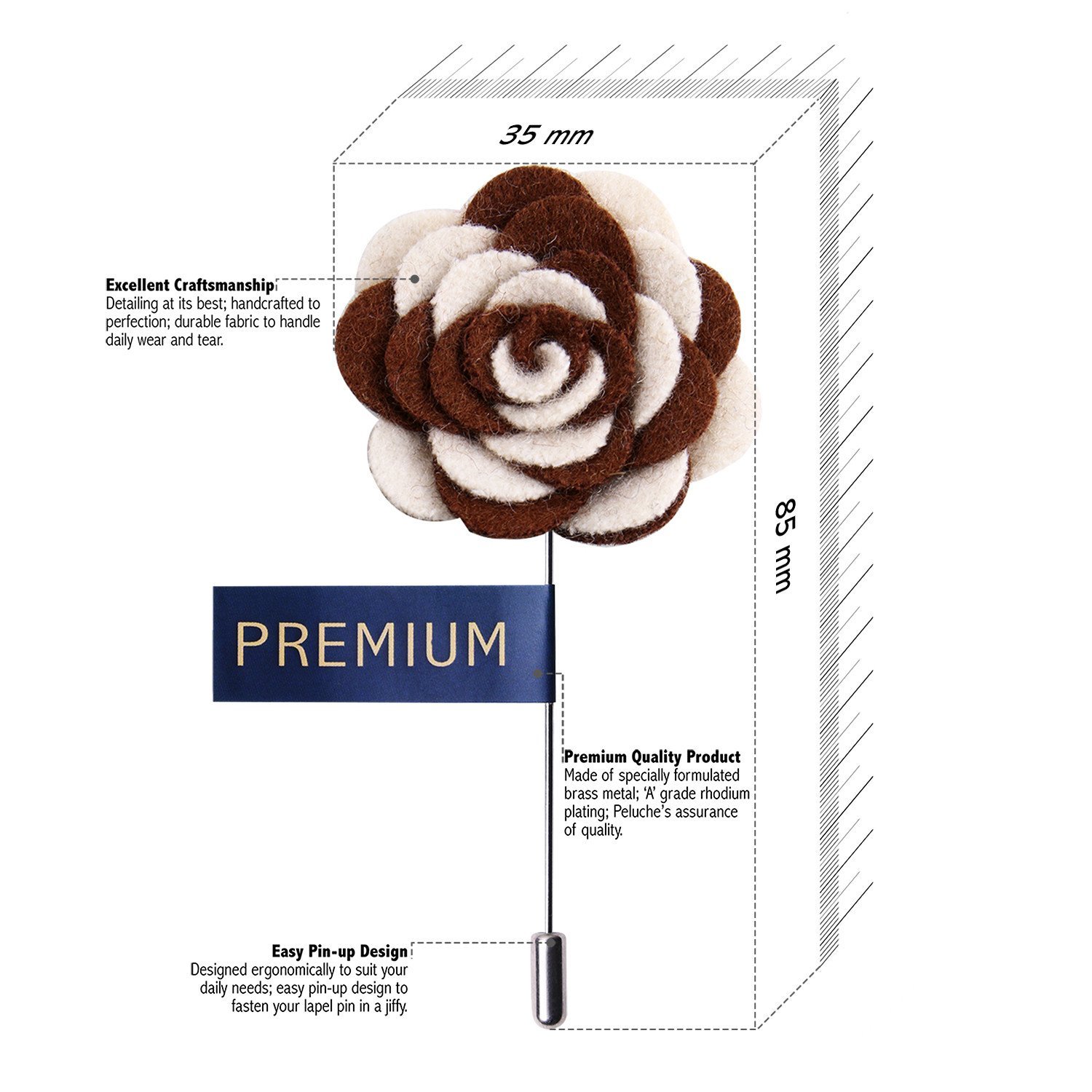 Buy this exotic white and brown colored flower lapel pin from Peluche, StyleEvermore! This ornamental lapel pin has been handmade to perfection for the dapper gentleman who knows the importance of little things which make a big difference. The material used for the flower lapel, is natural velvet and the pin comprises of specially formulated brass with a coating of 'A' grade silver Rhodium for more durability, because we at Peluche, believe in Zero compromise with quality. Buy this Suit accessory at a pocket-friendly price and receive it packed in a premium gift storage chic box from Peluche! |