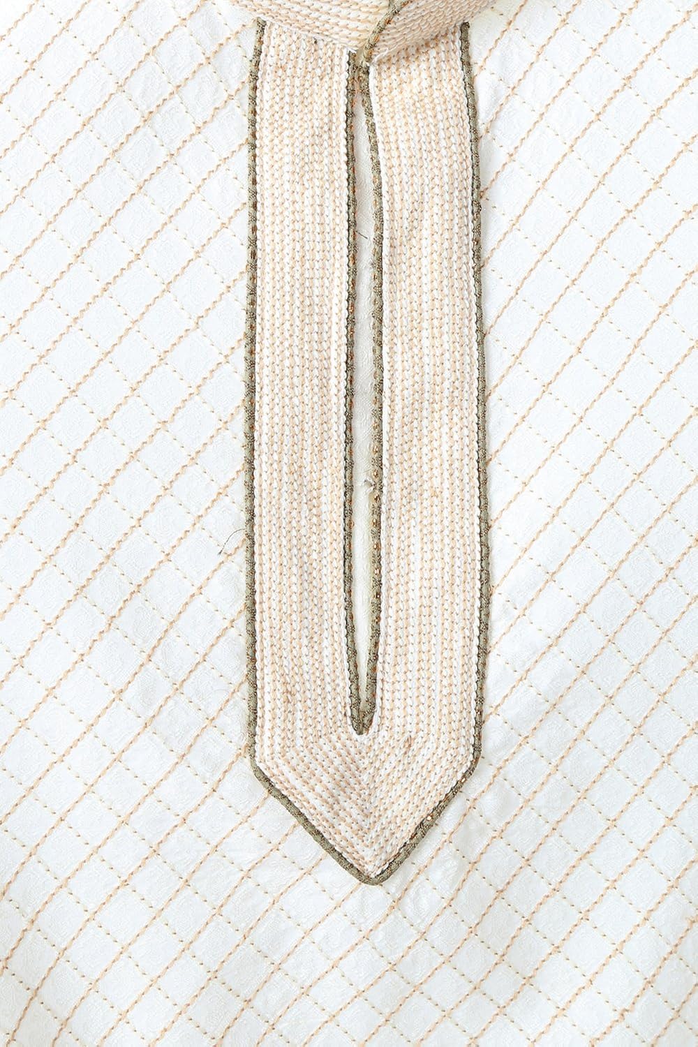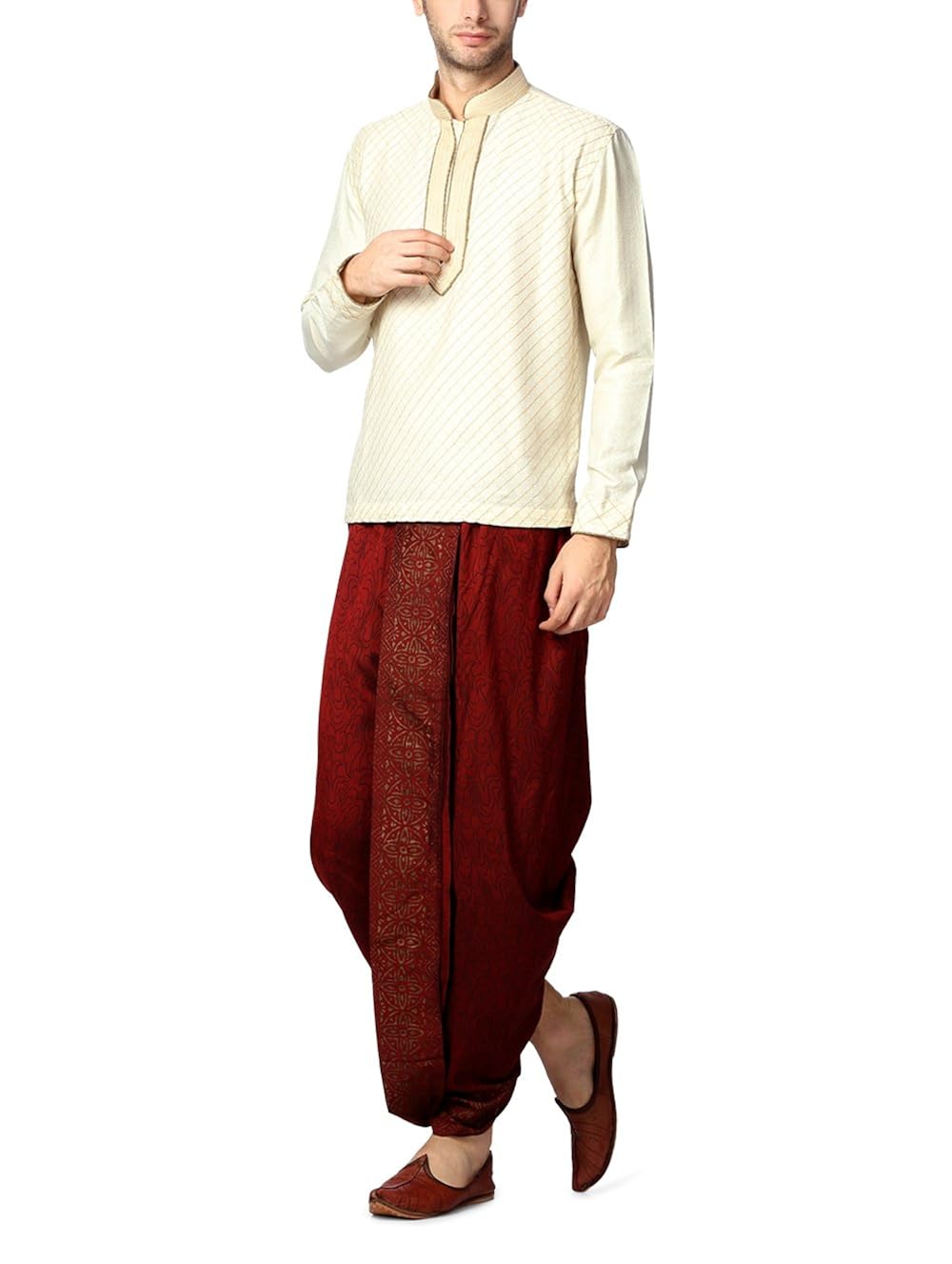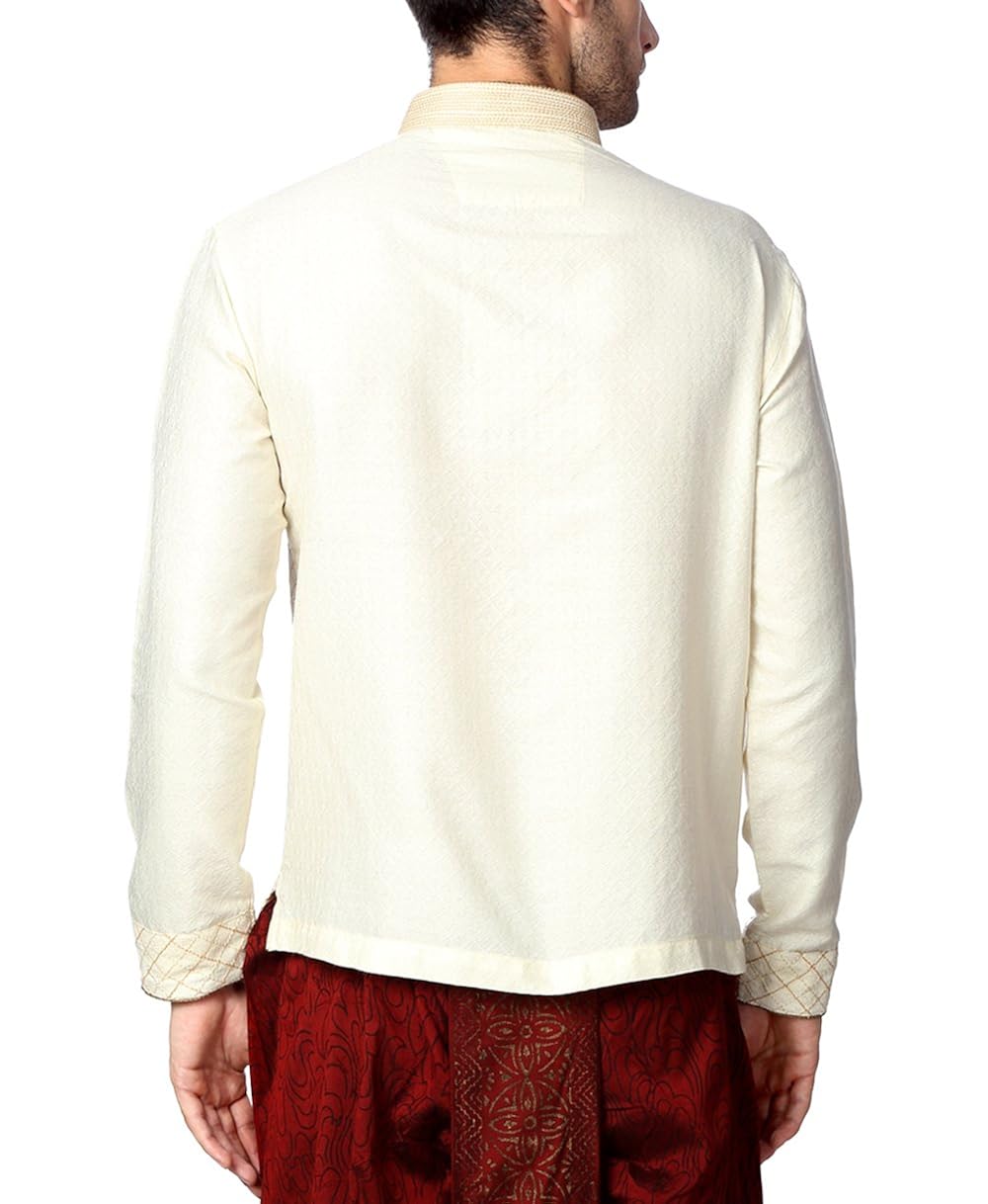 Flaunt your ethnic style in this white embroidered kurta from Peter England. Made from a lustrous polyester slub blend for a comfort fit, this short kurta is designed with a stylized stand up collar and placket. Wear it with a dhoti and sandals for a handsome look. |
