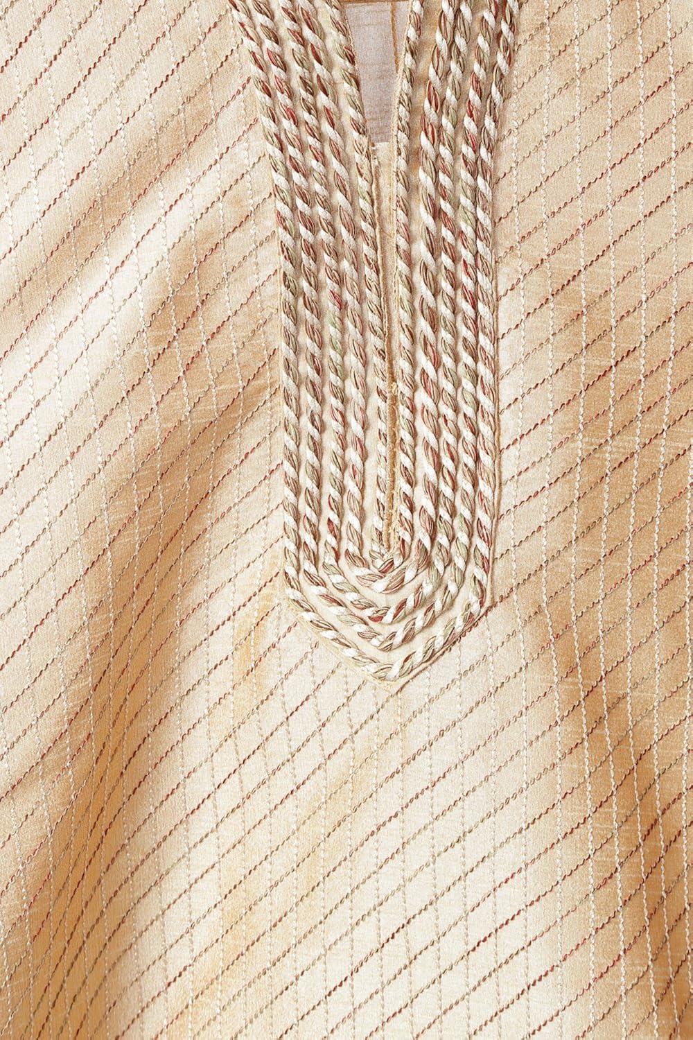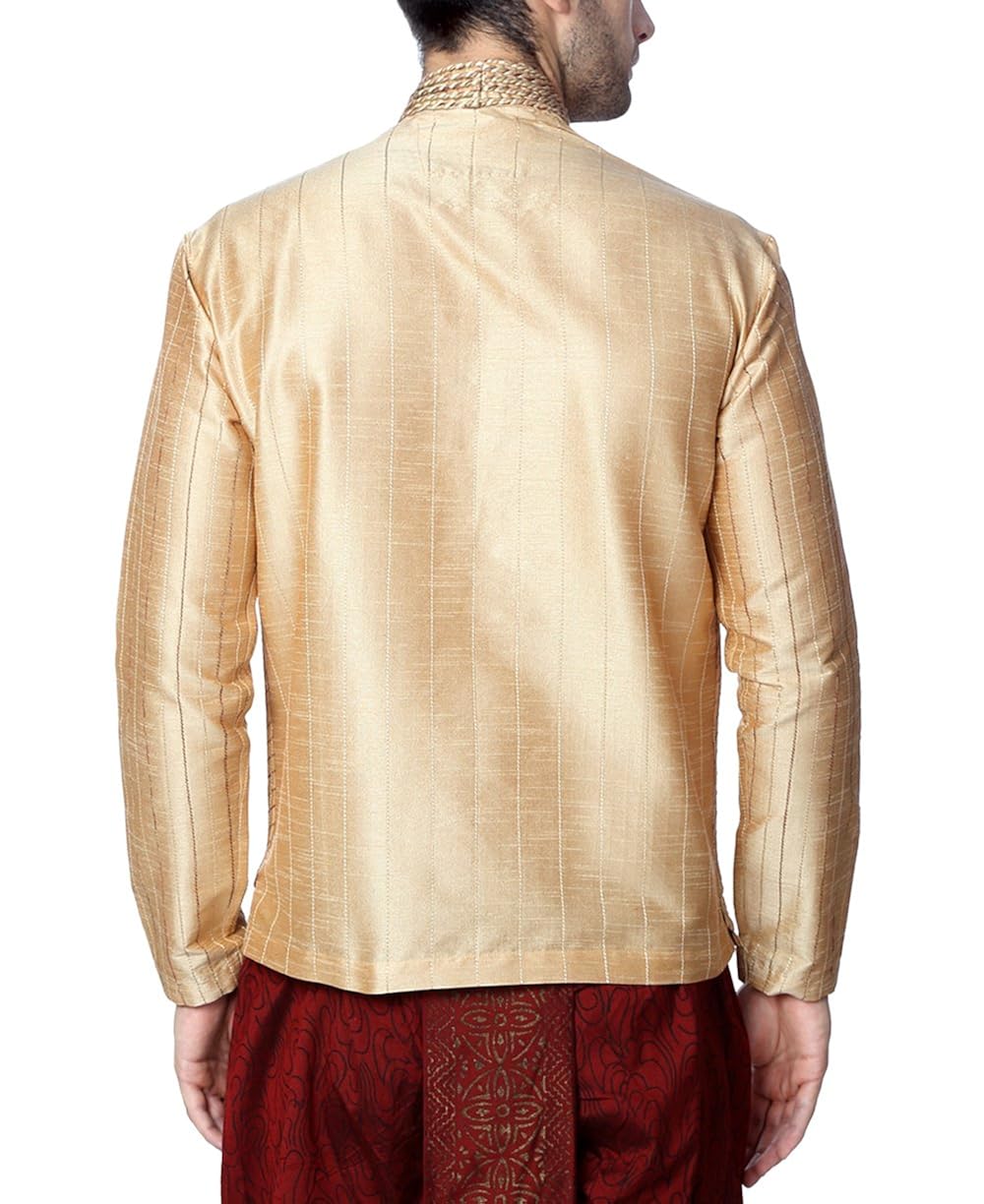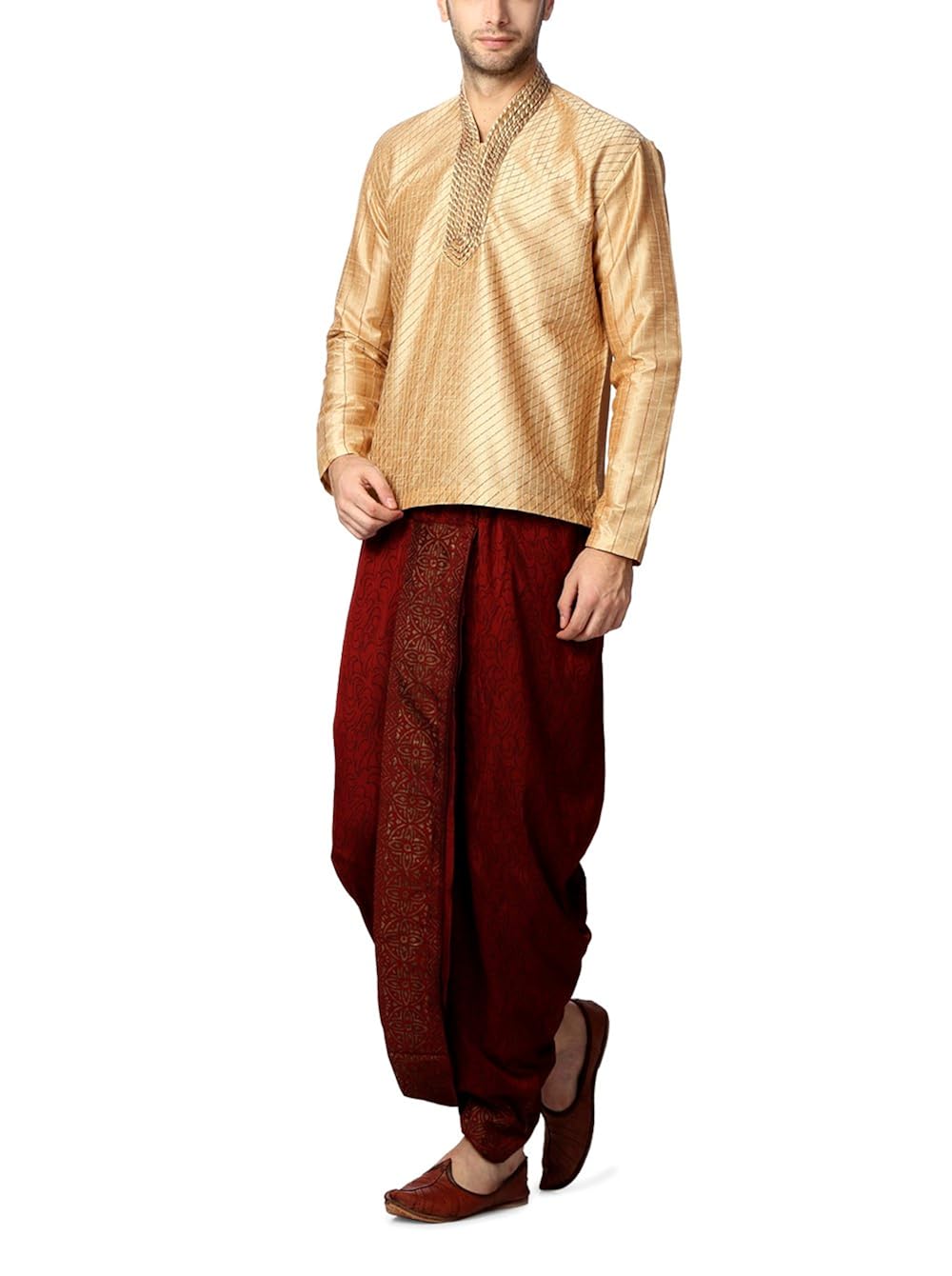 Chanel your true ethnic spirit with this full sleeves beige kurta from Peter England, featuring a neatly embroidered front. Made from a poly-blend, the beautiful embroidery details on the band collar and mock placket add an extra dose of class to its overall look. Complete your traditional look by teaming this with a maroon dhoti and ethnic jutis. |