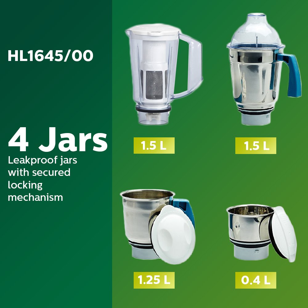 Capacity : Multi purpose jar 1.25 L, Blender capacity : 1.5L, Chutney jar 0.4L