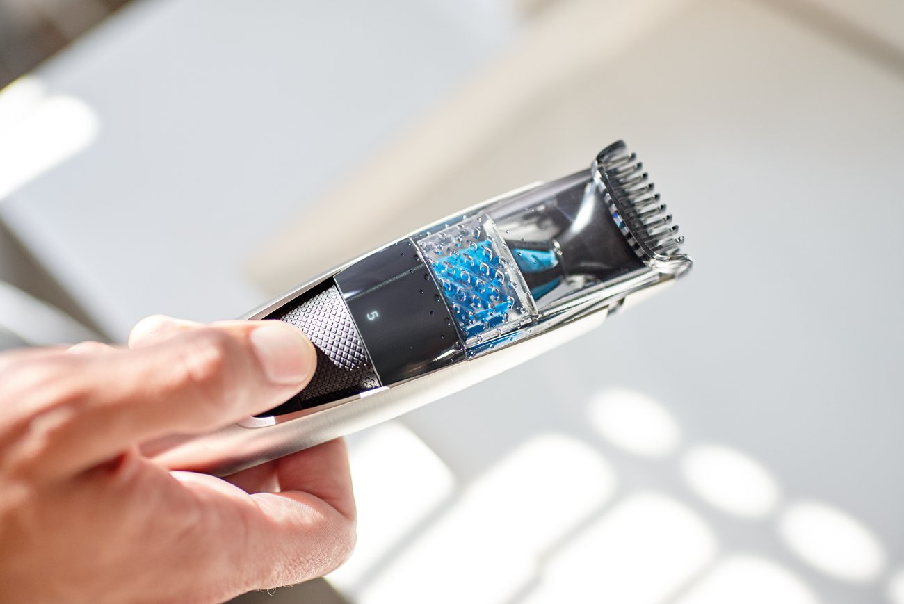 The self-sharpening steel blades are designed to effectively cut each hair perfectly, preventing skin irritation, and are double sharpened to cut more hairs in every pass for faster trimming |