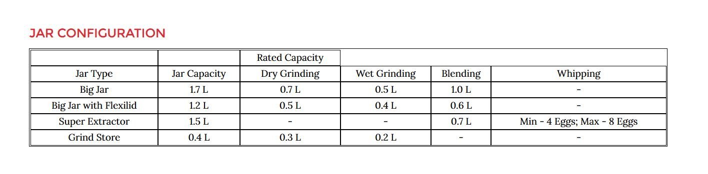 Includes: 1 Mixer grinder, 1 1.7 Litre big jar, 1 big jar with 1.2 Litre fliexilid, 1 1.5 Litre super extractor and 1 0.4 Litre grind'n store with big and small bottles