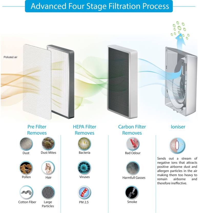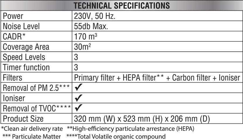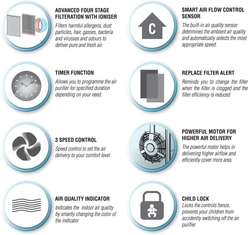 "Fresh and clean air is essential for the well-being of your family. With harmful pollutant particles like dust, hair, gasses, bacteria and viruses, the air inside your home is as polluted as outdoor air which can be harmful to your health. Safeguard your family's health, bring home a Prestige Air Purifier today. Prestige Air Purifiers are built for one purpose- to safeguard your family’s health. The advanced four-stage air filtration with ionizer technology, not only removes harmful allergens and pollutants but also remove disease-causing bacteria and viruses as well as bad odours and smoke effects. In fact, it cleans the air around you so well that you will feel the difference immediately. With advanced filtration technology, intelligent control panel and aesthetic design, the prestige air purifier is a must for your family's health"