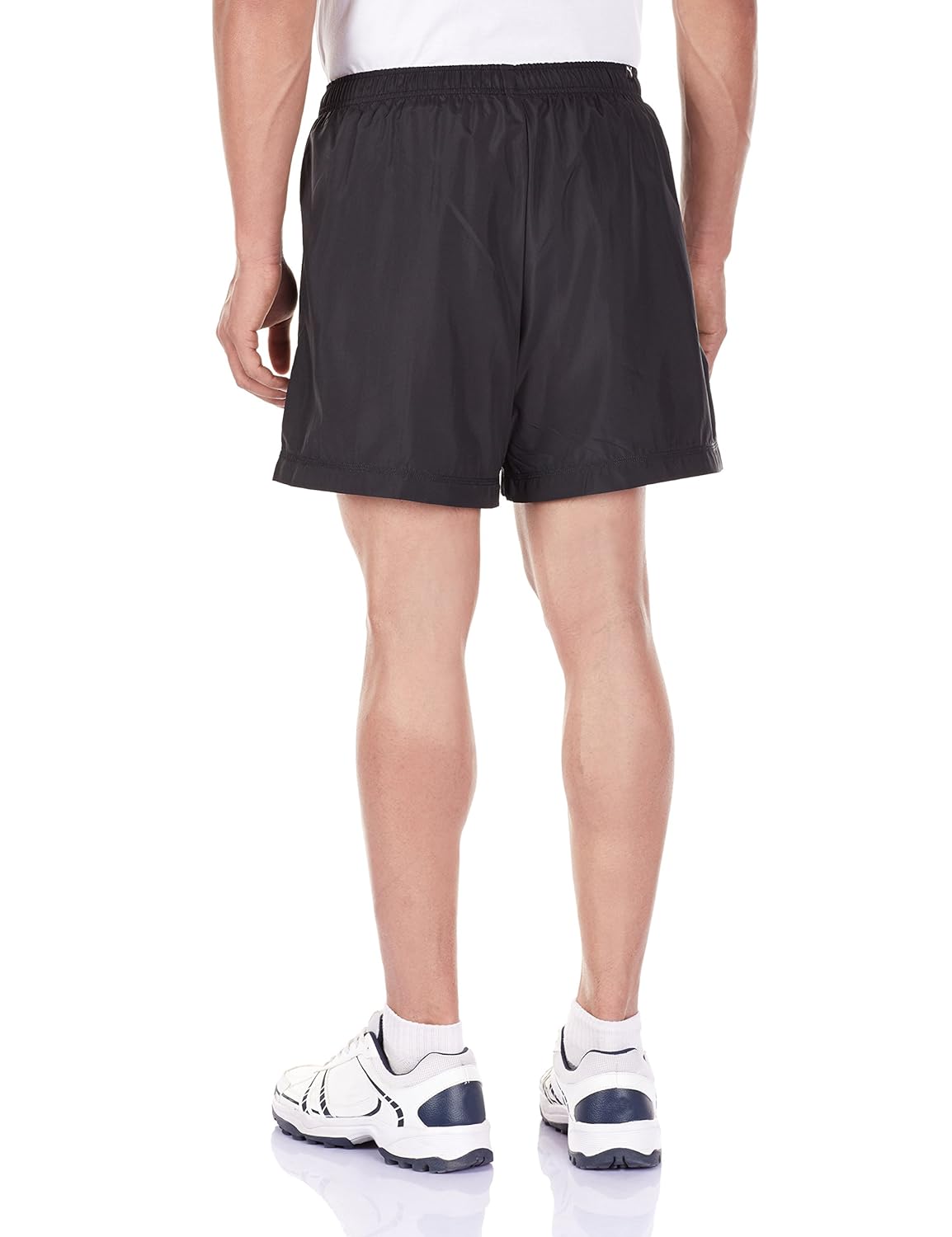 Black woven shorts, elasticated waistband with inner drawstring fastening, insert pockets at sides, Puma cat print above left hem in front and right hem at back, mesh lining |