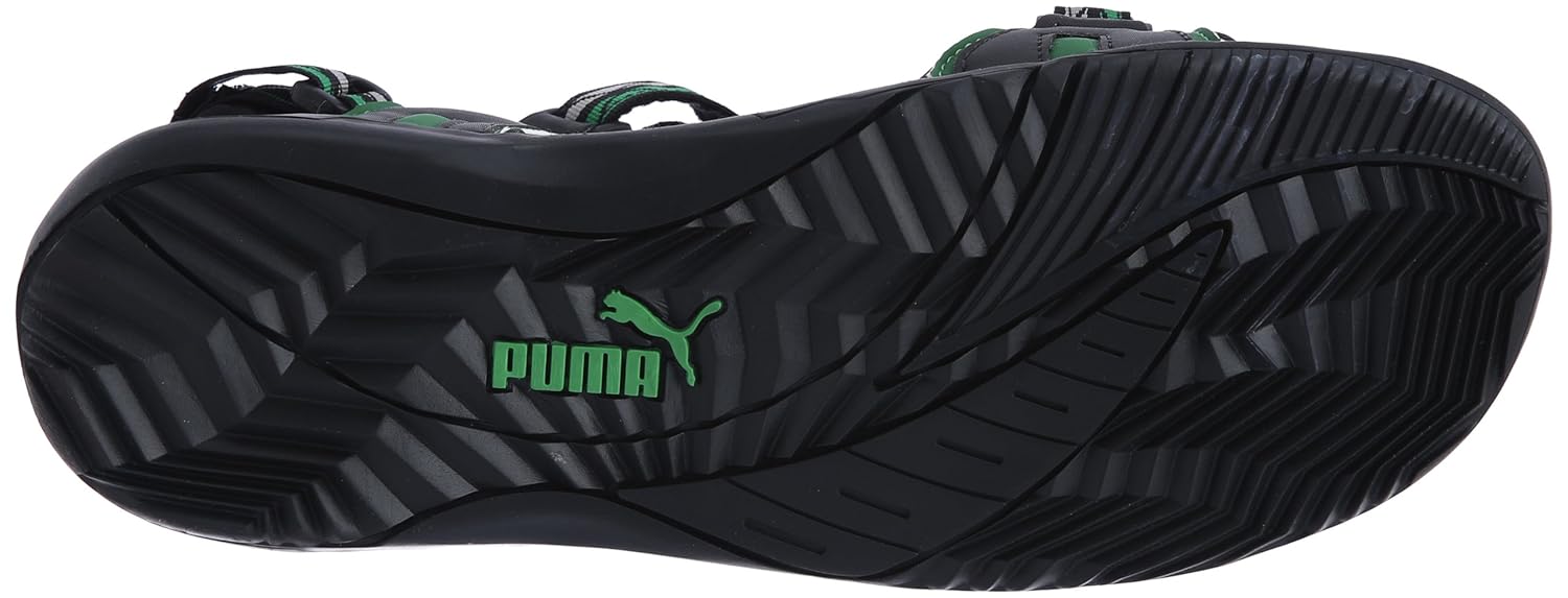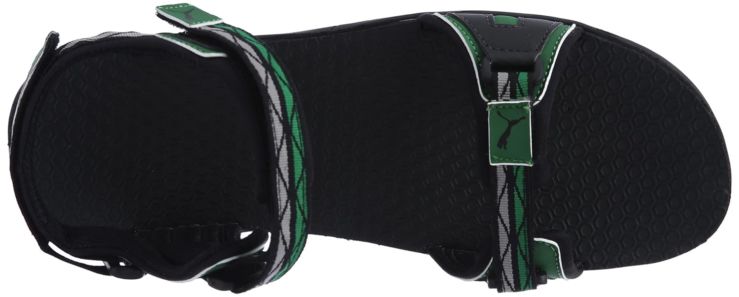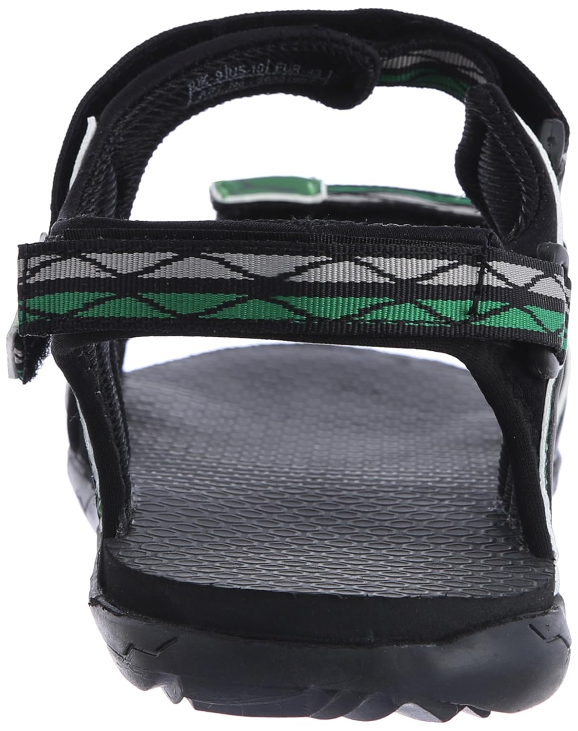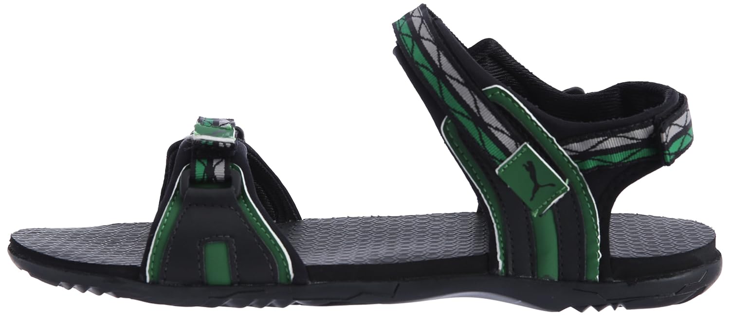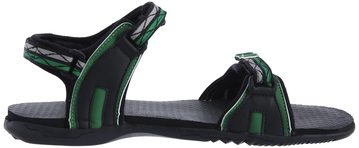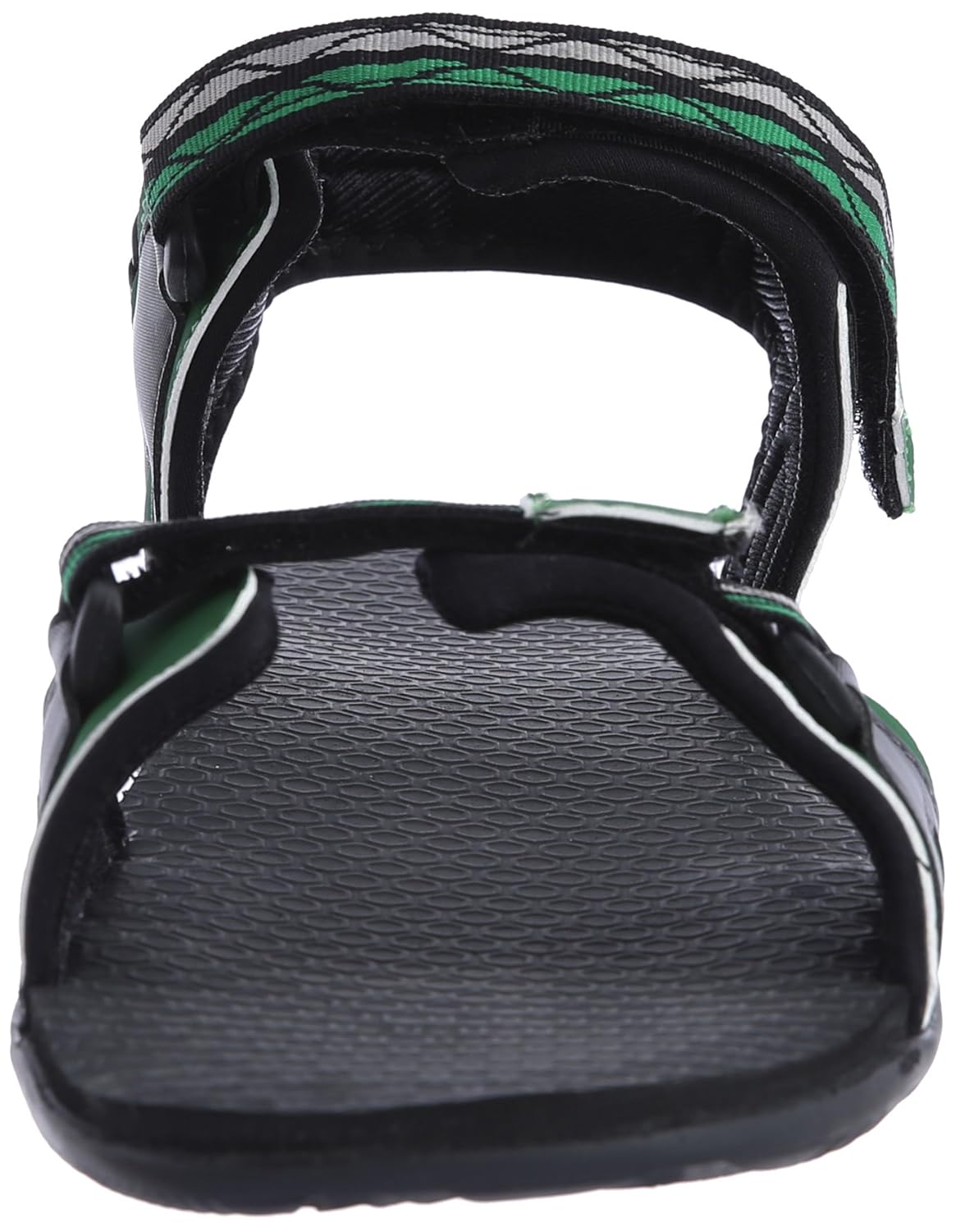 Open toed, black sports sandals with green and grey accents. Synthetic upper, with overlay and stitched detail, has a forefoot strap, a midfoot strap and an ankle loop, with Velcro closures, branding on the forefoot and midfoot strap. Comfortable and textured footbed. Tough rubber outsole with patterned grooves and branding |