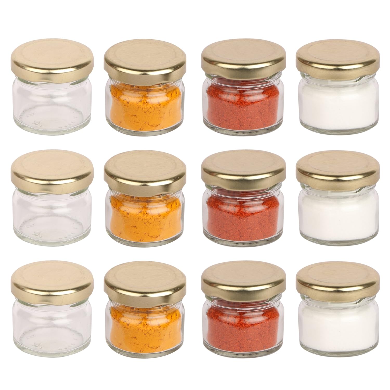 Pure Source India Very Small Glass Jar Set Of 18 Pcs Coming With Metal Golden Color Air Tight And Rust Proof Cap , Capacity 20 Gram