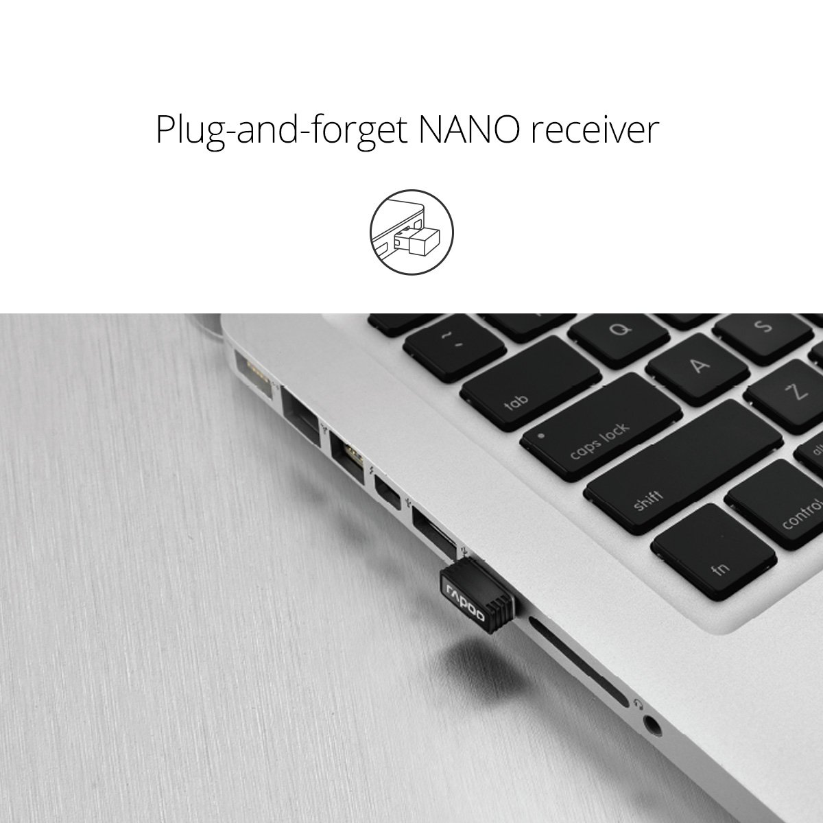 RAPOO 8000 has trendy design and runs on a reliable 2.4GHz wireless connection for a smooth and interference-free mobile experience. Latest energy-saving technology ensures uninterrupted use for up to 12 months of Battery life. Fully plug-and-play which connects and works instantly once the USB receiver is plugged into the computer. The mouse with high precision 1000 DPI invisible tracking engine ensures responsive and smooth cursor control, letting you control your computer with ease and joy. Mini keyboard with multimedia/function keys convenient from palm to finger. |