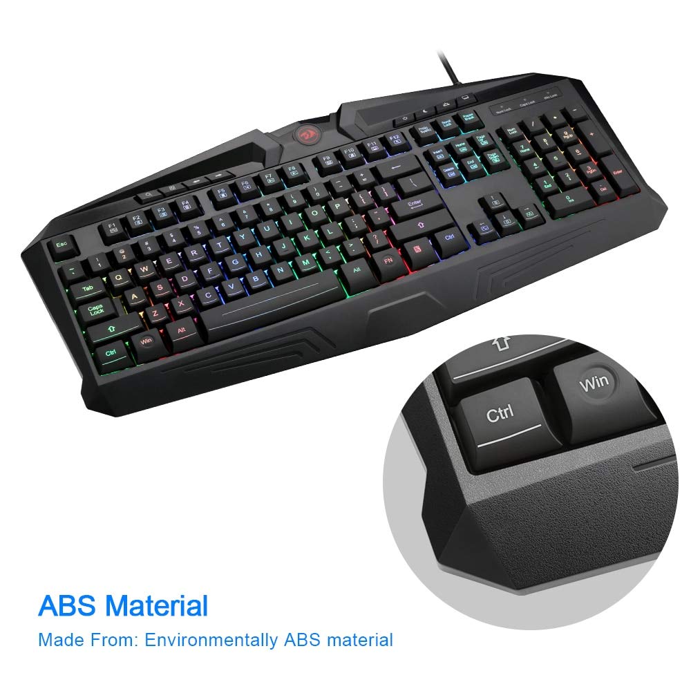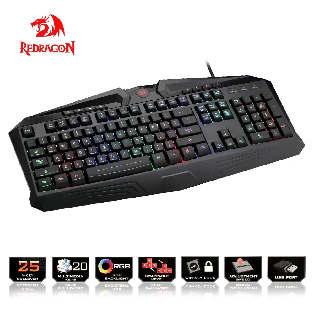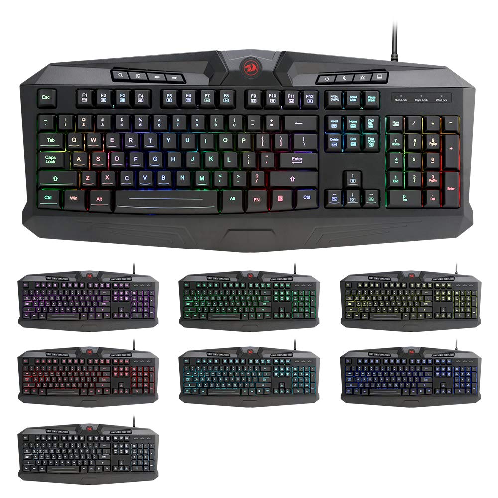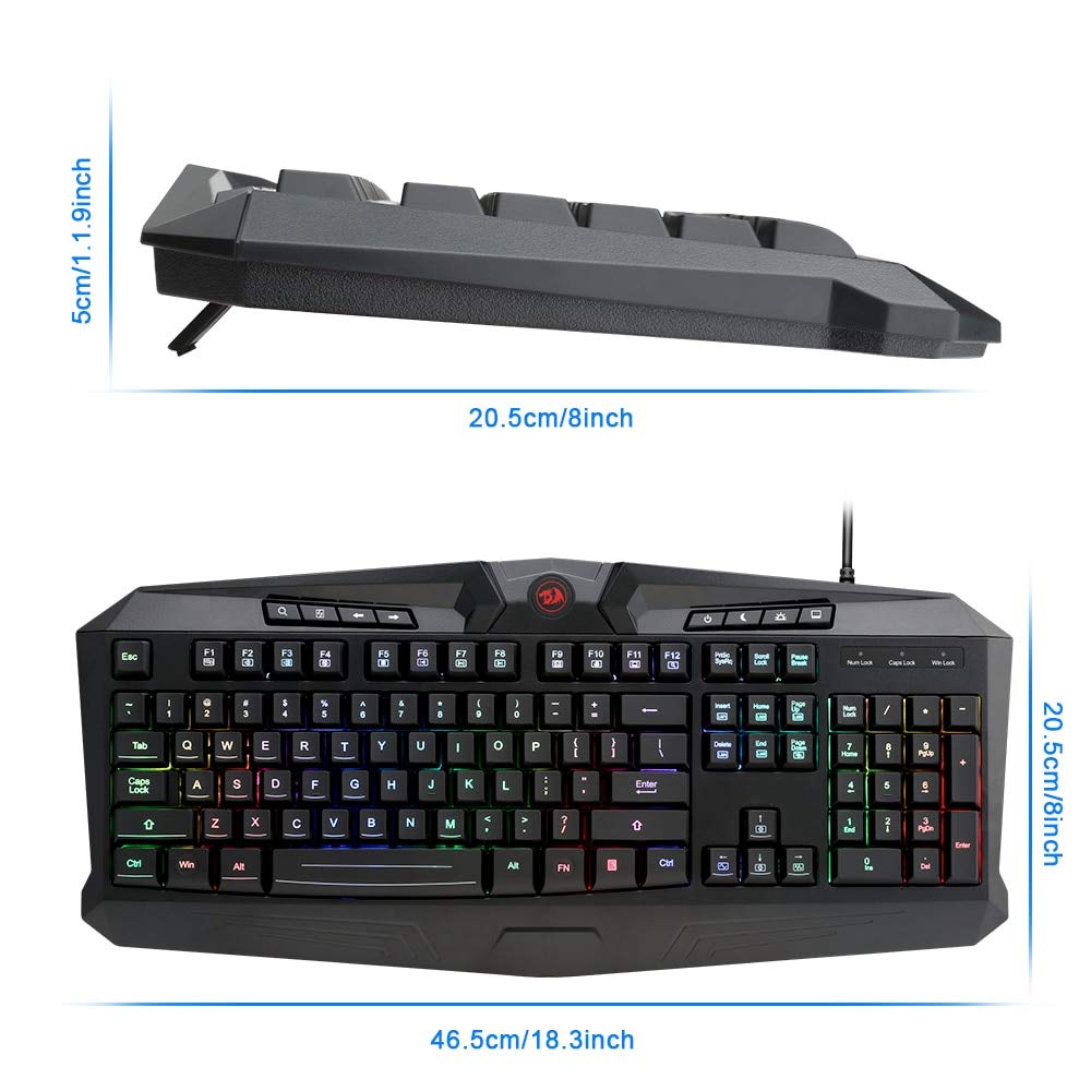 The Redragon K503-RGB isn't your average gaming keyboard. The K503-RGB Gaming Keyboard is loaded with features, perfect for whatever battle you might face. Features: 112 keys are RGB backlit with multiple lighting themes, colours and zones for razor sharp lighting that doesn't scratch off. 104 Standard Keys PLUS 8 independent computer control keys for power management etc. 25 keys are 100 percent anti-ghosting, rollover, conflict-free keys. 12 multimedia controls on Function keys. RGB backlighting can be adjusted for different multiple themes, colours, zones, brightness, breathing effect and on/off. WIN Key can be disabled. 6ft high-strength, high-speed braided fiber USB cable. Splash proof design. Built for durability, reliability, quick responsiveness, and precision. Supports Windows 10, Windows 8, Windows 7, Windows Vista, Windows 2000, Windows XP or later operating system |