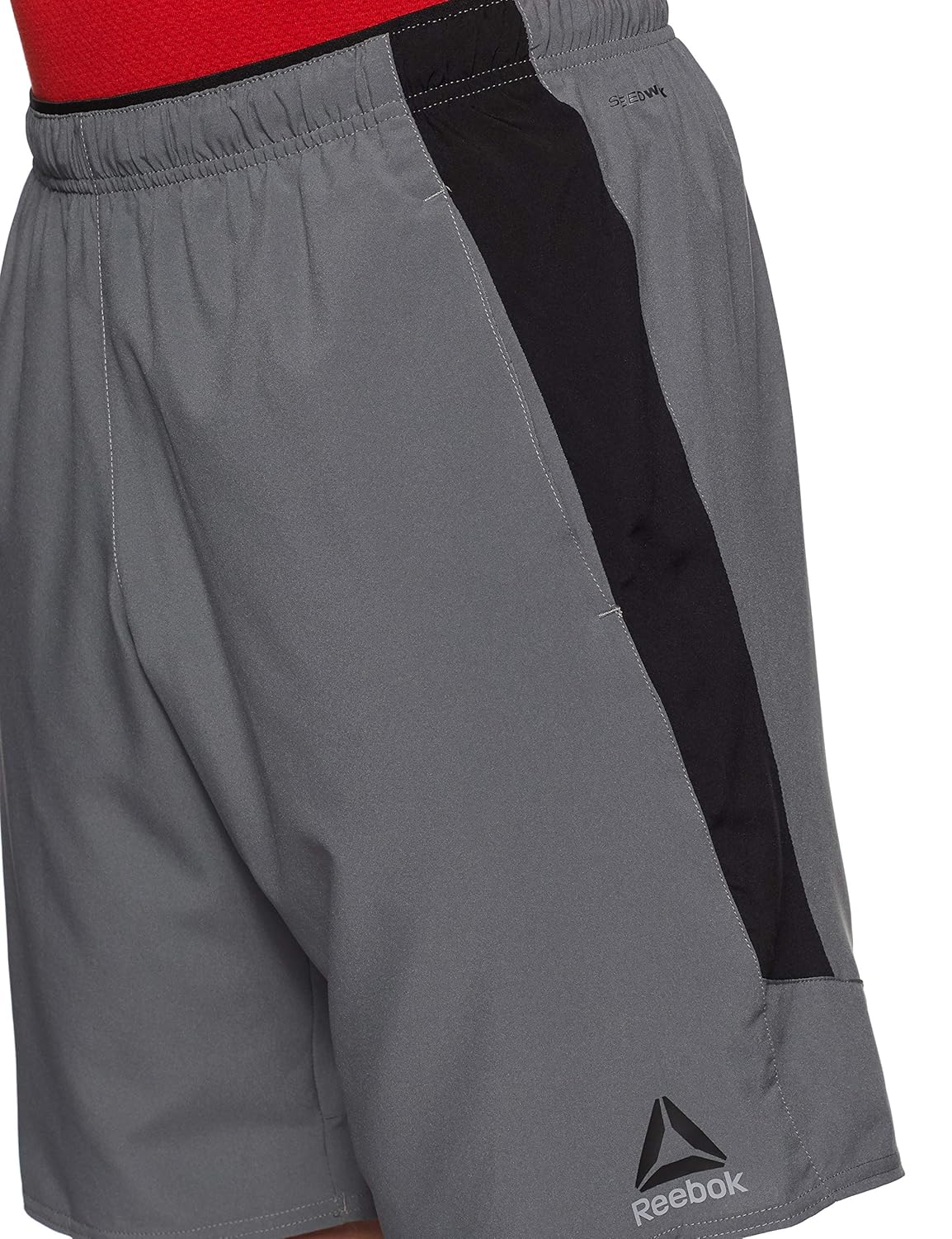 Lightweight woven fabrication with speed wick moisture management. Easy-to-wear pull-on short with exposed elastic waistband, internal draw cord and open hand pockets. Slanted pop color side inserts and diagonal seams provide an energetic look. |