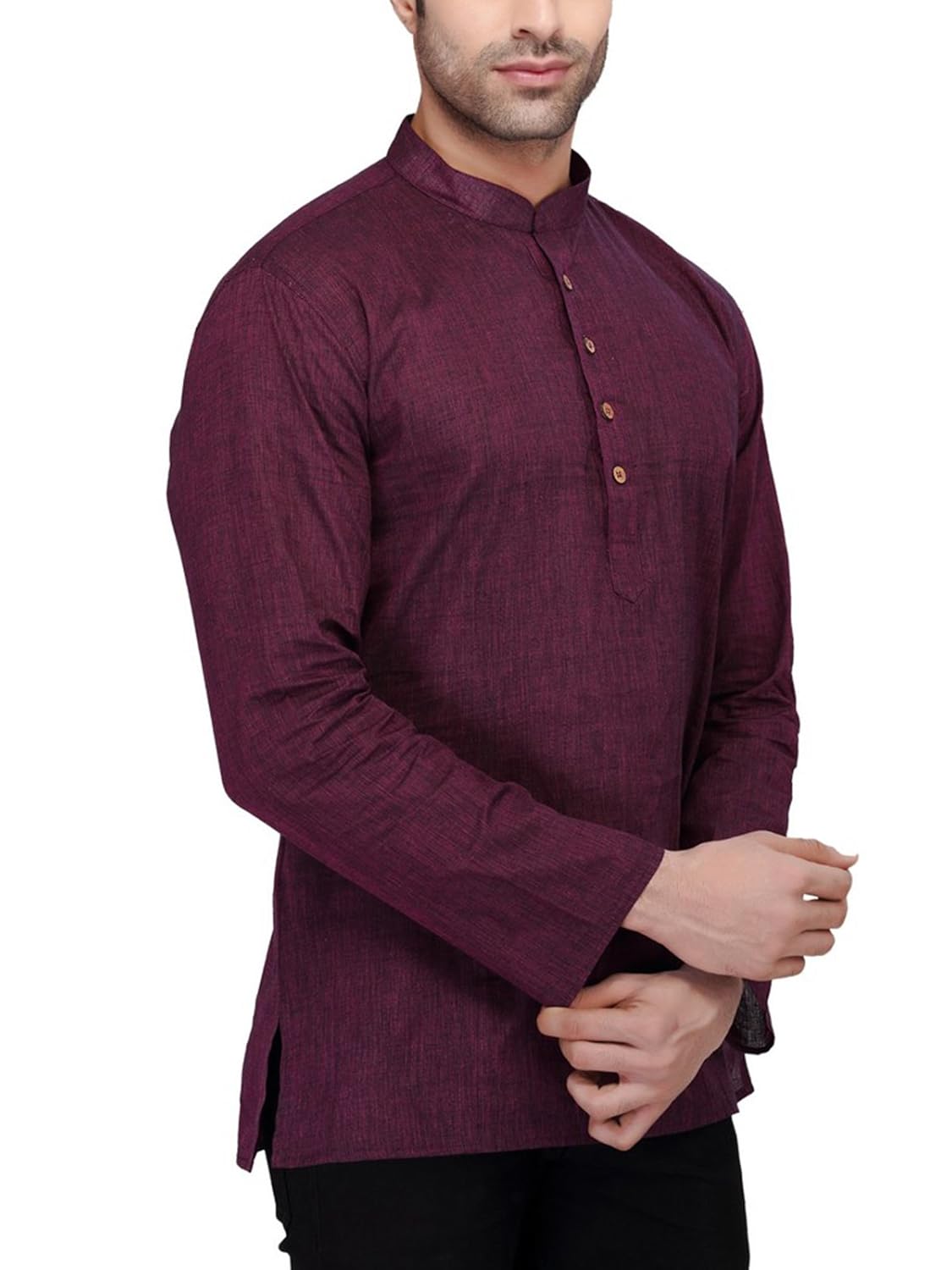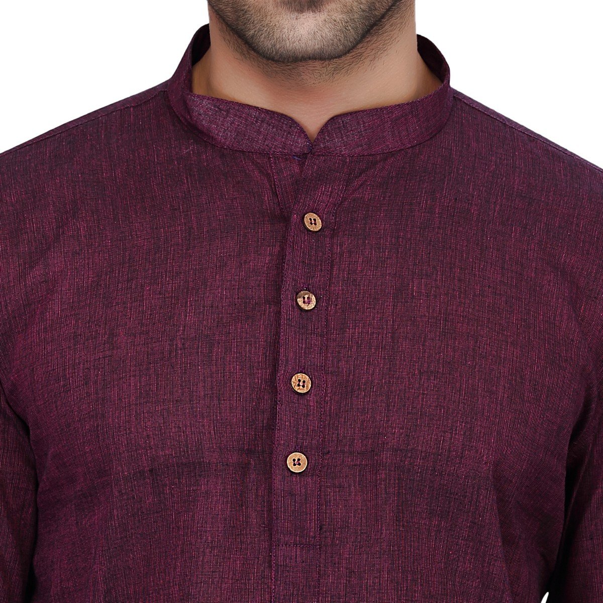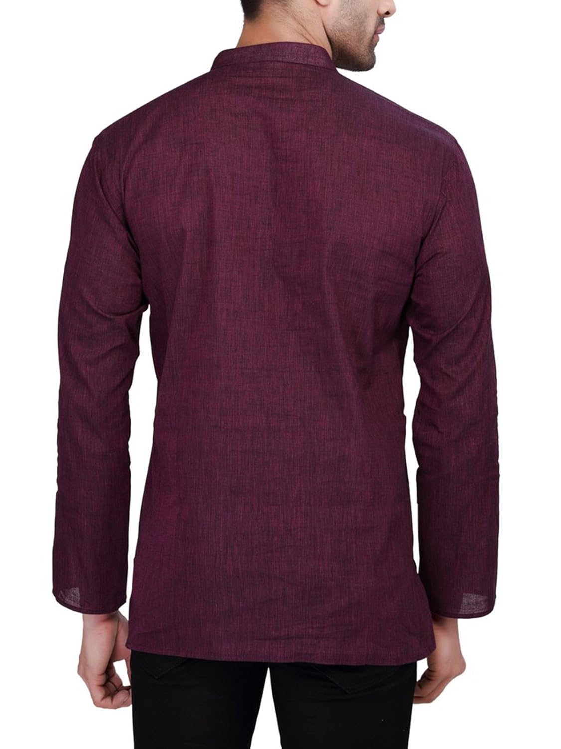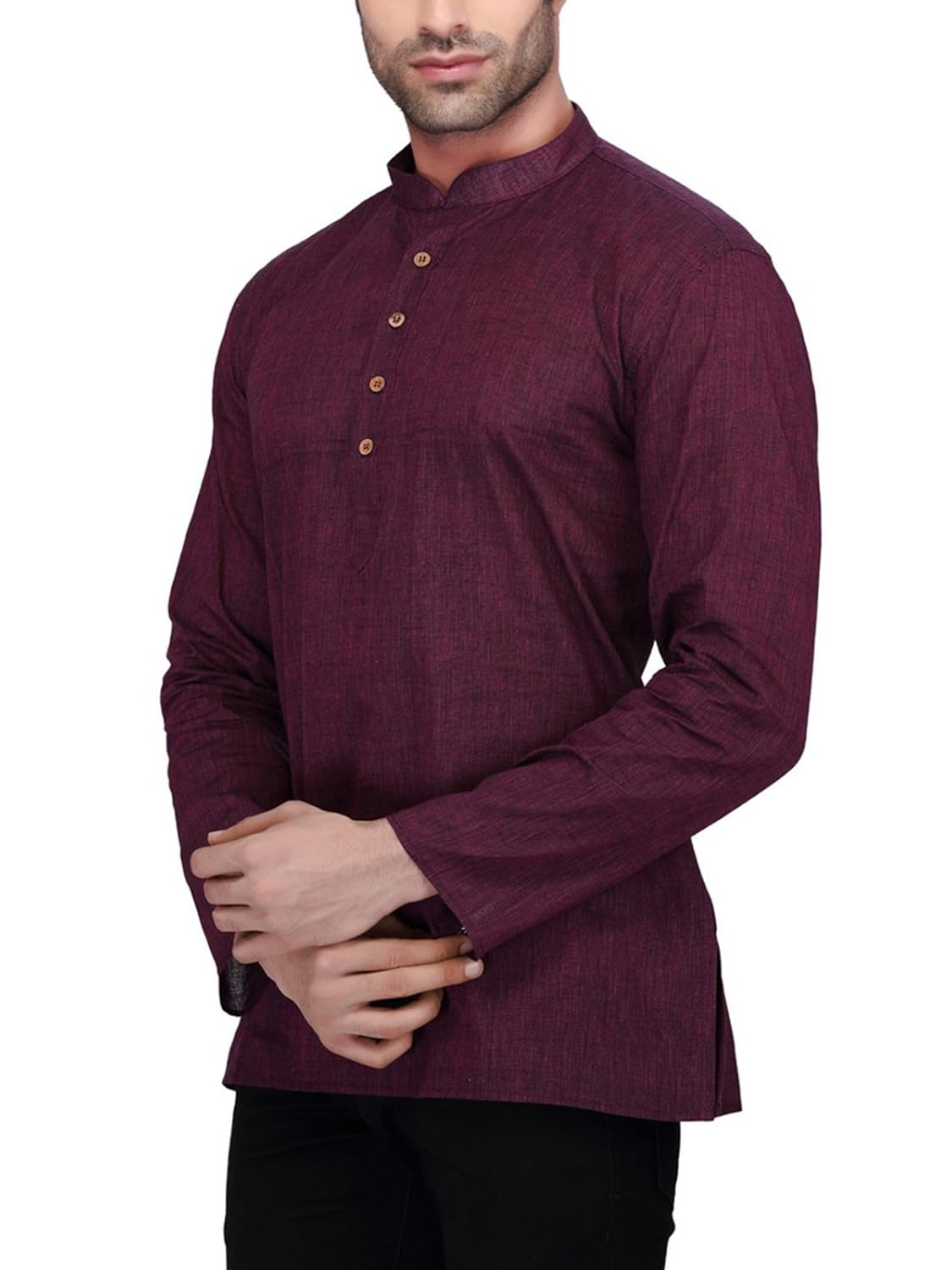 Maroon colour short handloom cotton kurta which gives a new and stylish look on this kurta and the roll up shirt cuff kurta can be worn on jeans and trousers for cool look for any party wear (Only Kurta) |