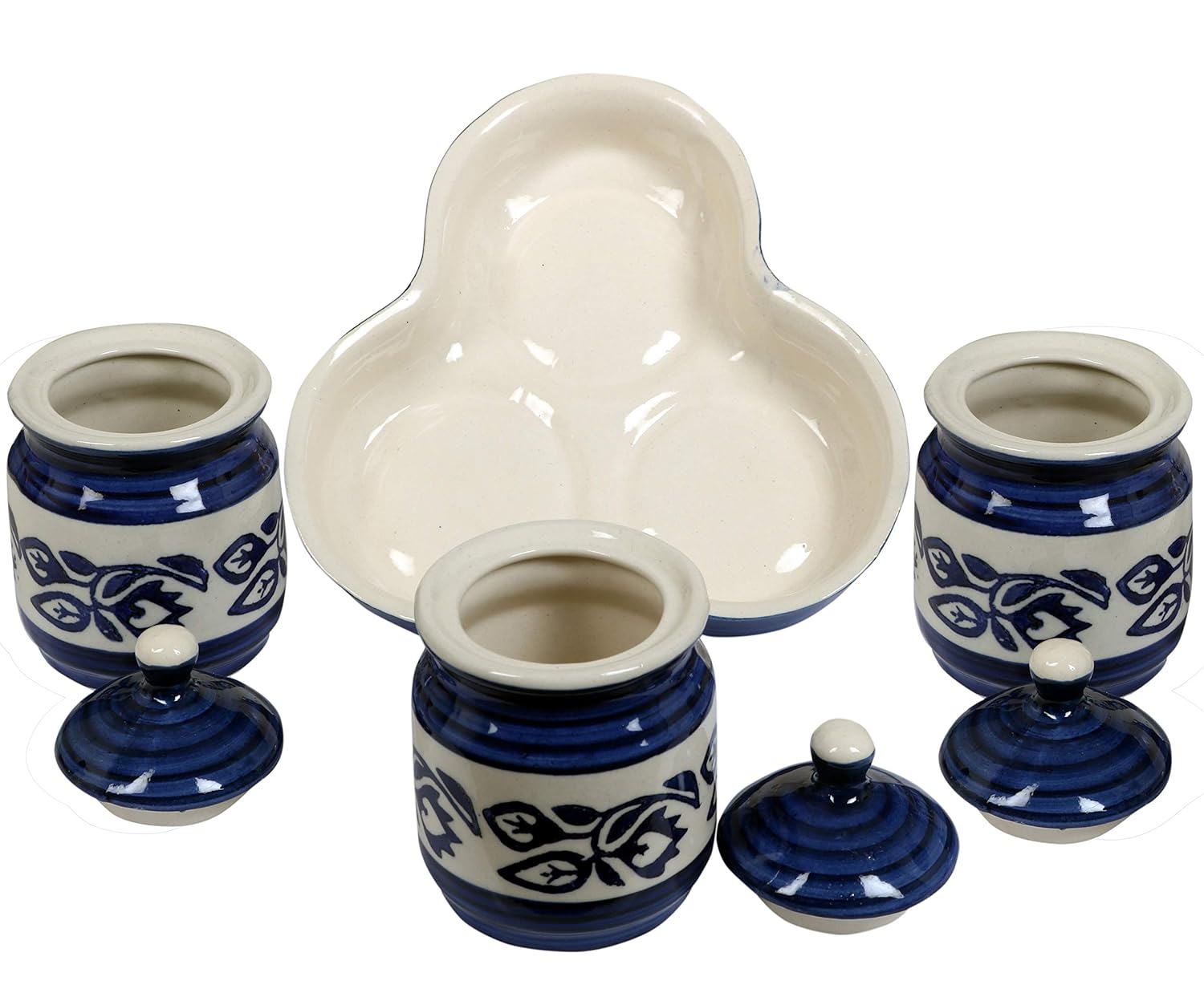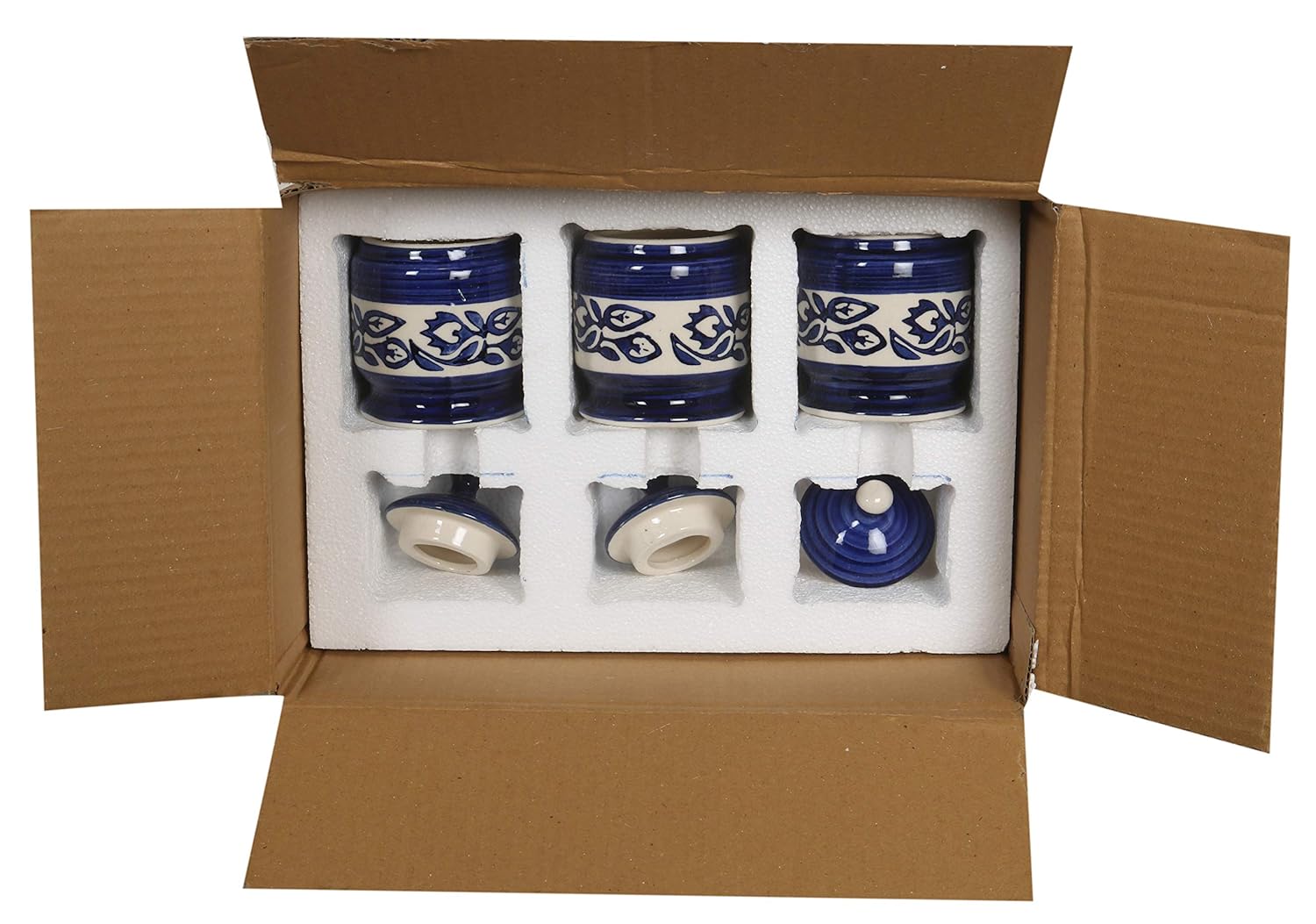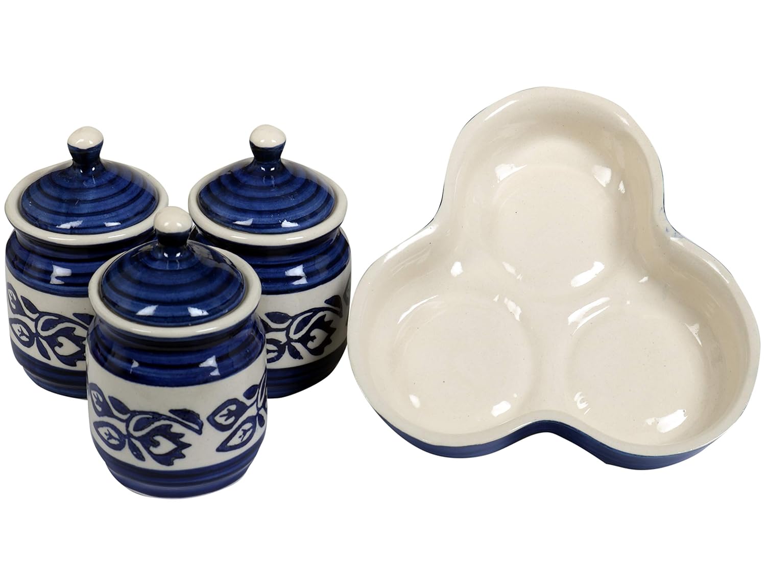 COMPLETE SET: This earthenware canister set includes three containers, fitted see-through lids and stainless treay.