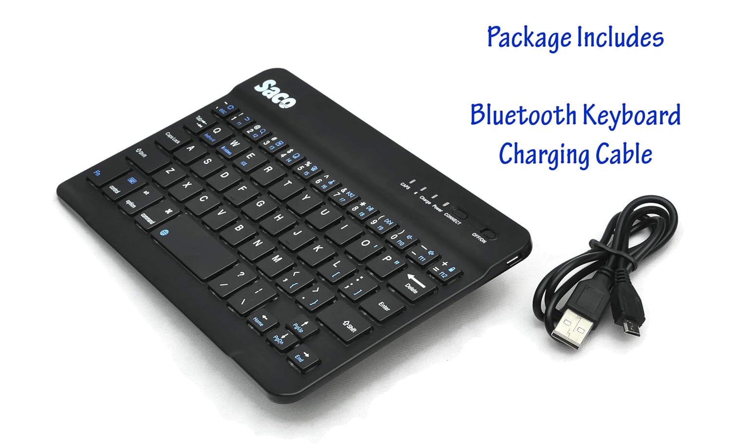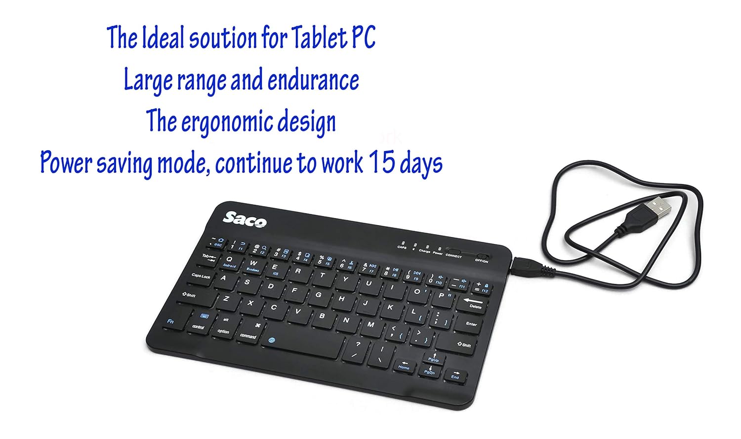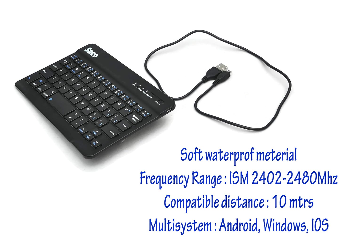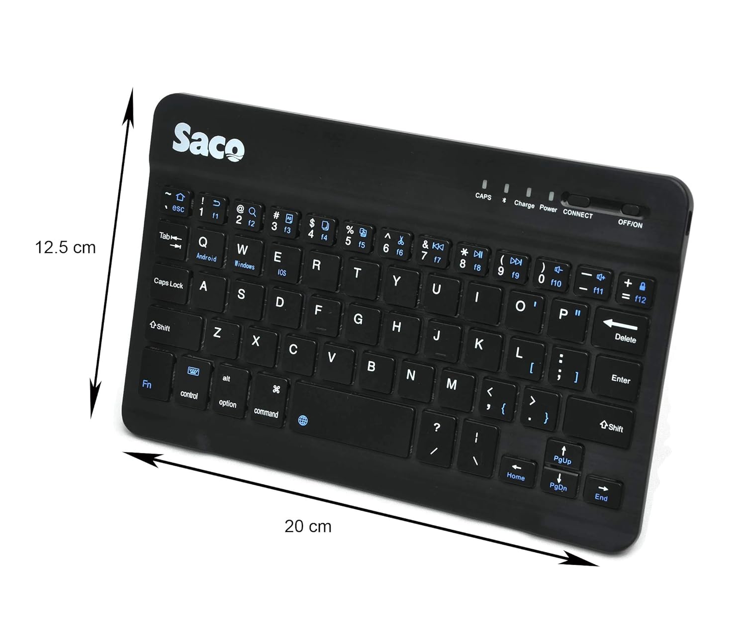 The Saco Bluetooth keyboard specifically designed for smart Phones and Tablets. Saco all in one Bluetooth keyboard is an ultra compact and light-weight device chiclet keys help easy typing. It works equally well with Android, iOS Mac and windows operating devices. On or off switch on the keyboard helps you in conserving power when the keyboard is not in use. There is also a charging indicator light on the keyboard for charging notification. Saco mobileBluetoothkeyboard adapts to latest versionof Bluetooth V3.0. it worksup-to10 meters. thisBluetoothkeyboard has lithiumpolymer battery ( Capacity 350MAH) for long time backup.you cancontinueto work15 days with battery backup. DetachableUSB Charger cable attachedwith box. |