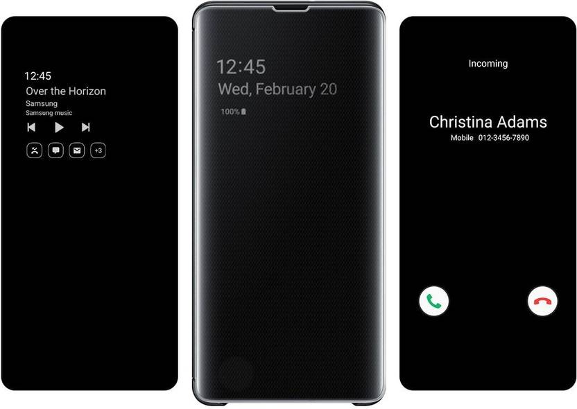 Dedicated to your convenience nswer your phone and control your music without actually touching your phone. The dedicated Clear View UX enables you to see notifications at a glance or pause your playlist without flipping the cover open. Lighter and greater comfort The Clear View Cover is designed to be ultra slim and light, so it enhances the comfortable grip of the Galaxy S10+, and doesn’t add bulk. And the front cover is patterned to prevent screen-blocking reflections.All-rounded protection Slip your phone into this case for durable defense against bumps and falls. It surrounds both the front and the back of your Galaxy S10+, protecting your Galaxy S10+ from both sides |