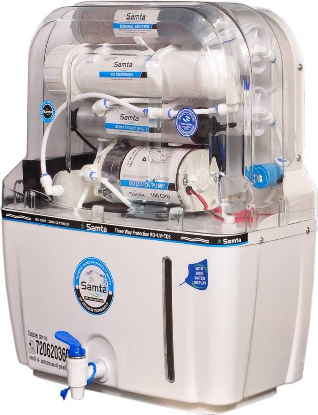 SAMTA company design water purifier for all type of water such as hard , sea water , pound extra .Now this model come with modern technics RO+UV+UF filtration . Reverse Osmosis (GENUINE VOLTRON 75) - RO full form is Reverse Osmosis. In RO water purifier, it passes water through the pump to increase water pressure then pass that pressured water through RO membrane(semi permeable). During this process dissolved solids and TDS present in water are eliminated. RO water purifier converts hard water to soft water. The disadvantage of RO water purifier is it produce a lot of waste water Ultra Radiation (PHILIPS)- 100% geniune UV Lamp by Philips 11W lamp.UV water purifier uses UV radiations to kill contaminants, microorganisms. Treating water passes through the UV radiation source tube and exposes water to UV radiation. UV water purifier is advisable to use with soft water which has contaminants. Ultra Filtration( MADE IN KOREA)- UF full form is Ultra filtration. UF water purifier contain hollow fiber threaded membrane. UF removes dispersed material, suspended solids, and other large molecular weight materials from water which are harmful to human health. TDS ADJUSTER- help to maintain water tds. 8’’MINERAL BOOSTER- comes with 8'' mineral booster with 5 level ( silver integrated active carbon , antibacterial balls , FRI balls ,taste inhancer balls,Mg,Ca, ). They retains mineral in drinking water This Water Purifier For Indian Kitchen For Pure & Safe Drink Of Water .This Product Come With 75 GPD Membrane & 100 GPD Booster Pump Both Are Import. RO + UV +TDS +UF (Japanese Technology) Made Every Drop of Water Pure & Mineral. Product Made By Food Grade Plastic for Better for Health. Tank Capacity of Product 15L. Product Operative At Electricity 220v/50Hz. Purifier Give Better & Long Life at Corporation Water. Purifier Reduce 90% TDS from Raw Water I.E If Customer Raw Water TDS 1050 Then After Purification Customer Get 20-50 TDS in Drinking Water. SAMTA Provide Installation at Major City across India