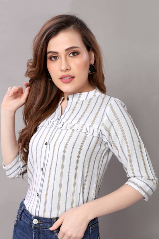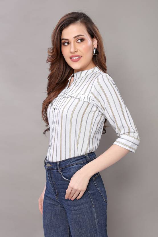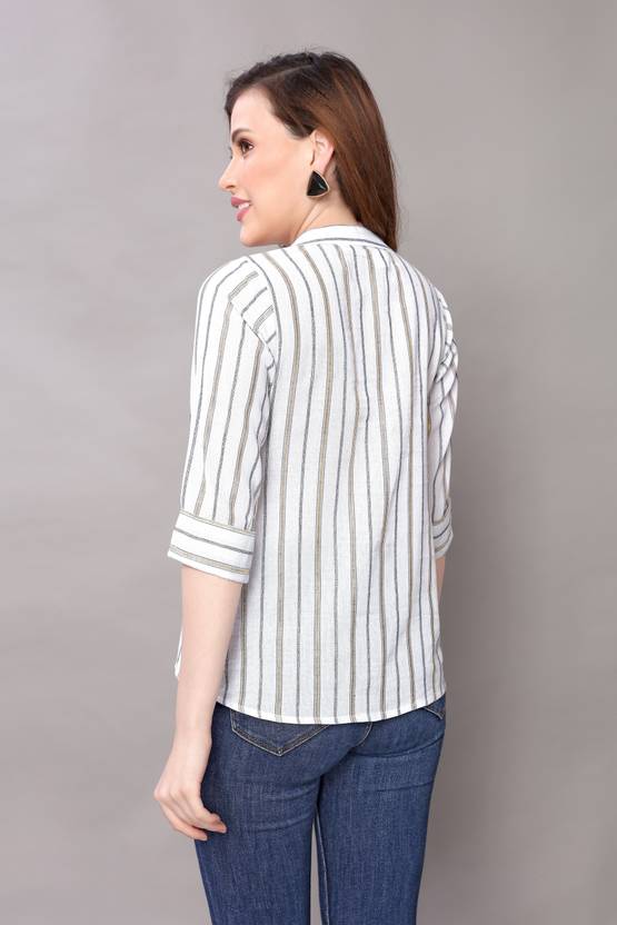 Off White Color Striped Woven Printed Cotton Flex Shirt With Mandarin Collor and 3/4 Sleeve