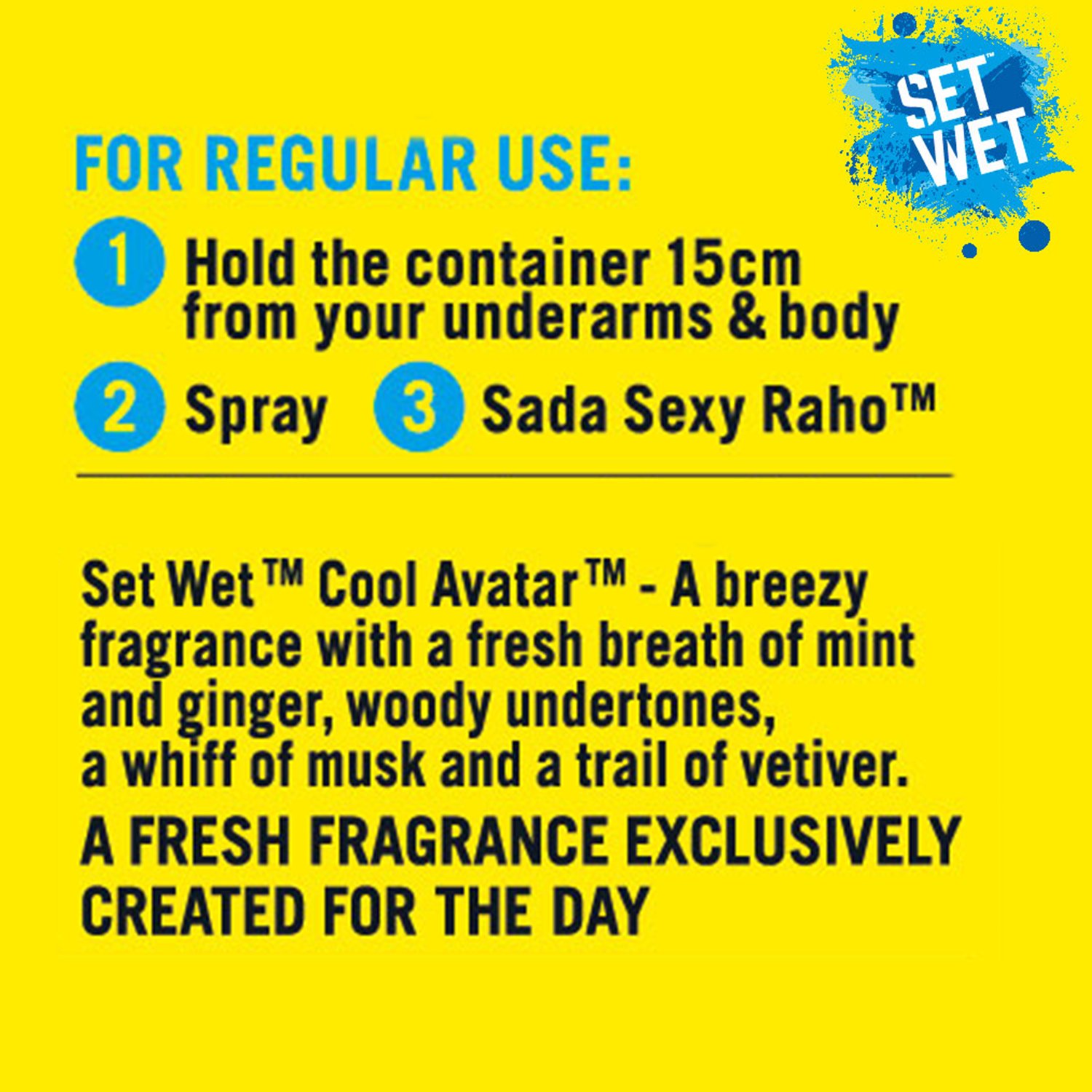 Set wet cool avatar deo: a breezy fragrance with a fresh breath of mint and ginger, woody under tones, a whiff of musk and a trail of vetiver