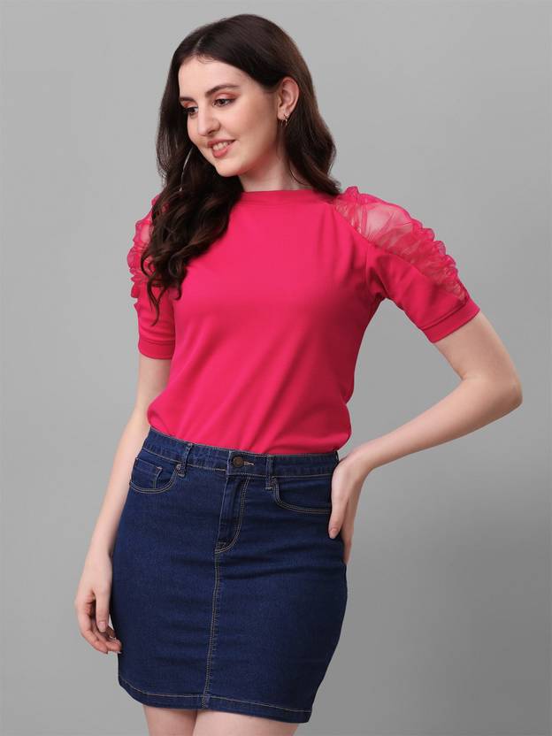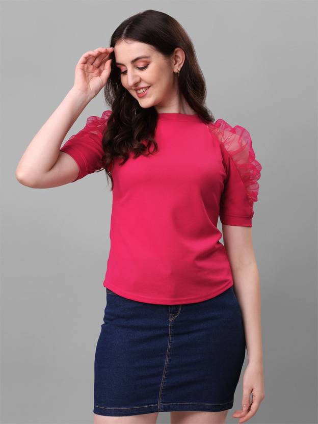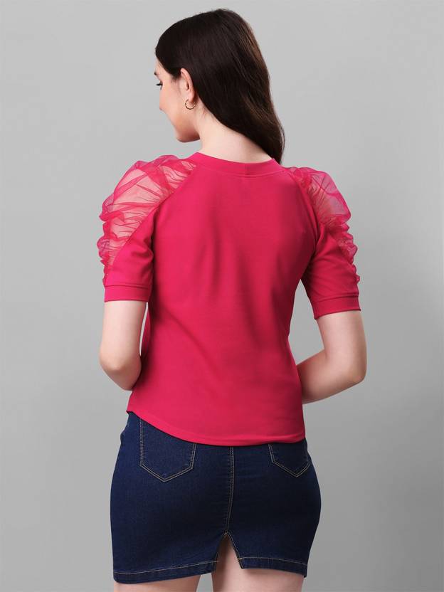 Perky and bright, update your summer closet with this hot pink top. Tailored in very classy way, it features ruched net sleeves and a high neck.