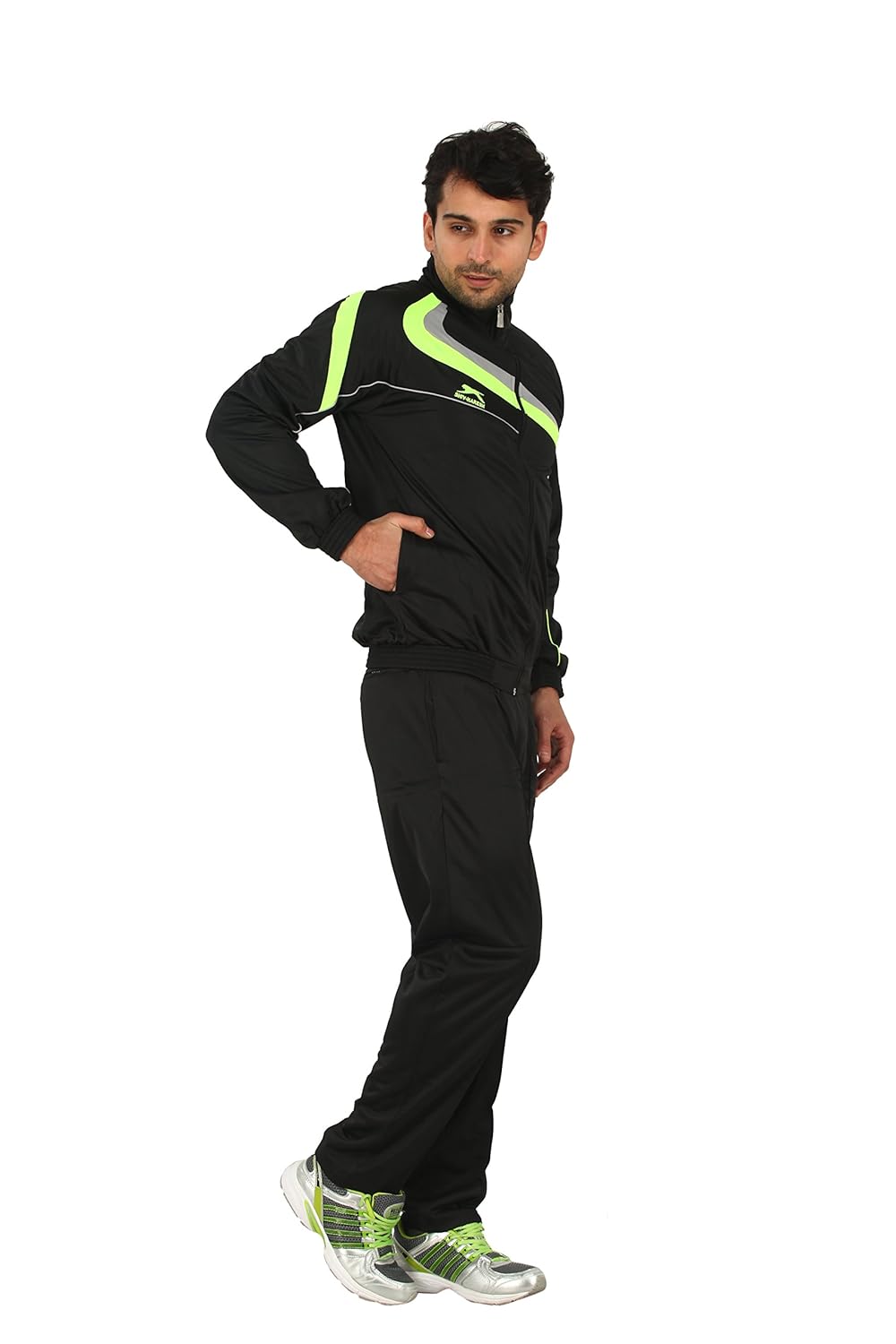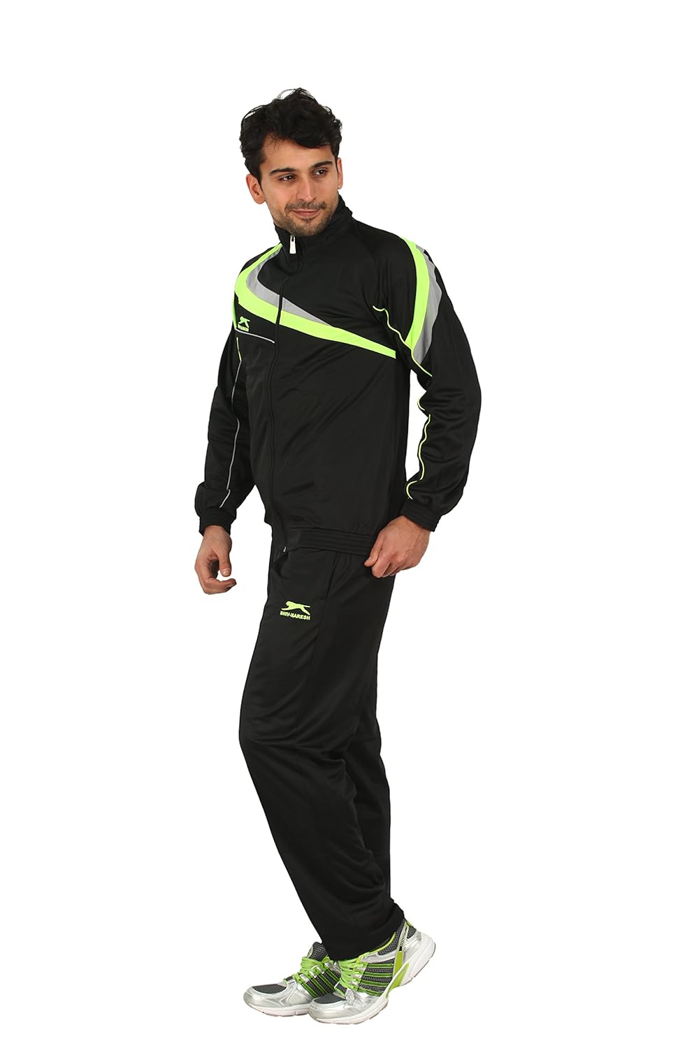 Promising optimum moisture management with minimal chafing because of the polyester fabric, this black tracksuit from Shiv Naresh is a perfect addition to your winter athletic routine. Flaunting Asian Games-inspired design on the track jacket for bold style, it is finished with a zippered front for customised ventilation. Pair it with sports shoes. |