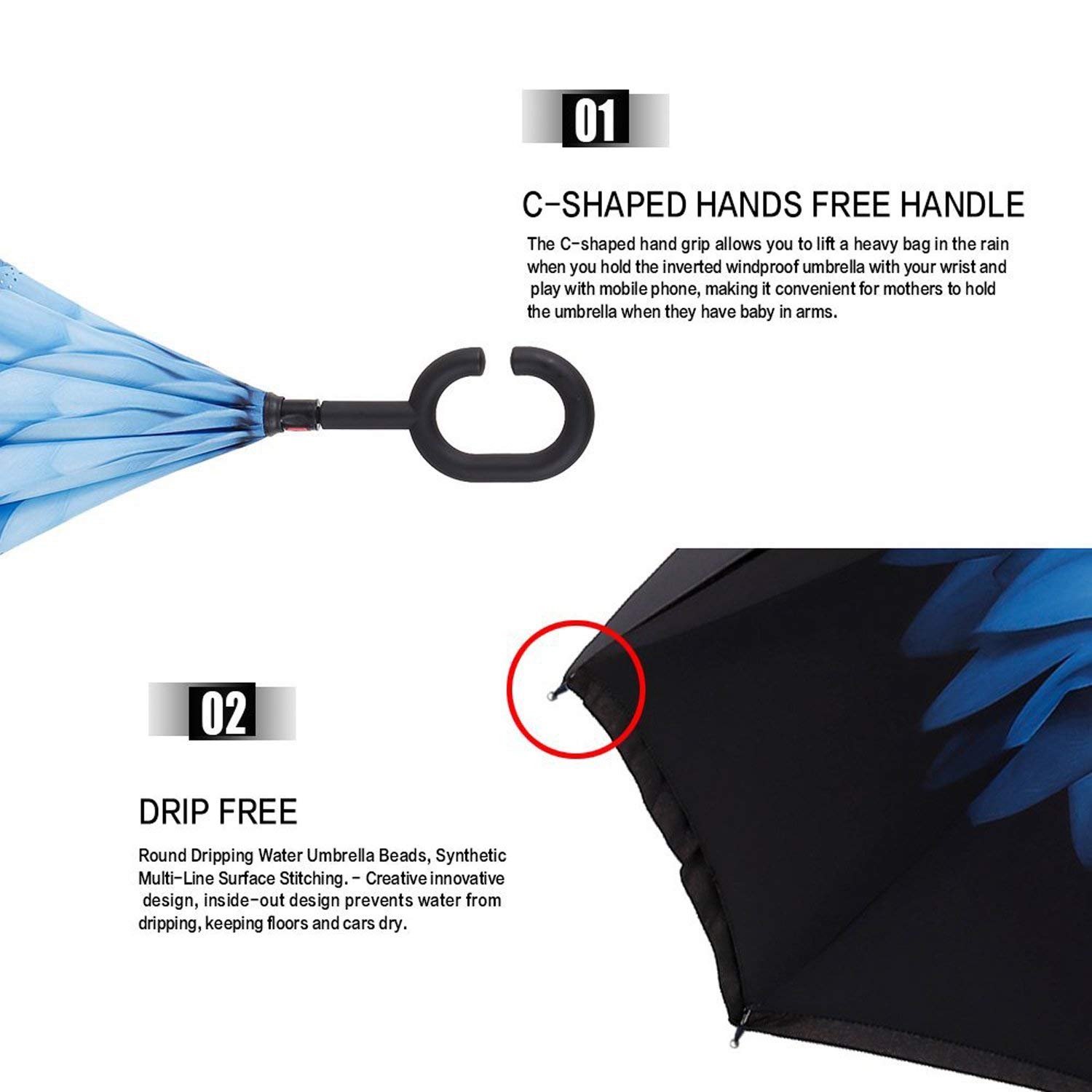 Superior performance – this exclusive inverted umbrella with durability design, versatility and comfort. We made this umbrella from high quality carbon fiber material, which is durable and corrosion resistant. The double umbrella cover is designed to protect against UV rays and other harmful sunlight.