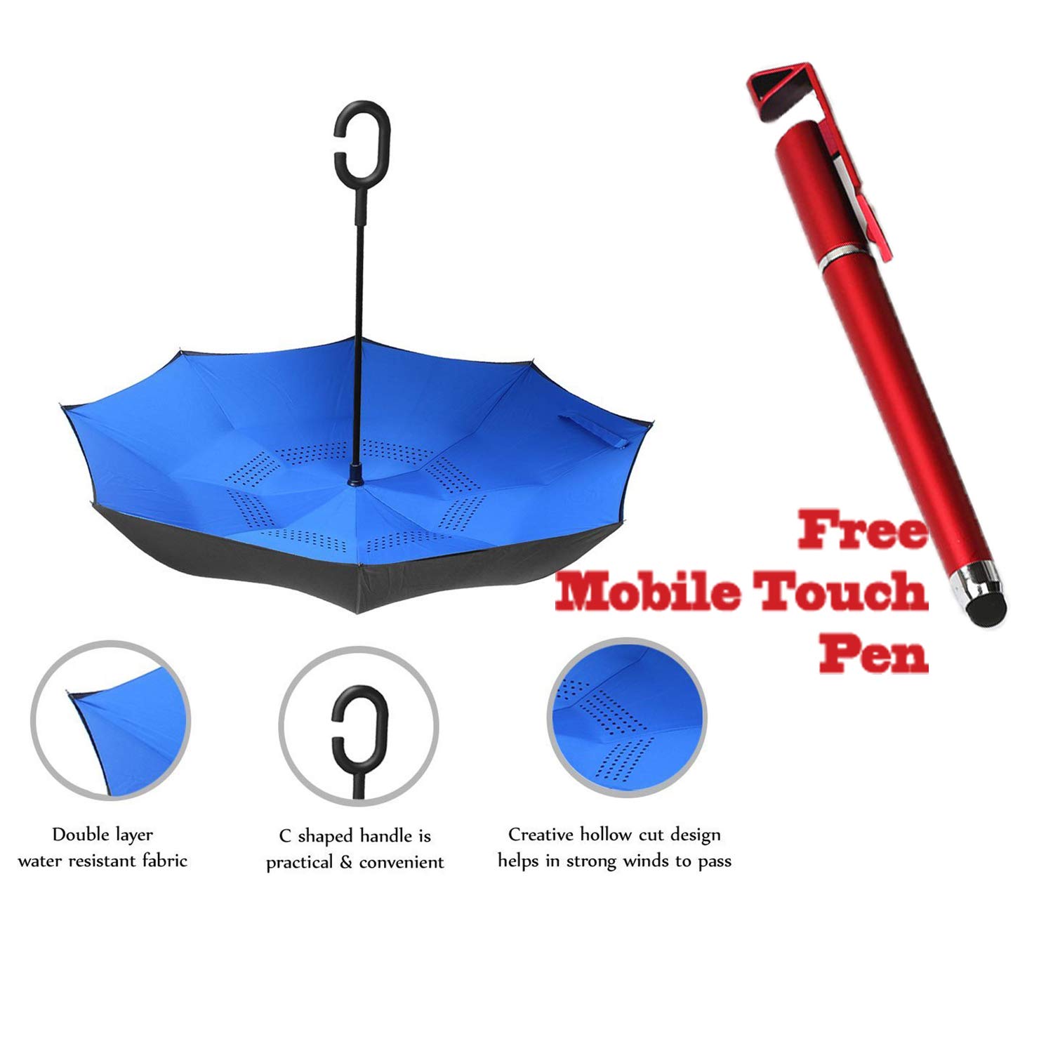 Shoppozone Double Layer Inverted Reversible No Drip Umbrella with C Shape Handle - Multi Color (Royal Blue) with Free Gift Mobile Touch Pen