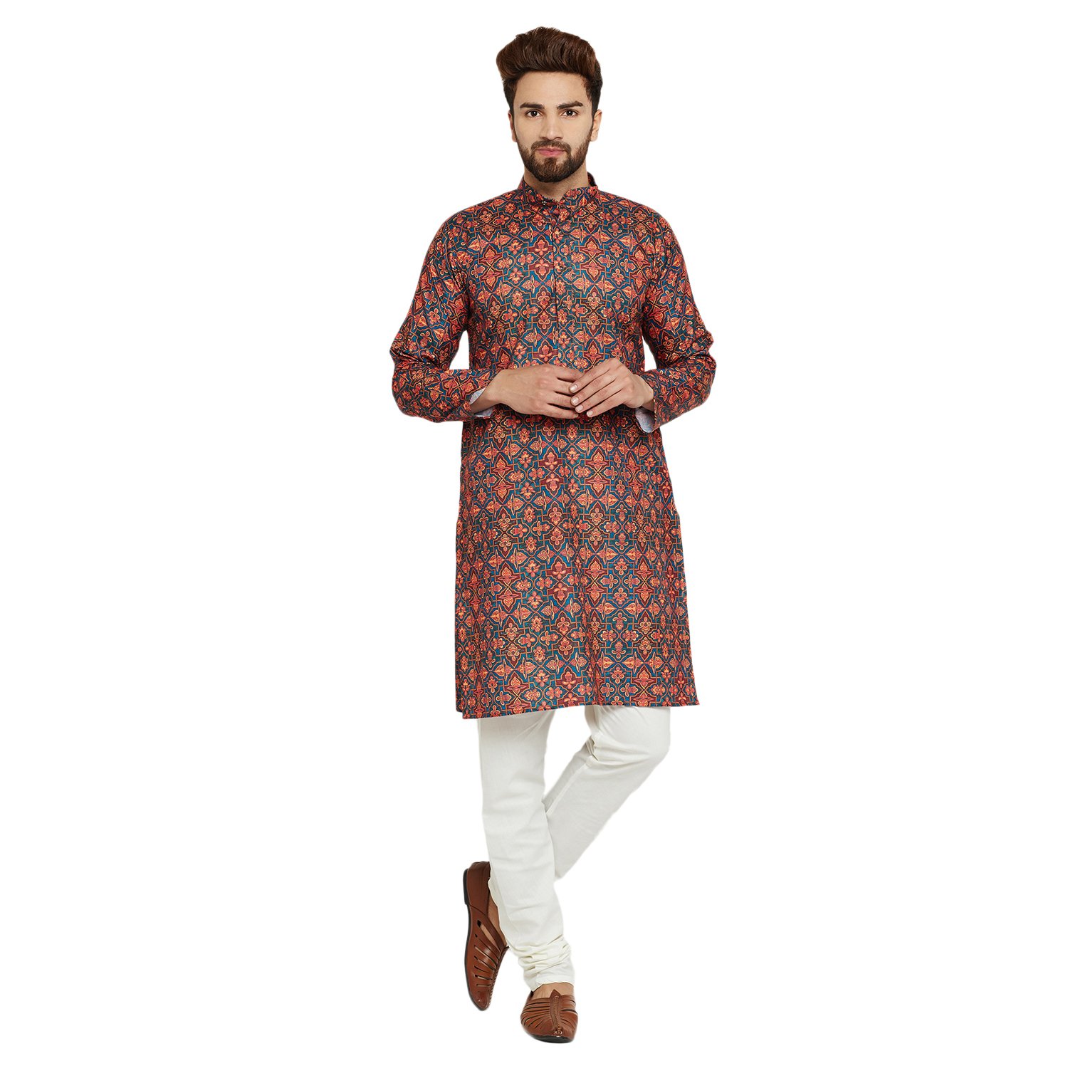 Look your ethnic best wearing this Multicolored Kurta Pajama set. Made of cotton, this regular-fit kurta pajama set comprises a full-sleeved multicolored kurta with smart digital print on it and Off-White churidaar pajamas. Team this outfit with mojris and look apart on special occasions. |