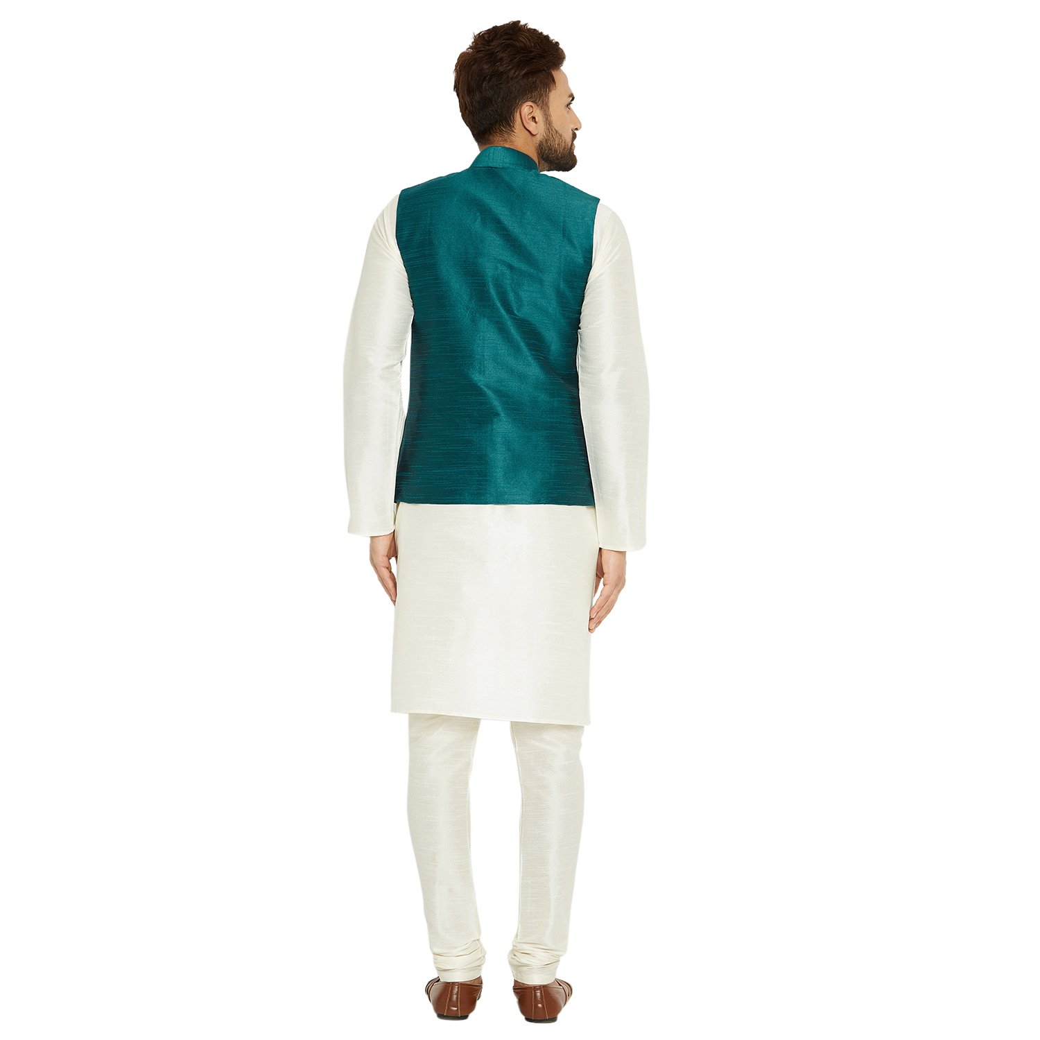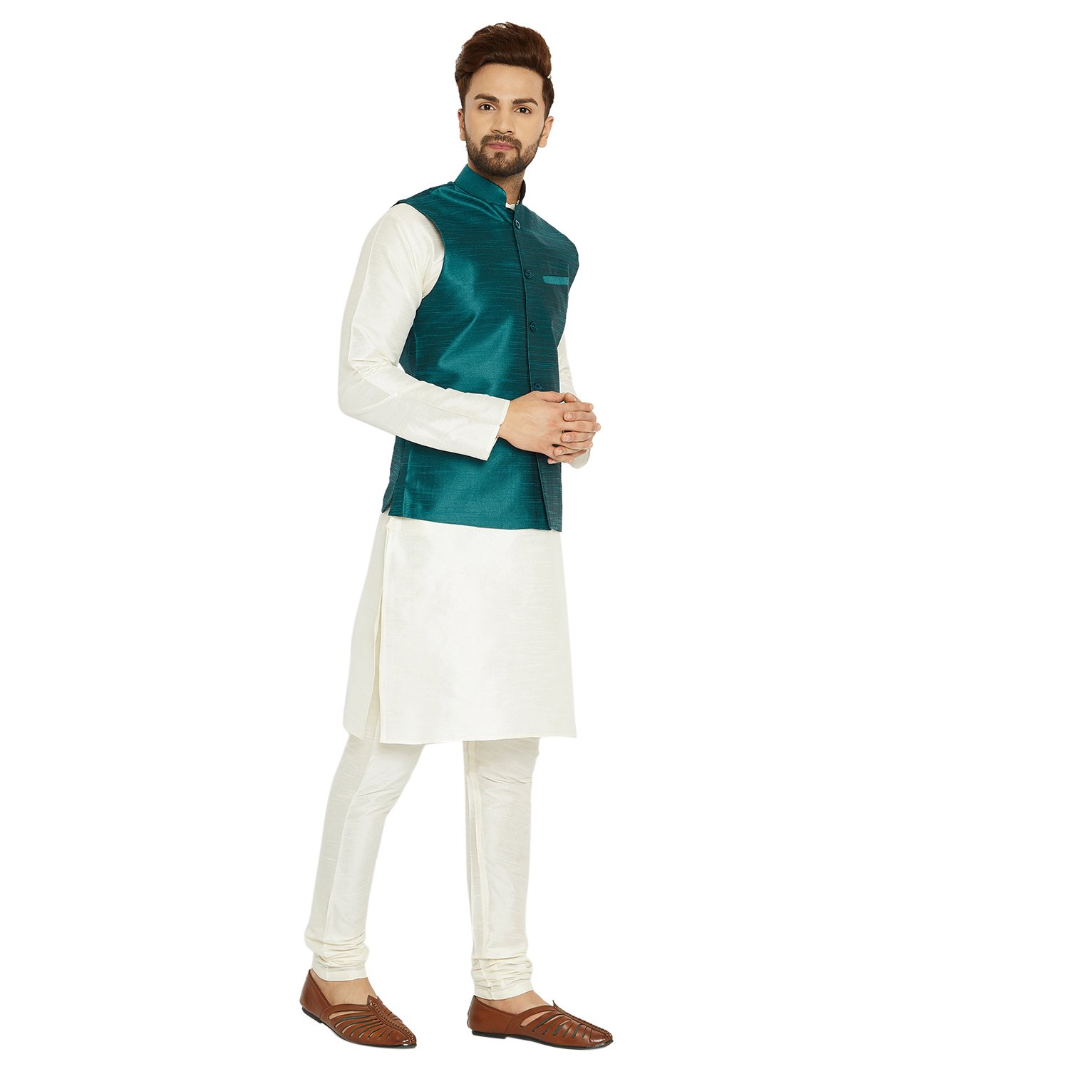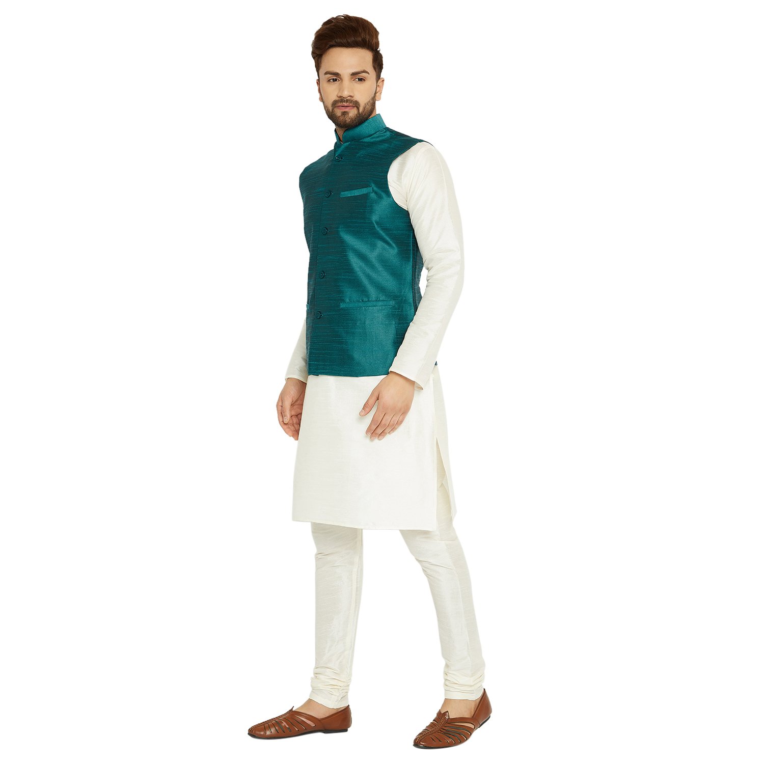 SOJANYA as a brand brings you quality and affordability. In market since 1958, we take pride in our commitment to maintain quality standards in each piece manufactured by us. A true epitome of class, this kurta Pyjama and Nehru Jacket Combo will surely reflect your impeccable taste in fashion. Made from banarsi dupion silk fabric, this set will surely make you the cynosure of all eyes. Team this Kurta Pyjama Nehru jacket set with a pair of mojris or kolhapuri chappals to give a classy touch to your ethnic look. The Kurta Pyjama is made of Cream Color Dupion Silk fabric. Nehru Jacket is made up of Green Color Dupion Silk. |