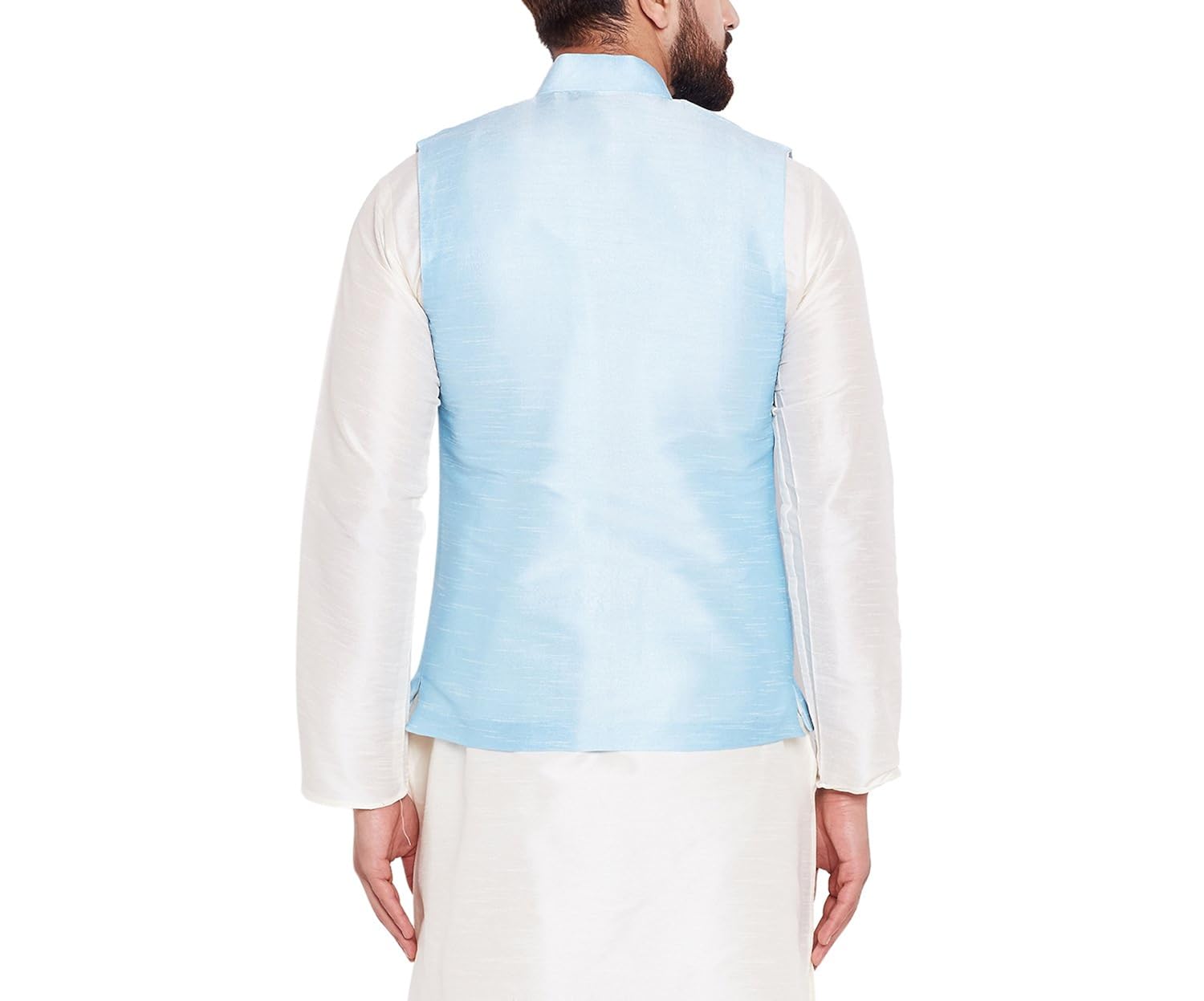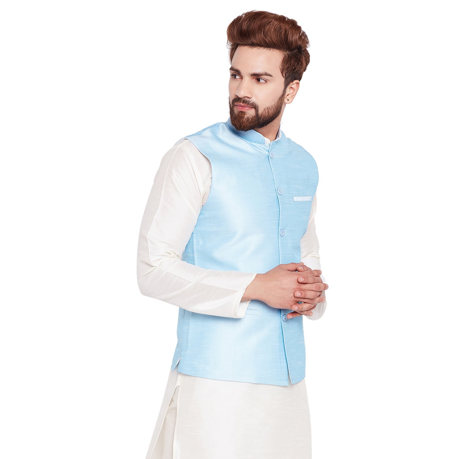 SOJANYA as a brand brings you quality and affordability. In market since 1958, we take pride in our commitment to maintain quality standards in each piece manufactured by us. A true epitome of class, this kurta Pyjama and Nehru Jacket Combo will surely reflect your impeccable taste in fashion. Made from banarsi dupion silk fabric, this set will surely make you the cynosure of all eyes. Team this Kurta Pyjama Nehru jacket set with a pair of mojris or kolhapuri chappals to give a classy touch to your ethnic look. The Kurta Pyjama is made of Cream Color Dupion Silk fabric and With Turquoise Blue Color Dupion Silk Nehru Jacket Set. |