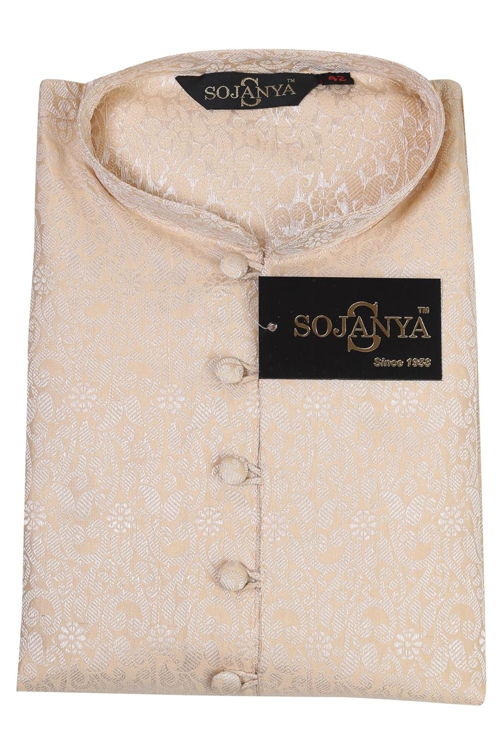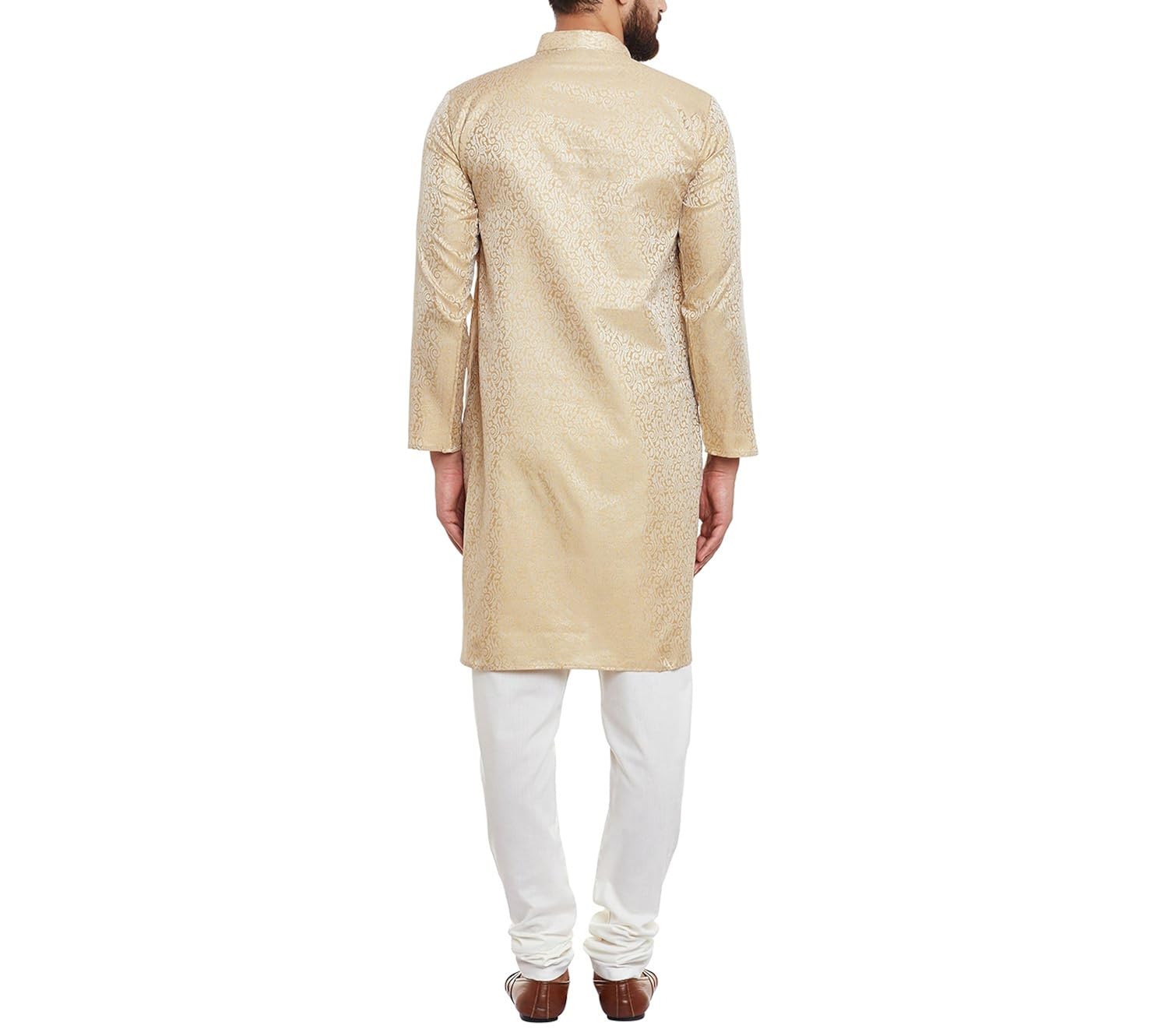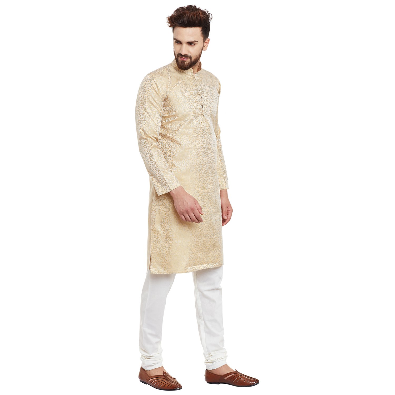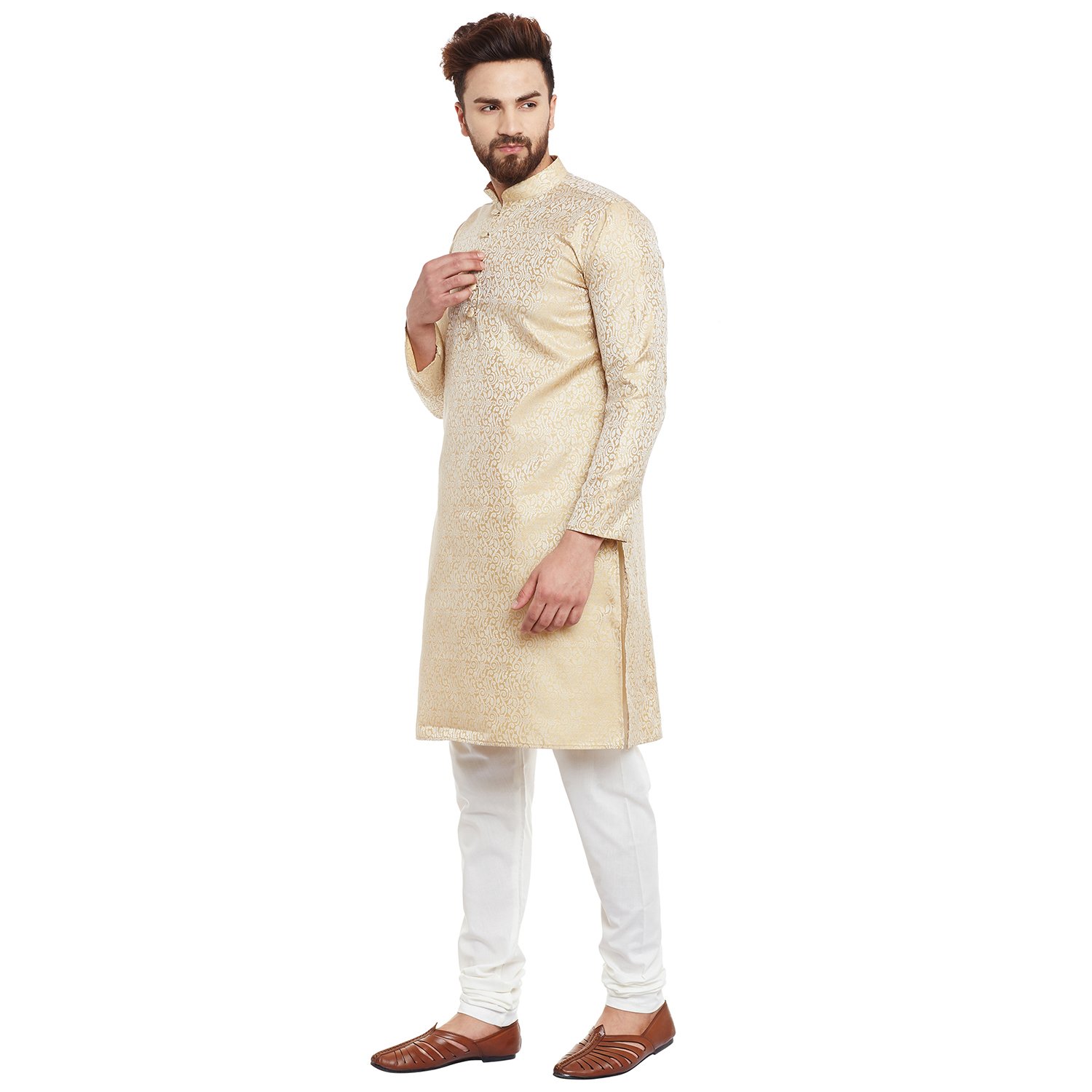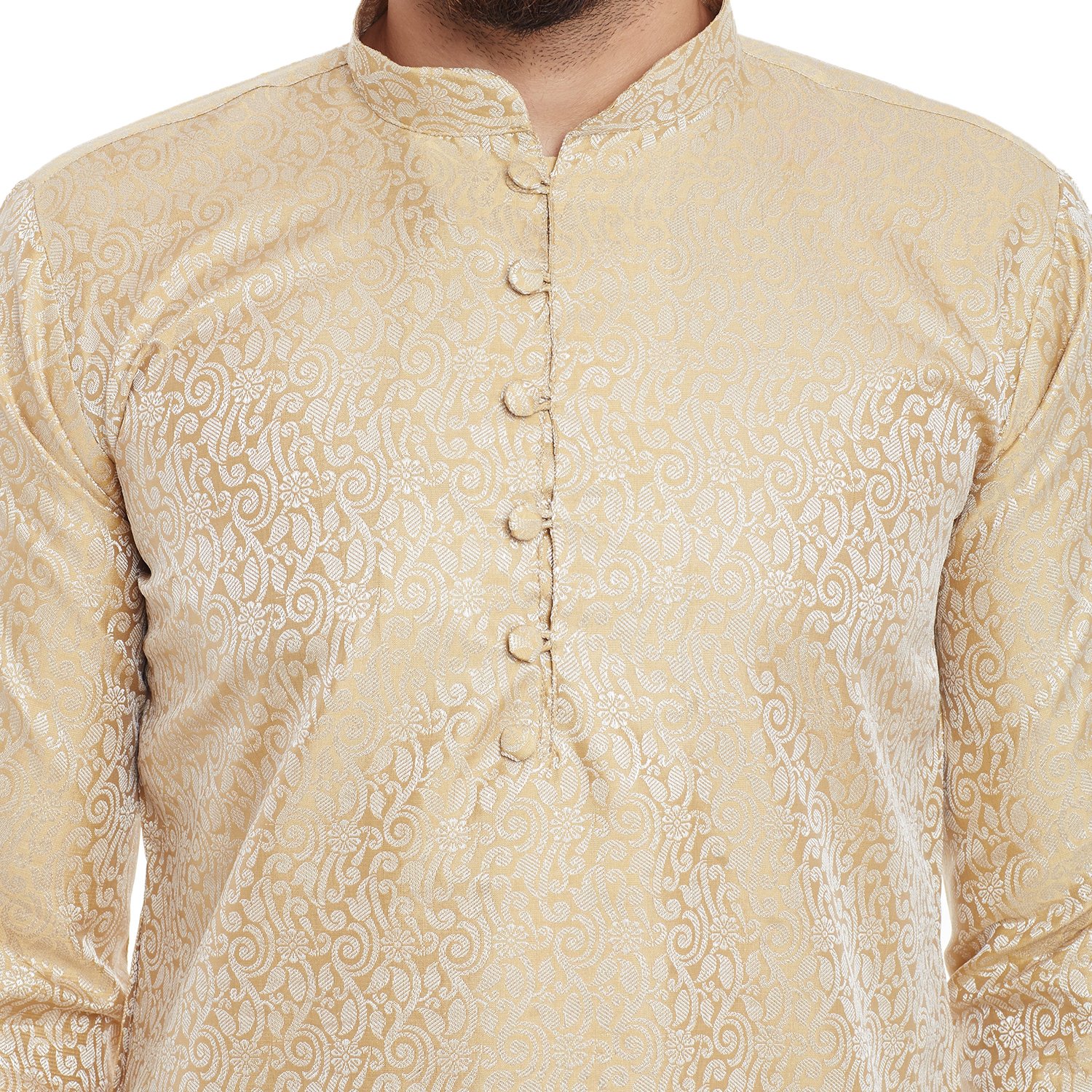 SOJANYA as a brand brings you quality and affordability. In market since 1958, we take pride in our commitment to maintain quality standards in each piece manufactured by us. Look your ethnic best wearing this Gold kurta and White pyjama . Made of cotton silk, this regular-fit kurta pyjama set comprises a full-sleeved kurta with self floral motifs and pyjama. Team this outifit with mojris and look apart on special occasions. |