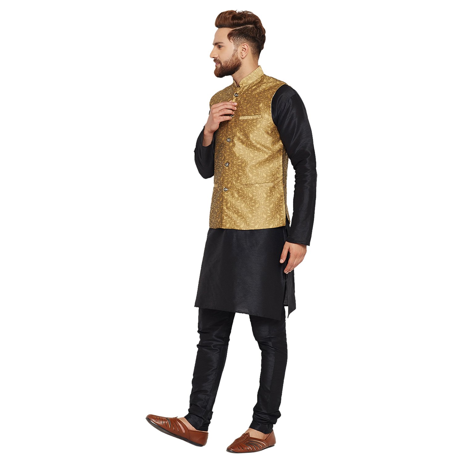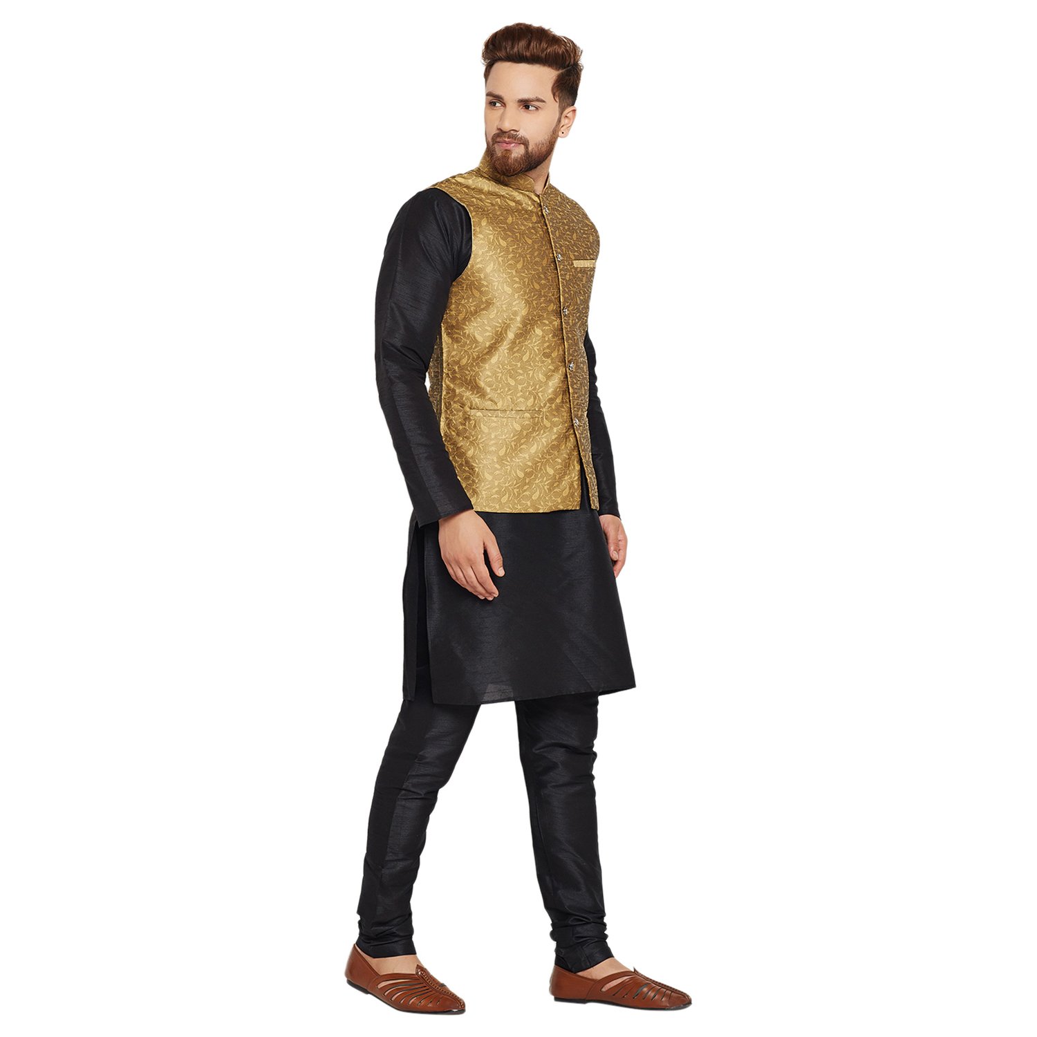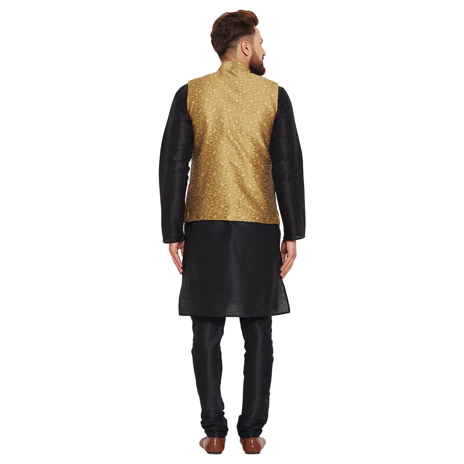 SOJANYA as a brand brings you quality and affordability. In market since 1958, we take pride in our commitment to maintain quality standards in each piece manufactured by us. A true epitome of class, this kurta Pyjama and Nehru Jacket Combo will surely reflect your impeccable taste in fashion. Made from banarsi dupion silk fabric, this set will surely make you the cynosure of all eyes. Team this Kurta Pyjama Nehru jacket set with a pair of mojris or kolhapuri chappals to give a classy touch to your ethnic look. The Kurta Pyjama is made of Black Color Dupion Silk fabric and With Gold Color Jacquard Nehru Jacket Set. |