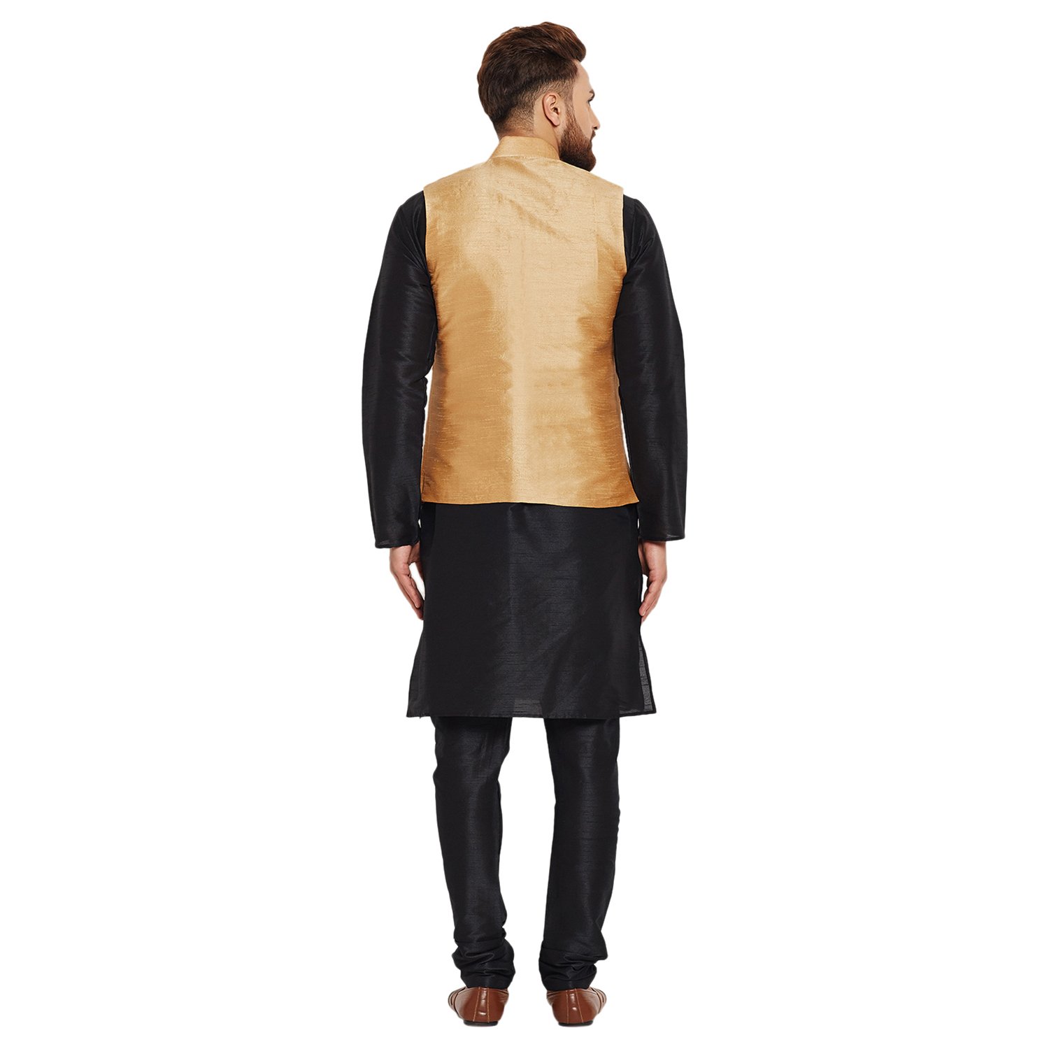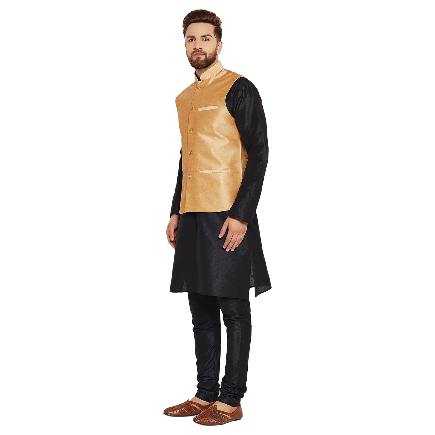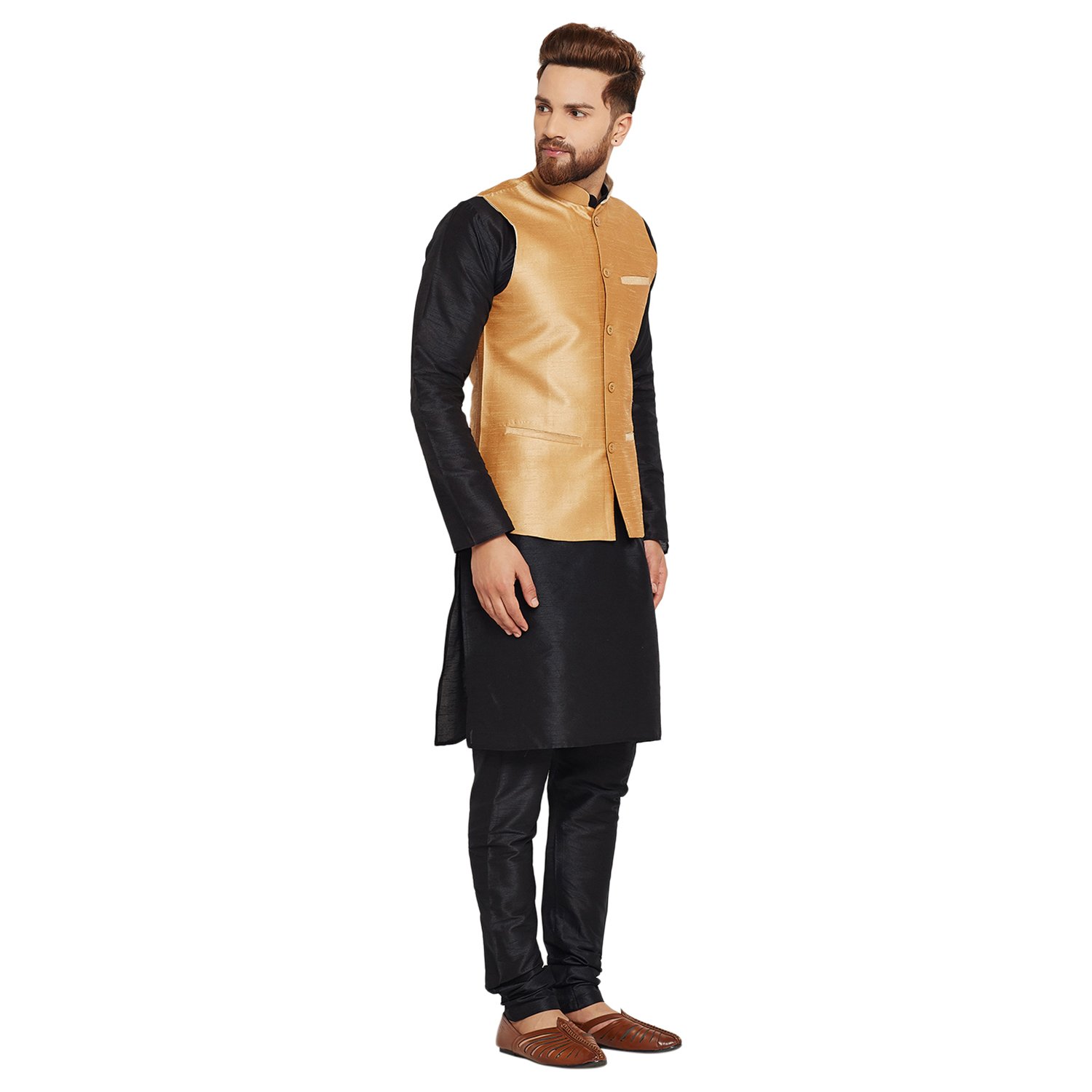 SOJANYA as a brand brings you quality and affordability. In market since 1958, we take pride in our commitment to maintain quality standards in each piece manufactured by us. A true epitome of class, this kurta Pyjama and Nehru Jacket Combo will surely reflect your impeccable taste in fashion. Made from banarsi dupion silk fabric, this set will surely make you the cynosure of all eyes. Team this Kurta Pyjama Nehru jacket set with a pair of mojris or kolhapuri chappals to give a classy touch to your ethnic look. The Kurta Pyjama is made of Black Color Dupion Silk fabric and With Gold Color Dupion Silk Nehru Jacket Set. |