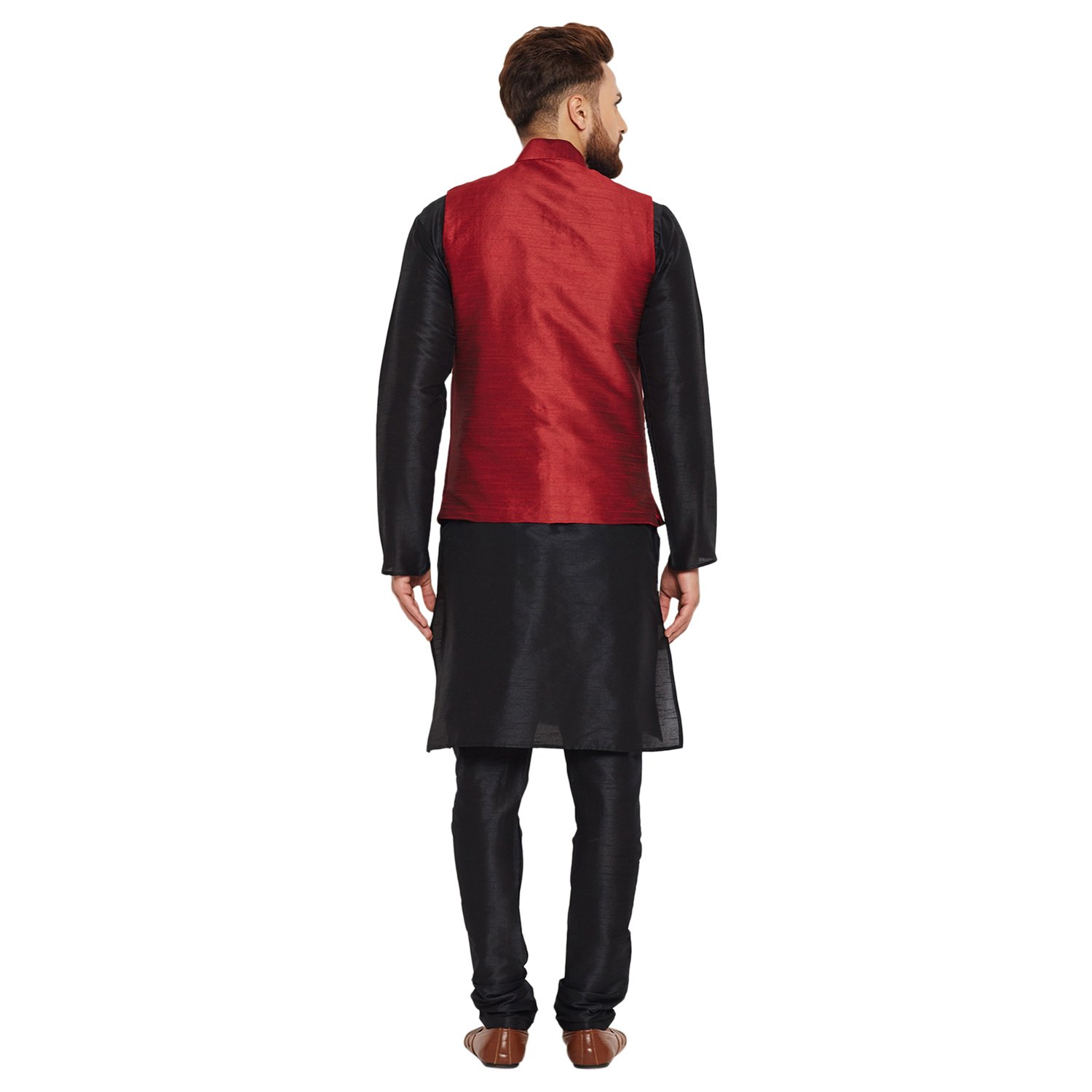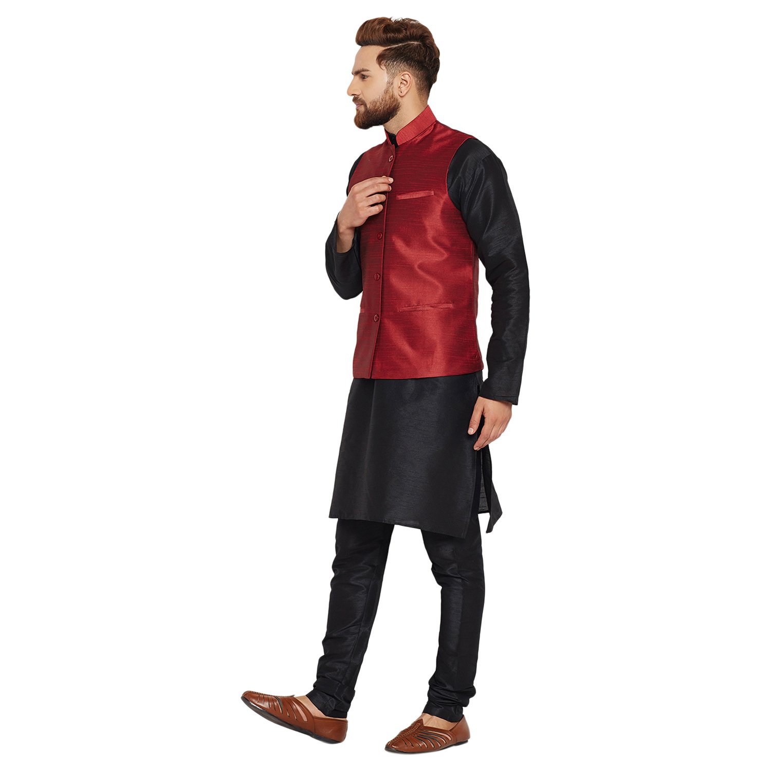 SOJANYA as a brand brings you quality and affordability. In market since 1958, we take pride in our commitment to maintain quality standards in each piece manufactured by us. A true epitome of class, this kurta Pyjama and Nehru Jacket Combo will surely reflect your impeccable taste in fashion. Made from banarsi dupion silk fabric, this set will surely make you the cynosure of all eyes. Team this Kurta Pyjama Nehru jacket set with a pair of mojris or kolhapuri chappals to give a classy touch to your ethnic look. The Kurta Pyjama is made of Black Color Dupion Silk fabric and With Maroon Color Dupion Silk Nehru Jacket Set. |
