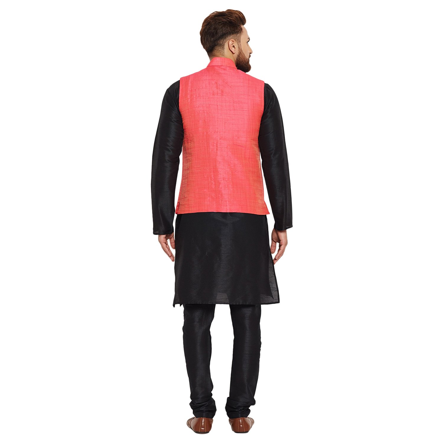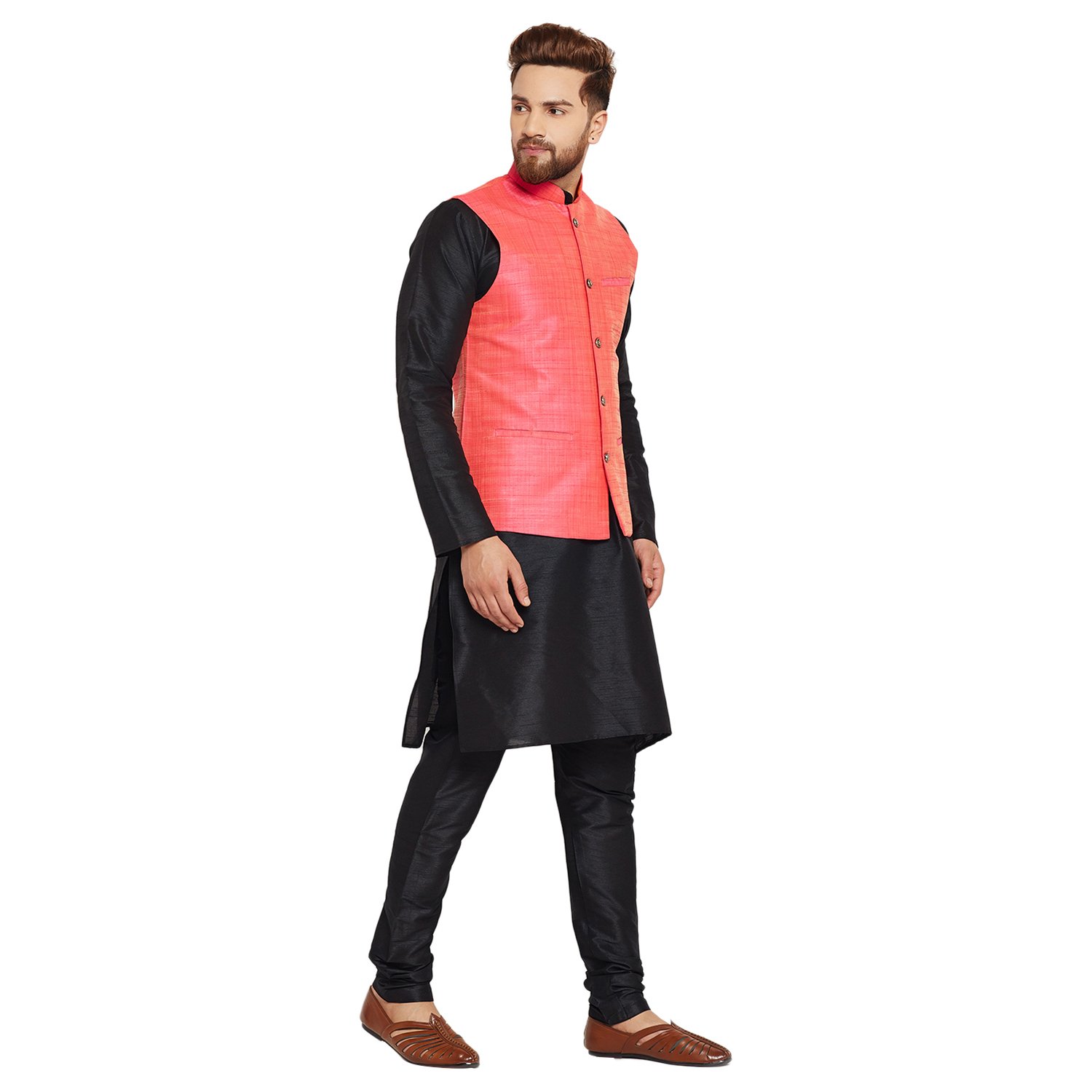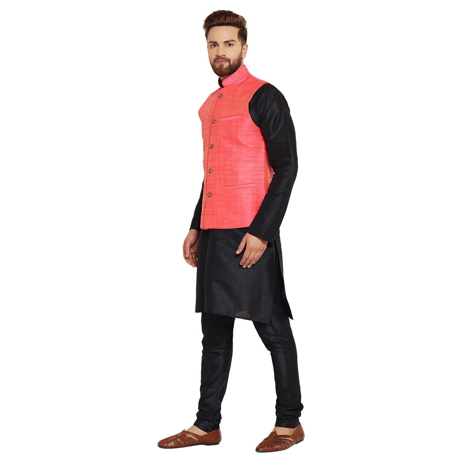 SOJANYA as a brand brings you quality and affordability. In market since 1958, we take pride in our commitment to maintain quality standards in each piece manufactured by us. A true epitome of class, this kurta Pyjama and Nehru Jacket Combo will surely reflect your impeccable taste in fashion. Made from banarsi dupion silk fabric, this set will surely make you the cynosure of all eyes. Team this Kurta Pyjama Nehru jacket set with a pair of mojris or kolhapuri chappals to give a classy touch to your ethnic look. The Kurta Pyjama is made of Black Color Dupion Silk fabric and With Pink Color Dupion Silk Nehru Jacket Set. |