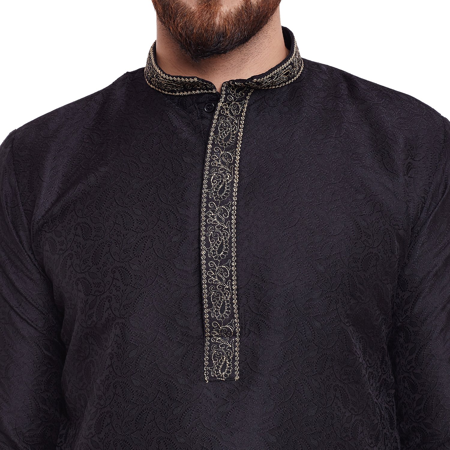 SOJANYA as a brand brings you quality and affordability. In market since 1958, we take pride in our commitment to maintain quality standards in each piece manufactured by us. Look your ethnic best wearing this Black kurta and White pyjama . Made of Jacquard silk, this regular-fit kurta pyjama set comprises a full-sleeved kurta with self design & embroidery on neck and a pajama. Team this outifit with mojris and look apart on special occasions. |