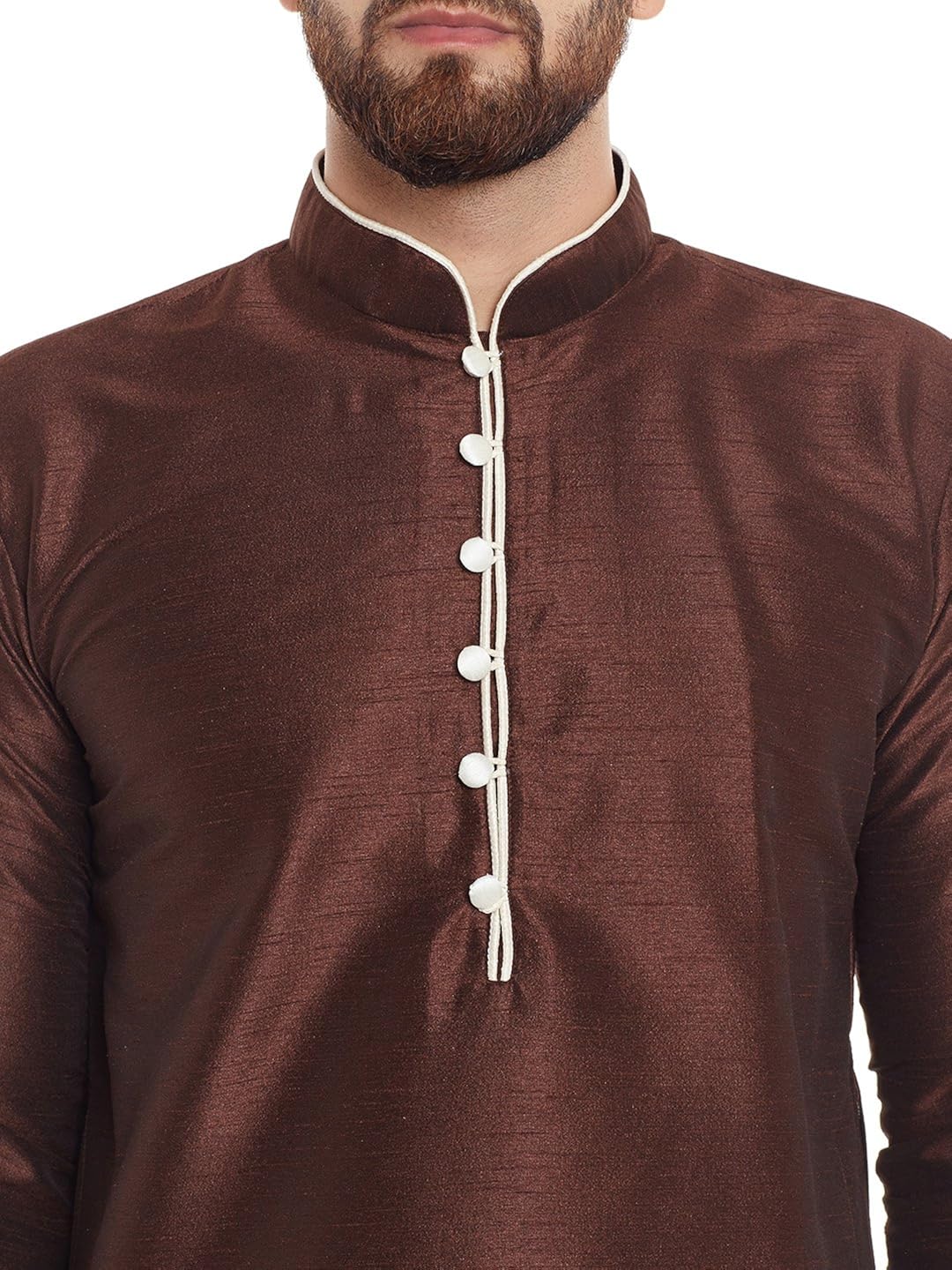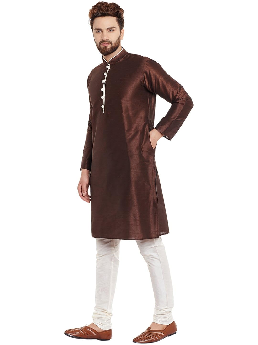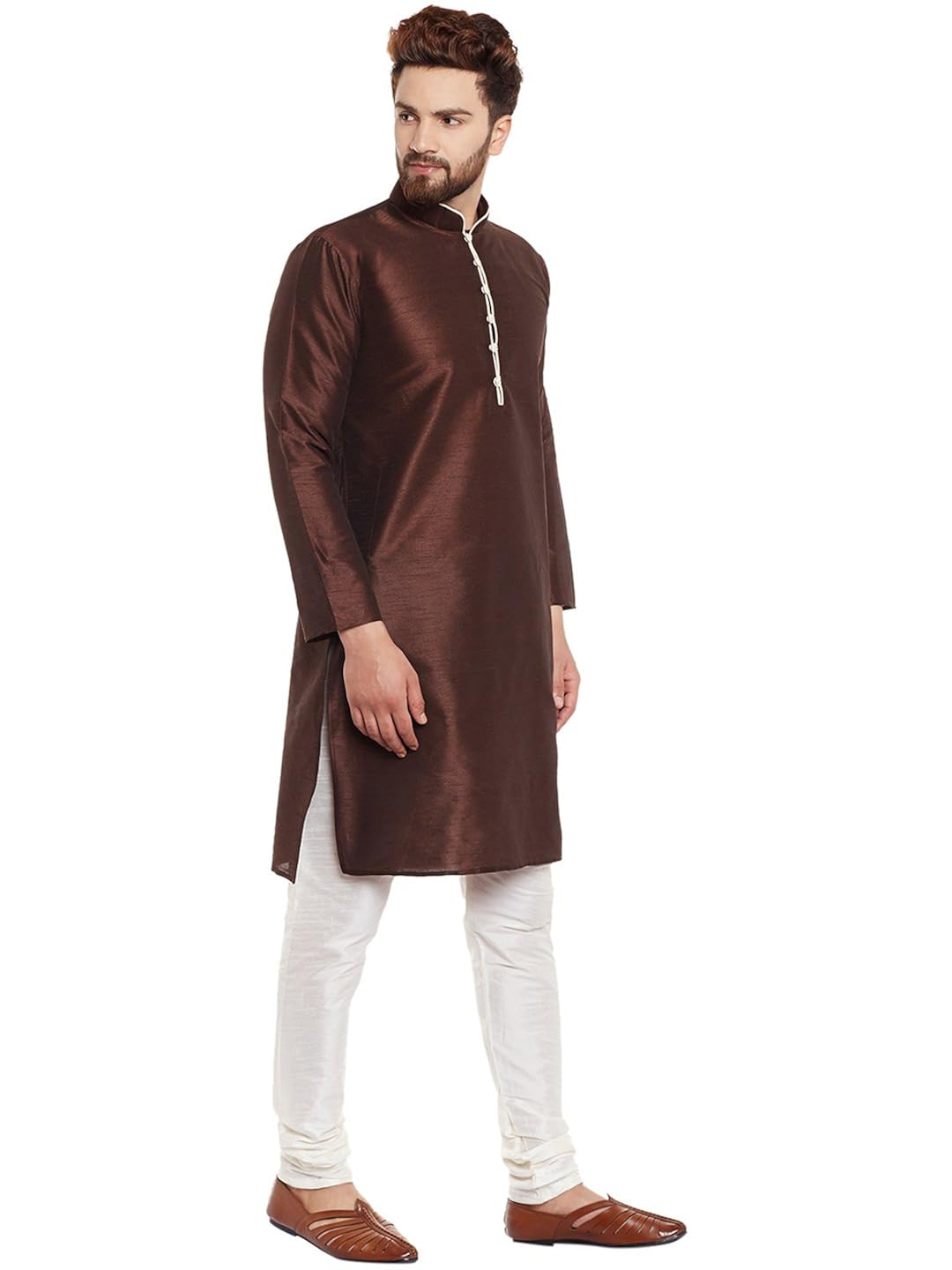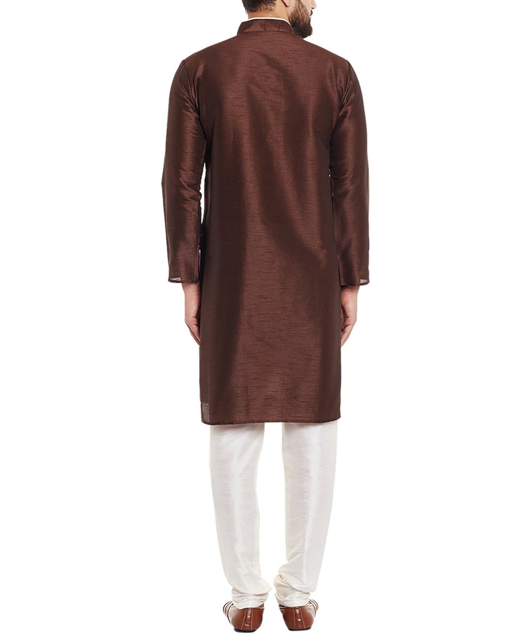 SOJANYA as a brand brings you quality and affordability. In market since 1958, we take pride in our commitment to maintain quality standards in each piece manufactured by us. Look your ethnic best wearing this Brown coloured kurta and Off-white pyjama set for men from the fashion house of Sojanya. Made from dupion silk, this regular-fit kurta pyjama set comprises a full-sleeved kurta and pyjama to complete your look. Team this outfit with embroidered mojris and rock the party that you attend. |